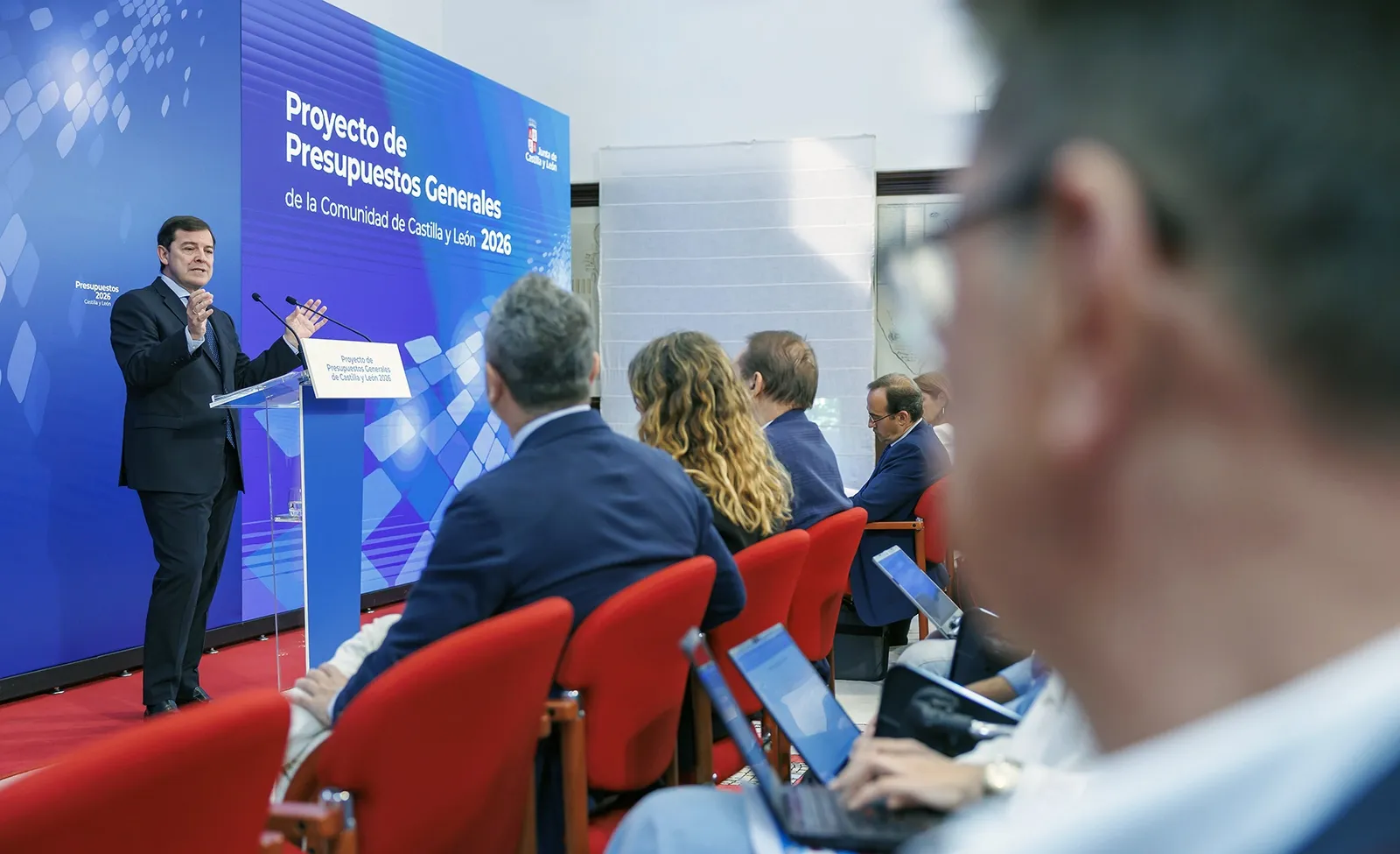 El presidente de la Junta, Alfonso Fernández Mañueco, acompañado por el consejero de Economía y Hacienda, Carlos Fernández Carriedo, ha presentado este martes el Proyecto de Ley de Presupuestos Generales de la Comunidad para 2026. Las cuentas ascienden a 15.715 millones de euros, lo que representa la cifra más alta en la historia de Castilla y León y un incremento del 7,92 % en comparación con el presupuesto vigente de 2024.