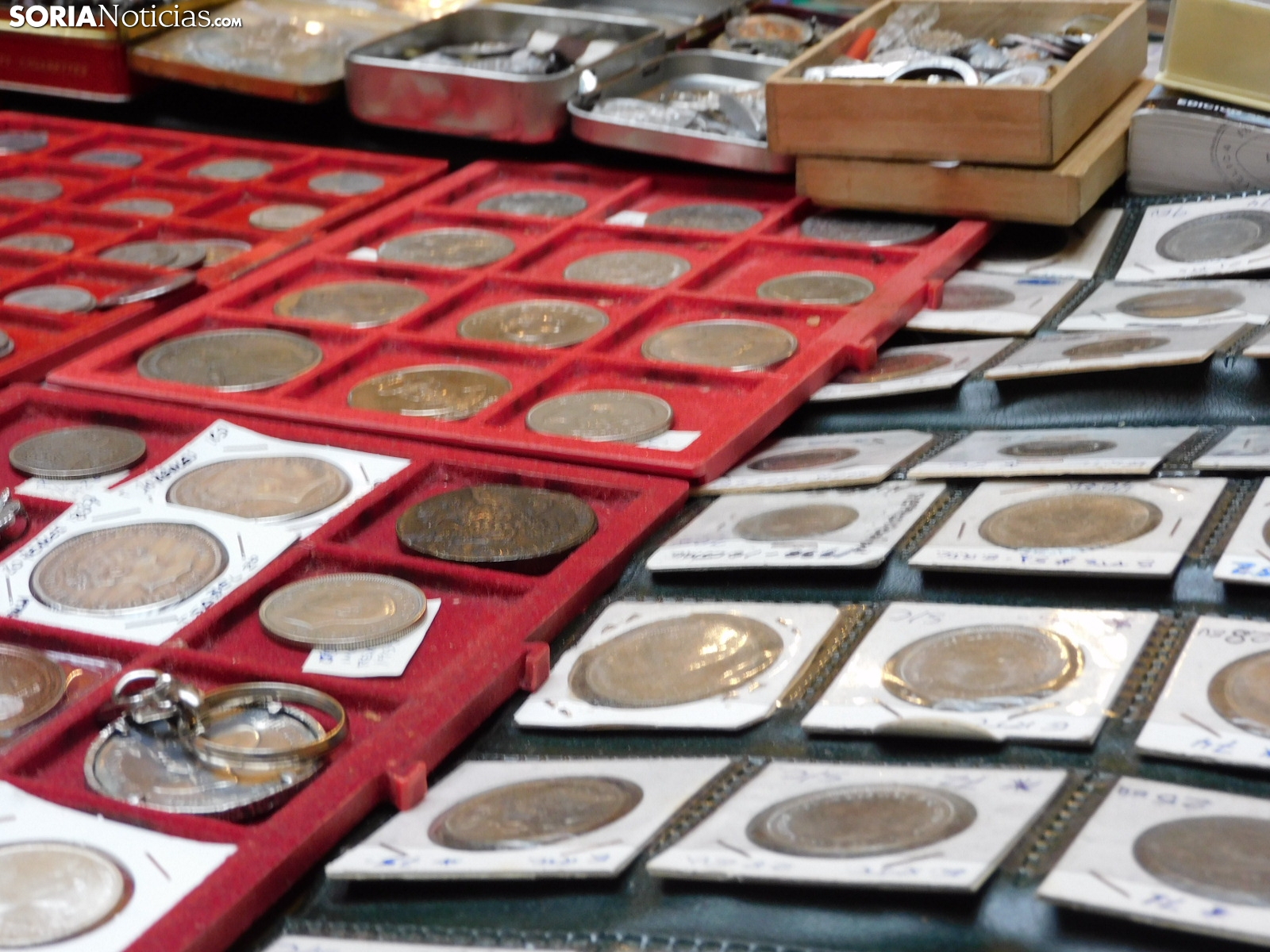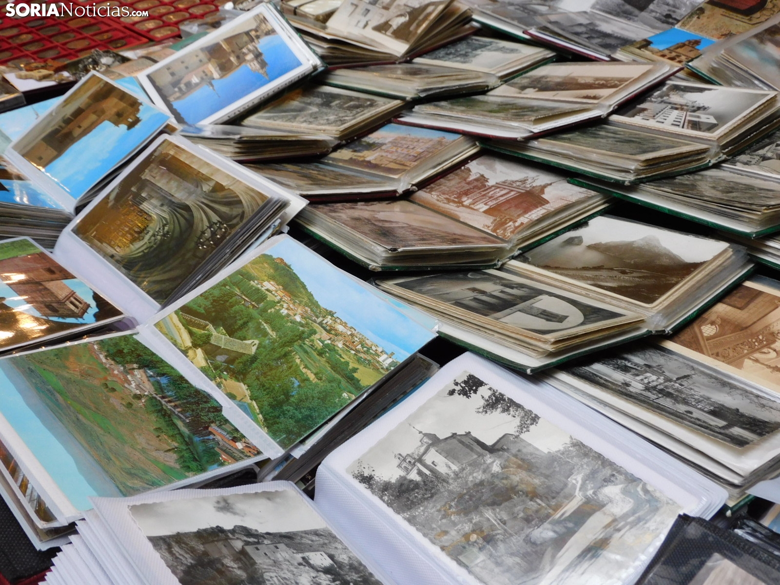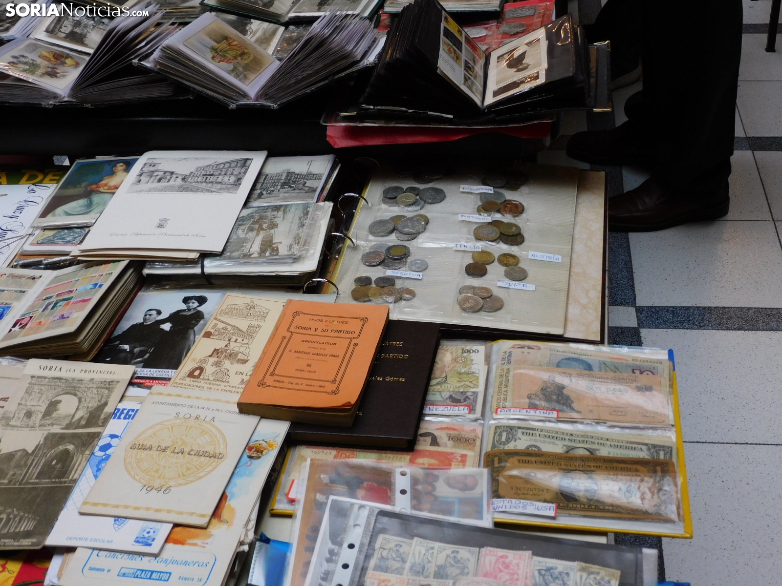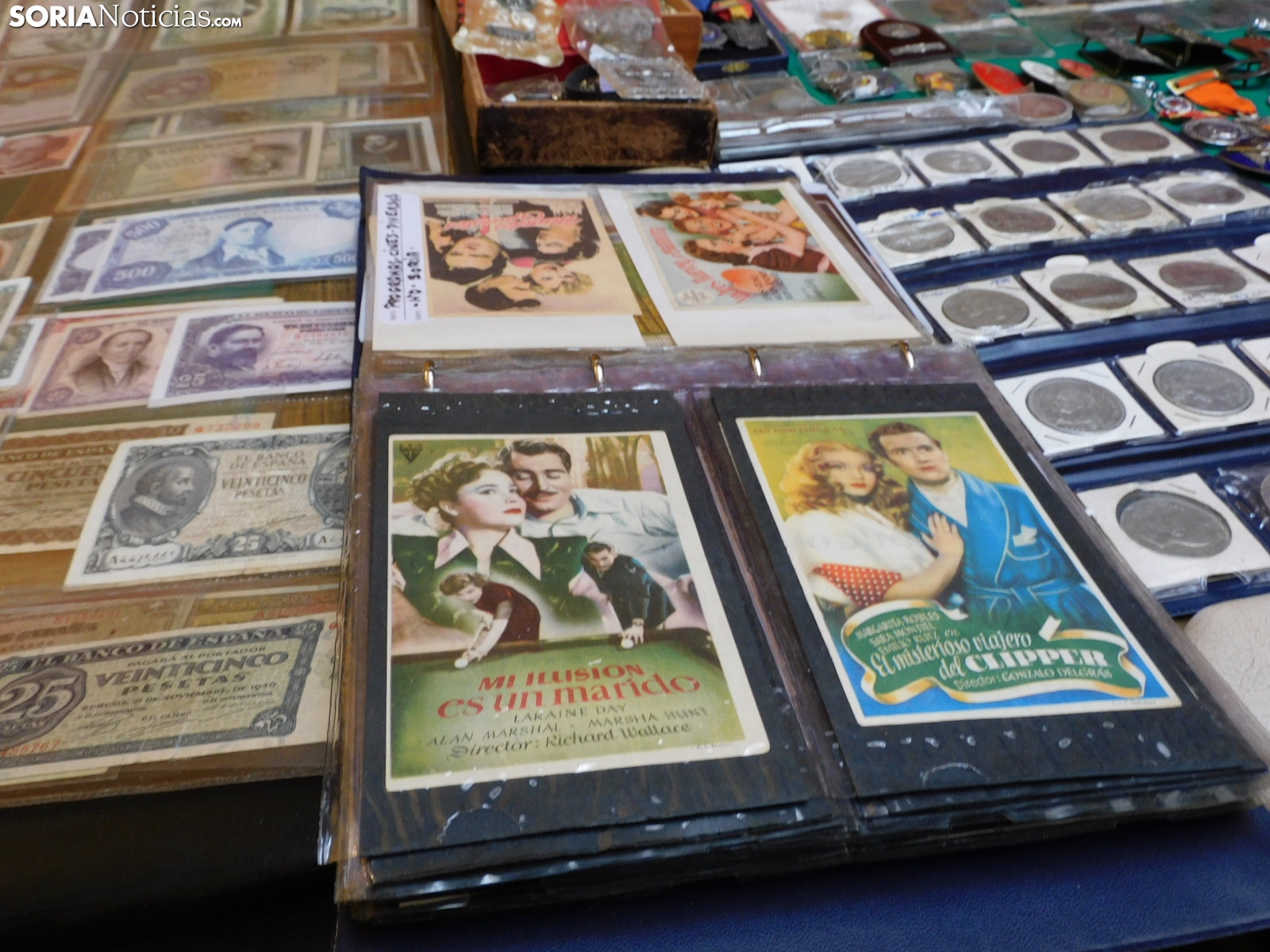 Pero el mercadillo es un mosaico de aficiones. Junto a las monedas, se exhiben medallas conmemorativas, postales antiguas de Soria y de toda España, e incluso curiosidades como programas de mano del antiguo cine Ideal de la capital, datados en 1936, en plena Guerra Civil. También hay espacio para la literatura local.