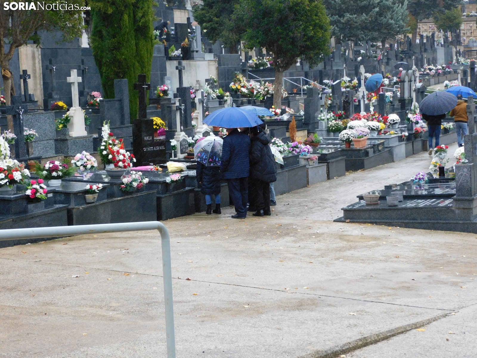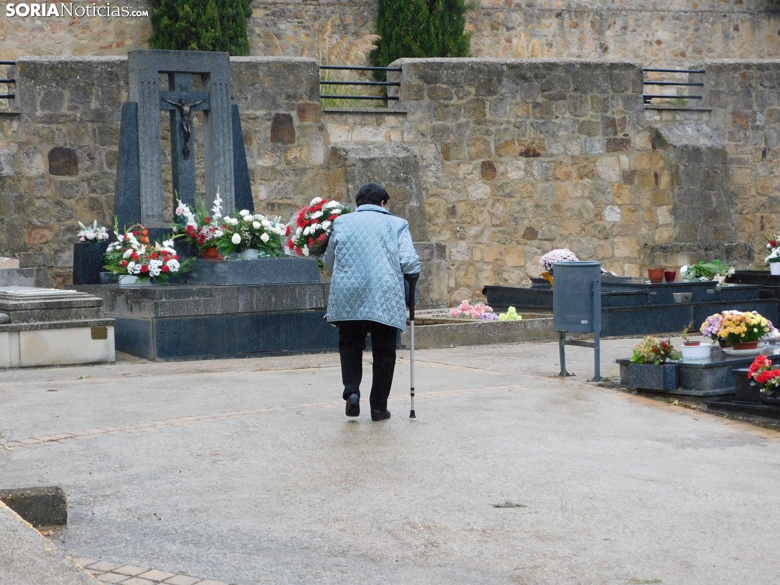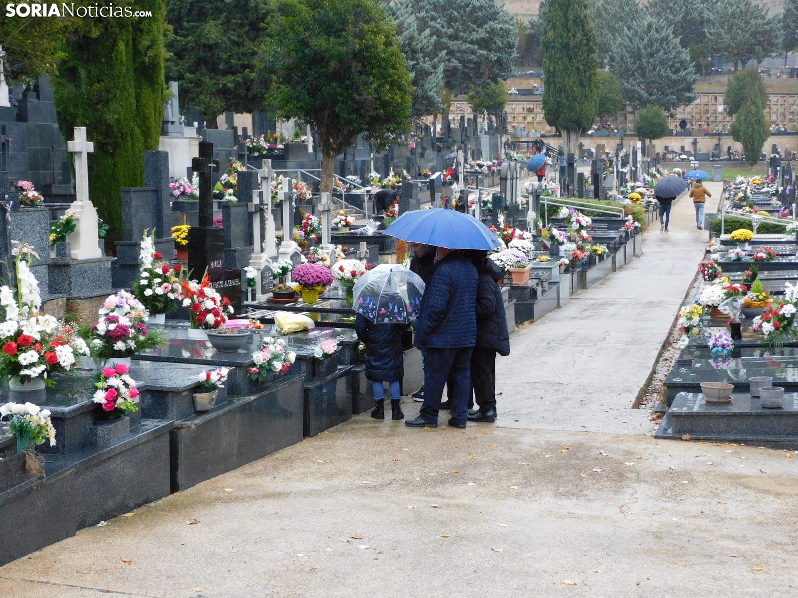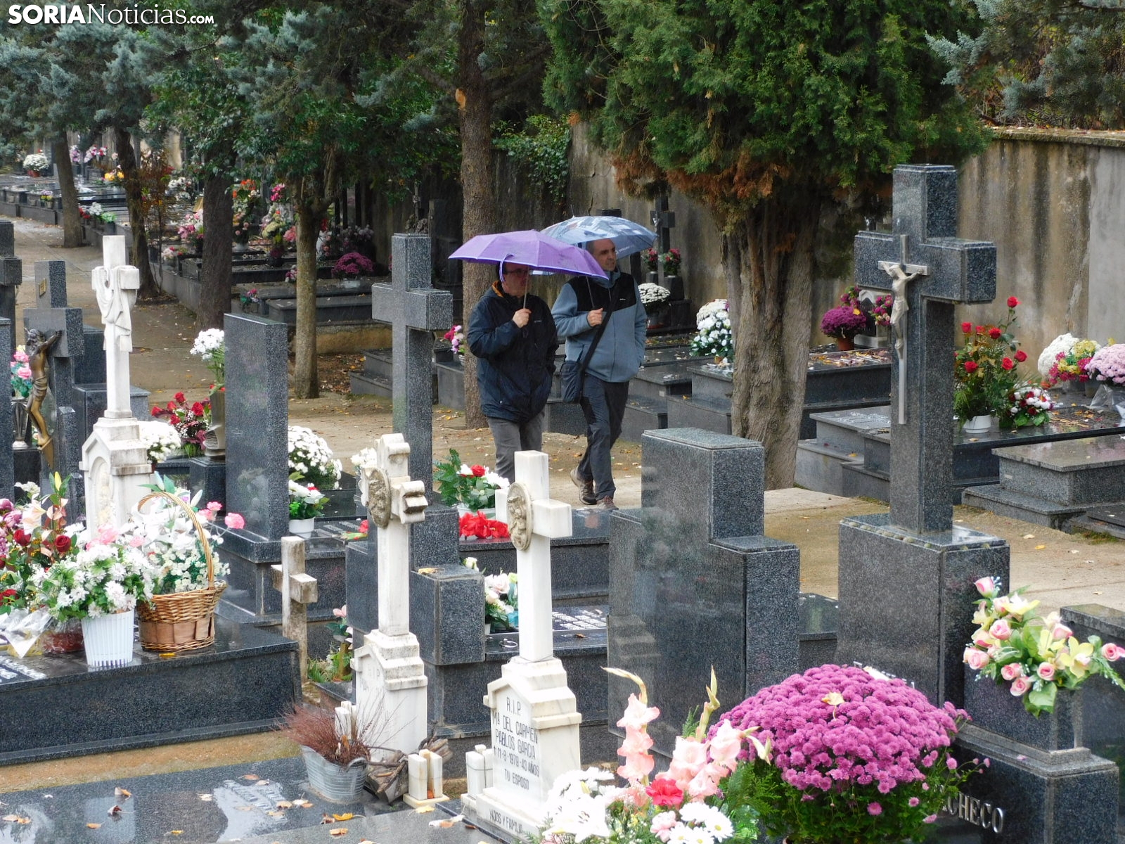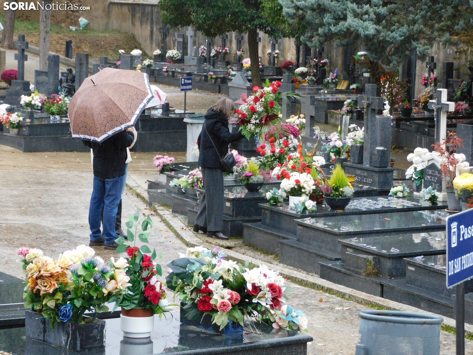 Centenares de personas han acudido esta mañana al cementerio de El Espino de Soria capital para visitar a sus difuntos en el día de Todos Los Santos. A pesar del mal tiempo, los sorianos, con sus respectivos paraguas, se han acercado hasta el recinto. Sin duda, una de las tumbas más visitadas ha vuelto a ser la de Leonor Izquierdo, esposa de Antonio Machado.
