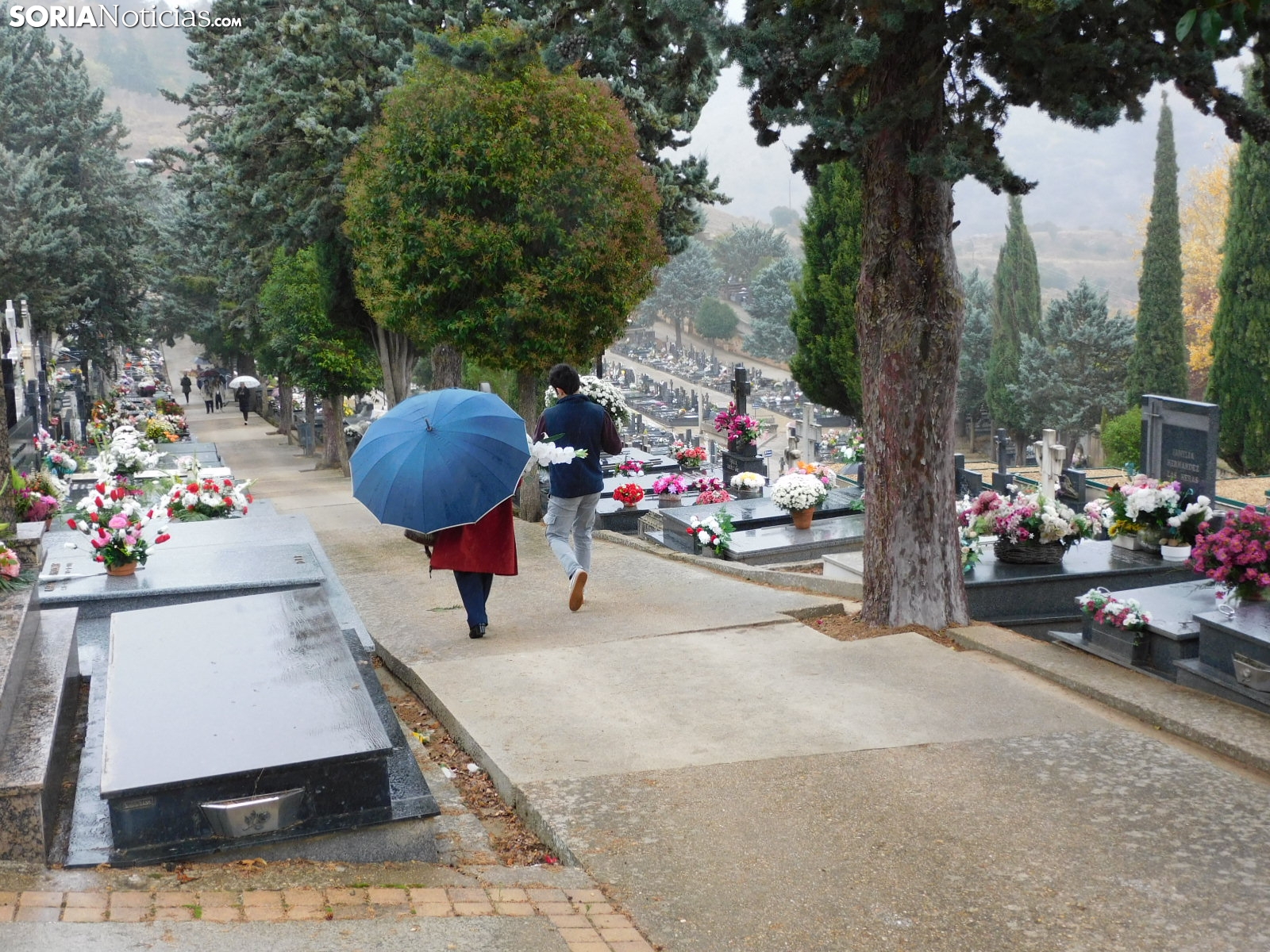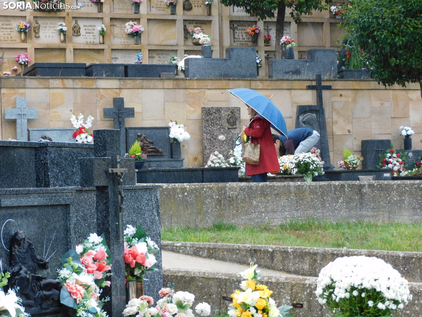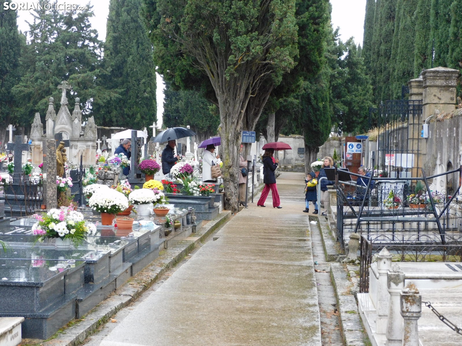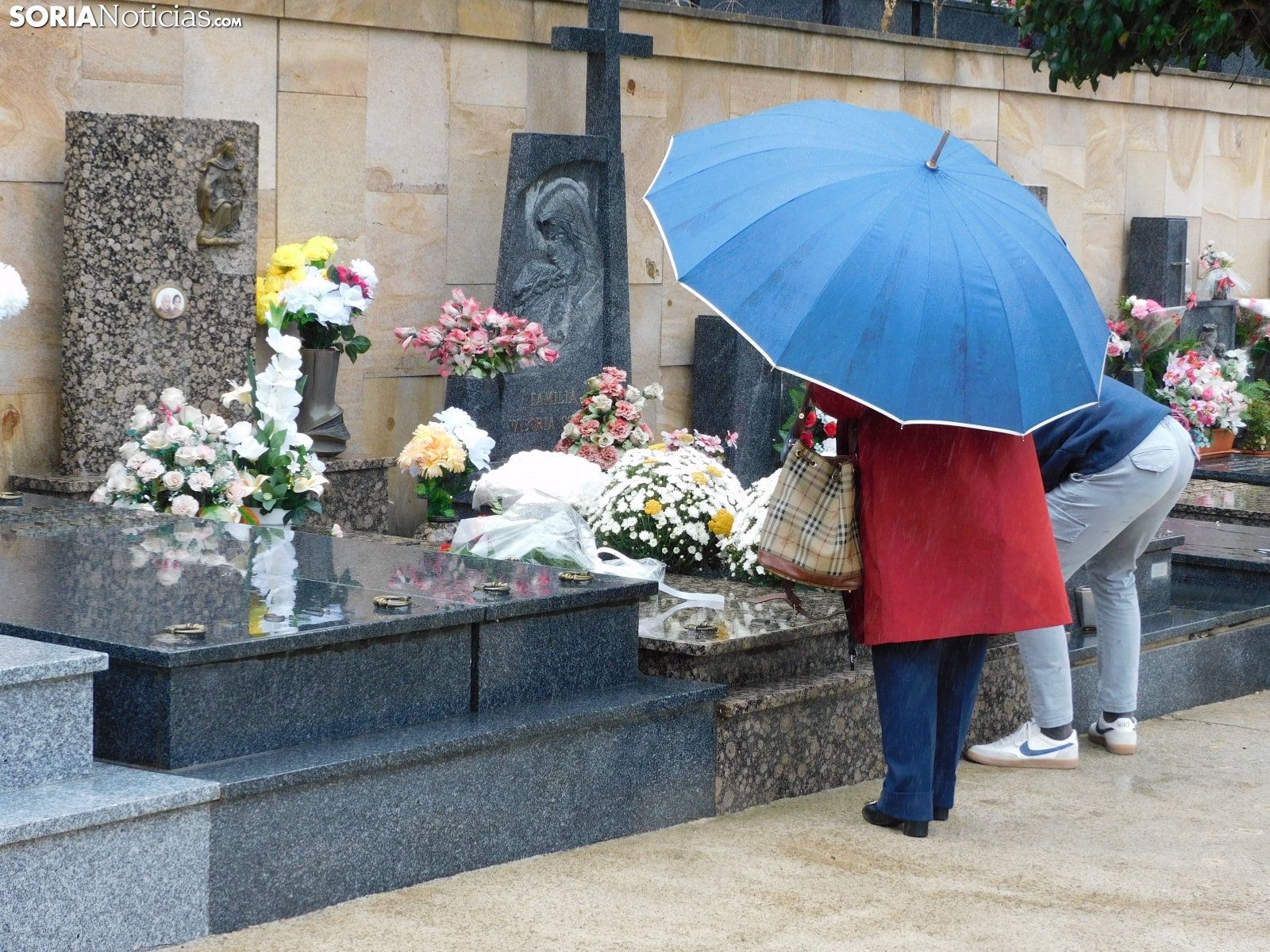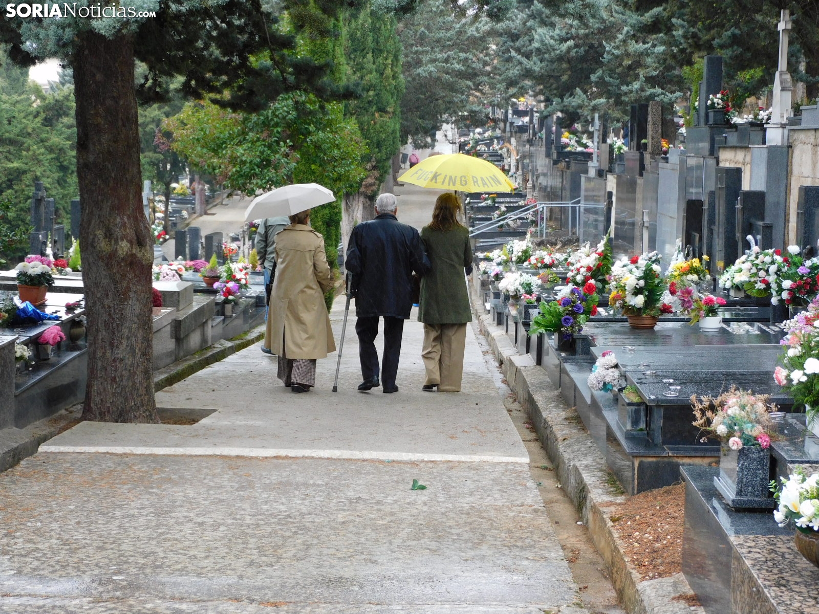 Centenares de personas han acudido esta mañana al cementerio de El Espino de Soria capital para visitar a sus difuntos en el día de Todos Los Santos. A pesar del mal tiempo, los sorianos, con sus respectivos paraguas, se han acercado hasta el recinto. Sin duda, una de las tumbas más visitadas ha vuelto a ser la de Leonor Izquierdo, esposa de Antonio Machado.