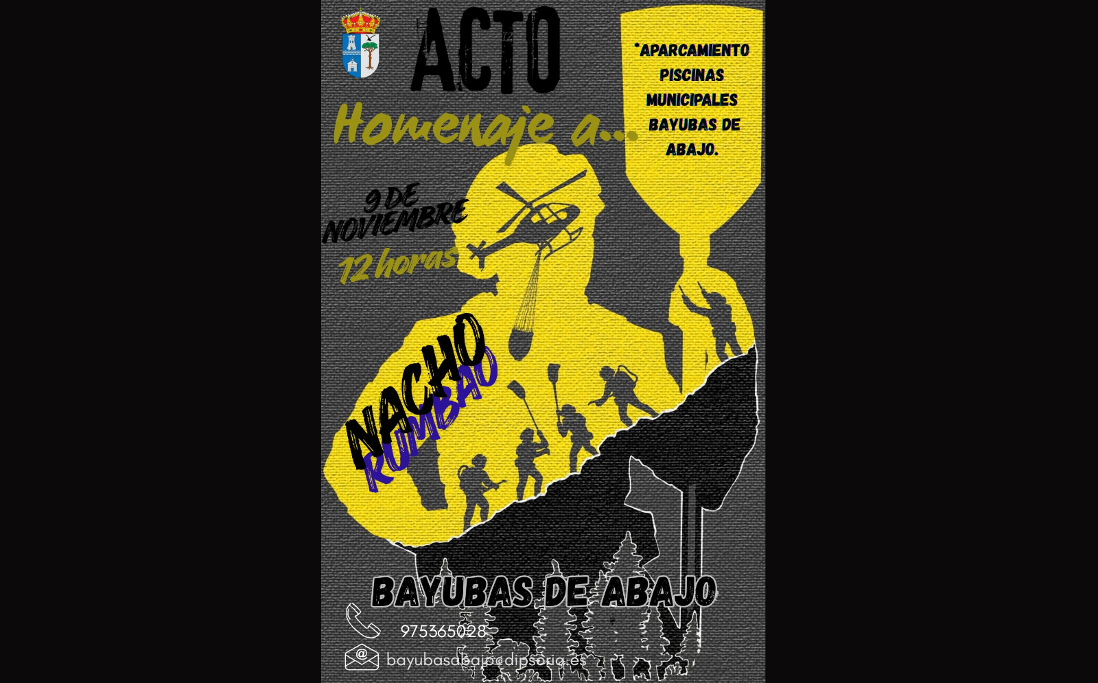 El Ayuntamiento de Bayubas de Abajo ha organizado un acto de homenaje para este próximo domingo, 9 de noviembre, en memoria de Nacho Rumbao, bombero forestal del convoy INFOCAL de Soria que tenía su base en la localidad. La iniciativa cuenta con la colaboración de la Junta de Castilla y León y la participación de sus agentes medioambientales.