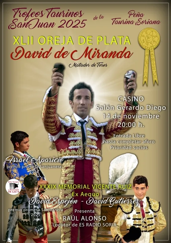 El Círculo Amistad Numancia de Soria acoge este viernes, 14 de noviembre, la gala de entrega de los premios taurinos que conceden la Peña Taurina Soriana y la Peña Taurina El Pacharán de las 6. El acto reconocerá a los triunfadores de las Fiestas de San Juan, con el matador David de Miranda y los novilleros David Espejón, David Gutiérrez e Israel Aparicio como principales galardonados.