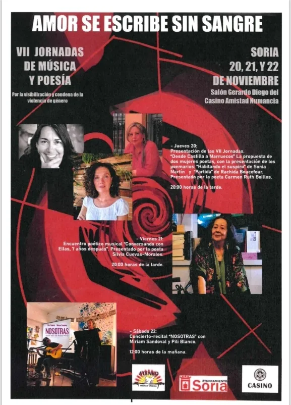 El salón Gerardo Diego del Círculo Amistad Numancia acoge un año más las actividades de las Jornadas de música y poesía, que este año alcanzan su VII edición, bajo el título 'Amor se escribe sin sangre'. El evento, organizado por el Ateneo Mónico Vicente, se desarrollará entre el 20 y el 22 de noviembre con una programación dedicada a la visibilización y condena de la violencia de género.