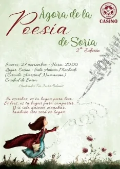 El Círculo Amistad Numancia convoca la segunda sesión del Ágora de la Poesía para este jueves 27 de noviembre a las 20:00 horas en el salón Antonio Machado del Casino. La cita llega tras el éxito de la primera edición de este espacio dedicado al verso y la palabra poética.