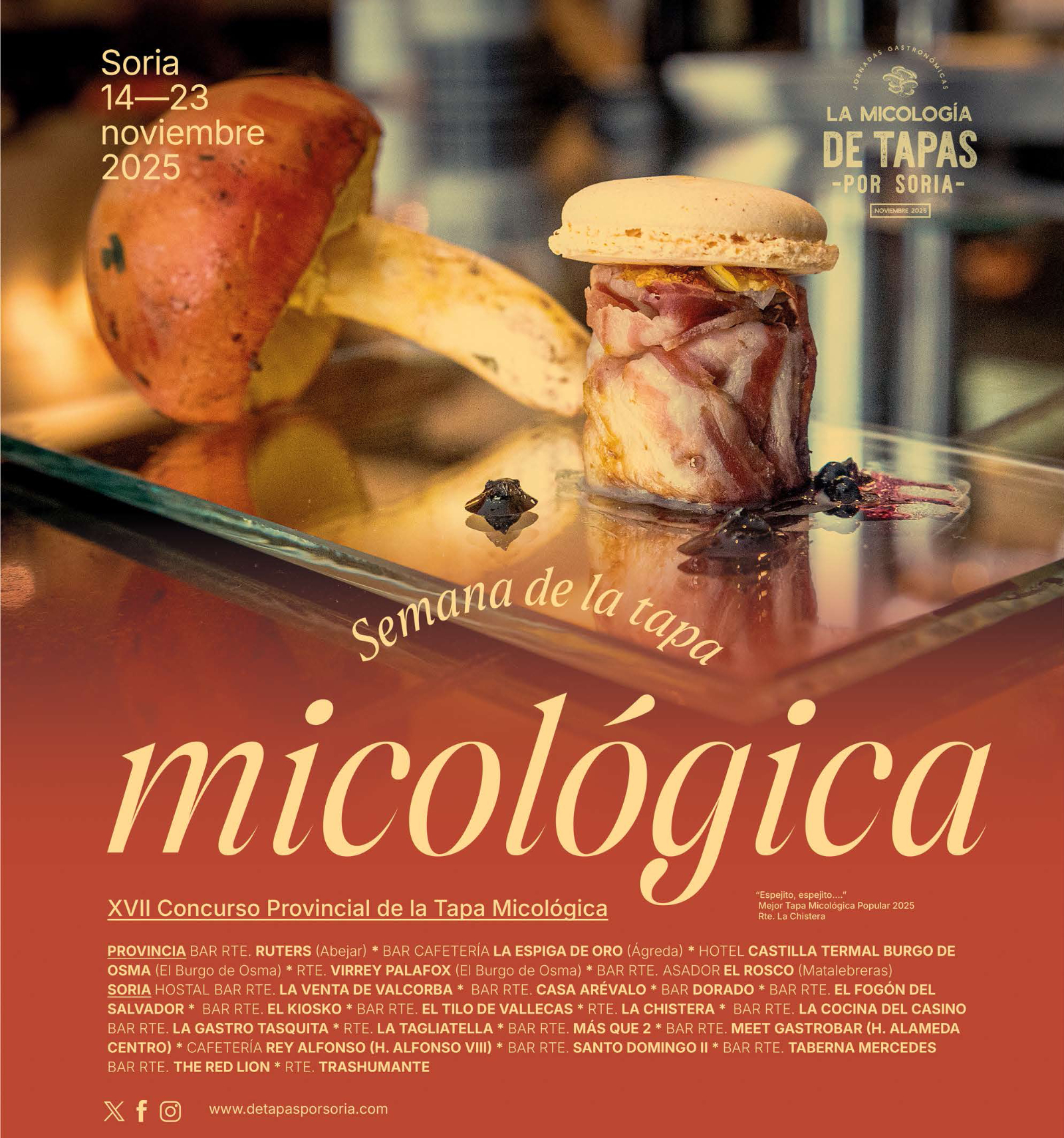 Diez establecimientos optan al primer premio de la Mejor Tapa Micológica Provincial y otros diez son los finalistas que se disputan la Mejor Tapa Micológica Popular, según la selección realizada por el jurado del CIFP La Merced, que ha destacado a otros 4 finalistas para la categoría Mejor Calidad en el Servicio, mientras otros 5 —preseleccionados por la Fundación Caja Rural de Soria— competirán en la fase final a la Mejor Tapa Micológica Mediterránea.
