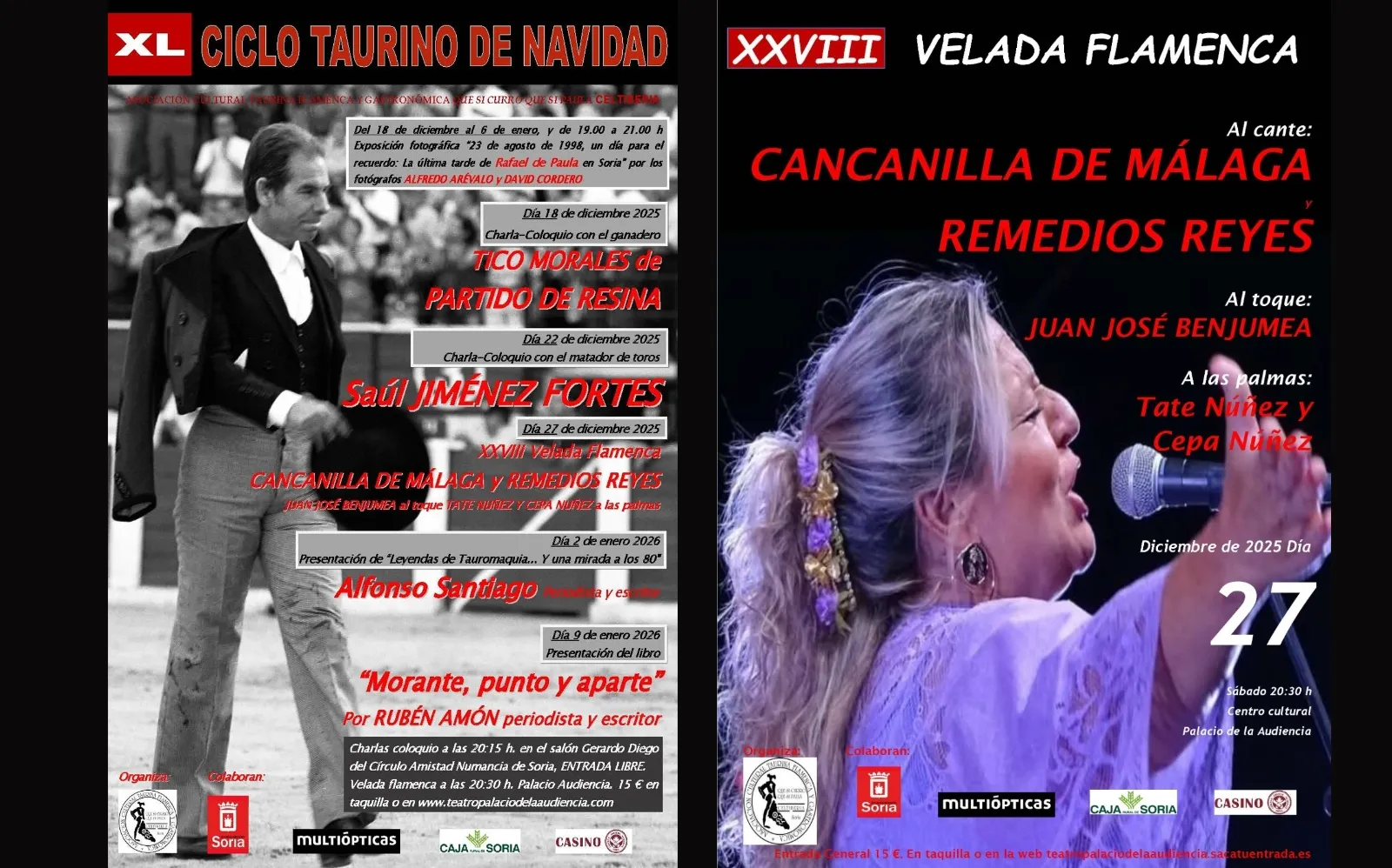 De forma paralela a las charlas, el Círculo Amistad Numancia acogerá una exposición fotográfica de gran carga emotiva para la afición local. Bajo el título '23 de agosto de 1998, un día para el recuerdo: La última tarde de Rafael de Paula en Soria', la muestra recoge el trabajo de los fotógrafos Alfredo Arévalo y David Cordero. Las imágenes, que documentan la actuación del diestro jerezano —recientemente fallecido— en el festival homenaje a José Luis Palomar, podrán visitarse del 18 de diciembre al 6 de enero en horario de 19.00 a 21.00 horas.