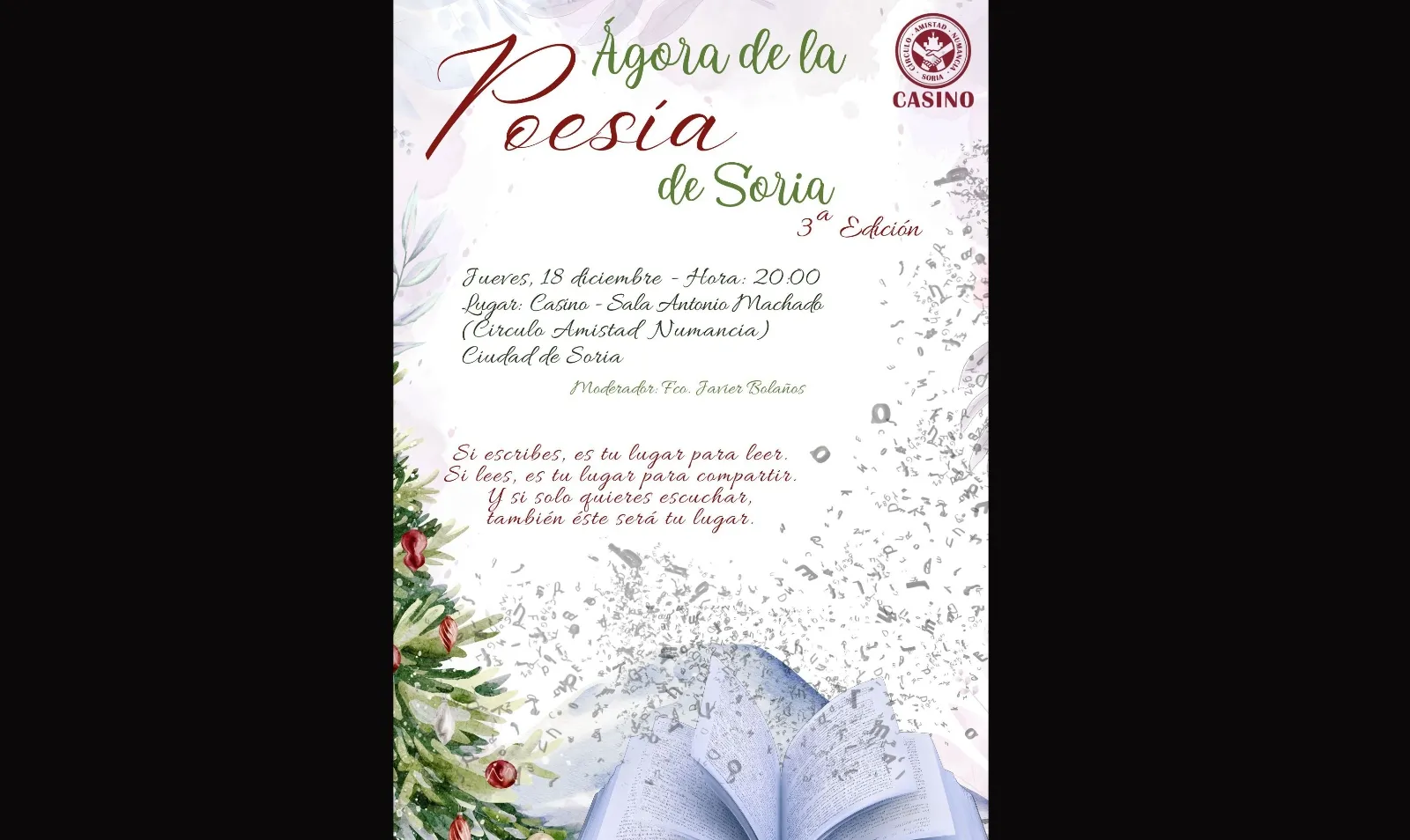 Será el próximo jueves 18 de diciembre en el salón Antonio Machado del Casino. La cita, moderada por Francisco Javier Bolaños, está abierta a todos los amantes de los poemas con entrada libre a las 20:00 horas.
