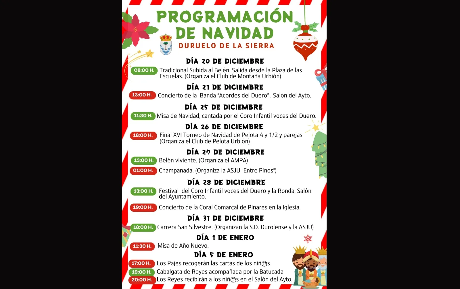 • Sábado, 28 de diciembre: La música será la protagonista con una doble cita. A las 13:00 horas, el Salón del Ayuntamiento acogerá el Festival del Coro Infantil voces del Duero y la Ronda. Por la tarde, a las 19:00 horas, la Iglesia será el escenario del concierto de la Coral Comarcal de Pinares.