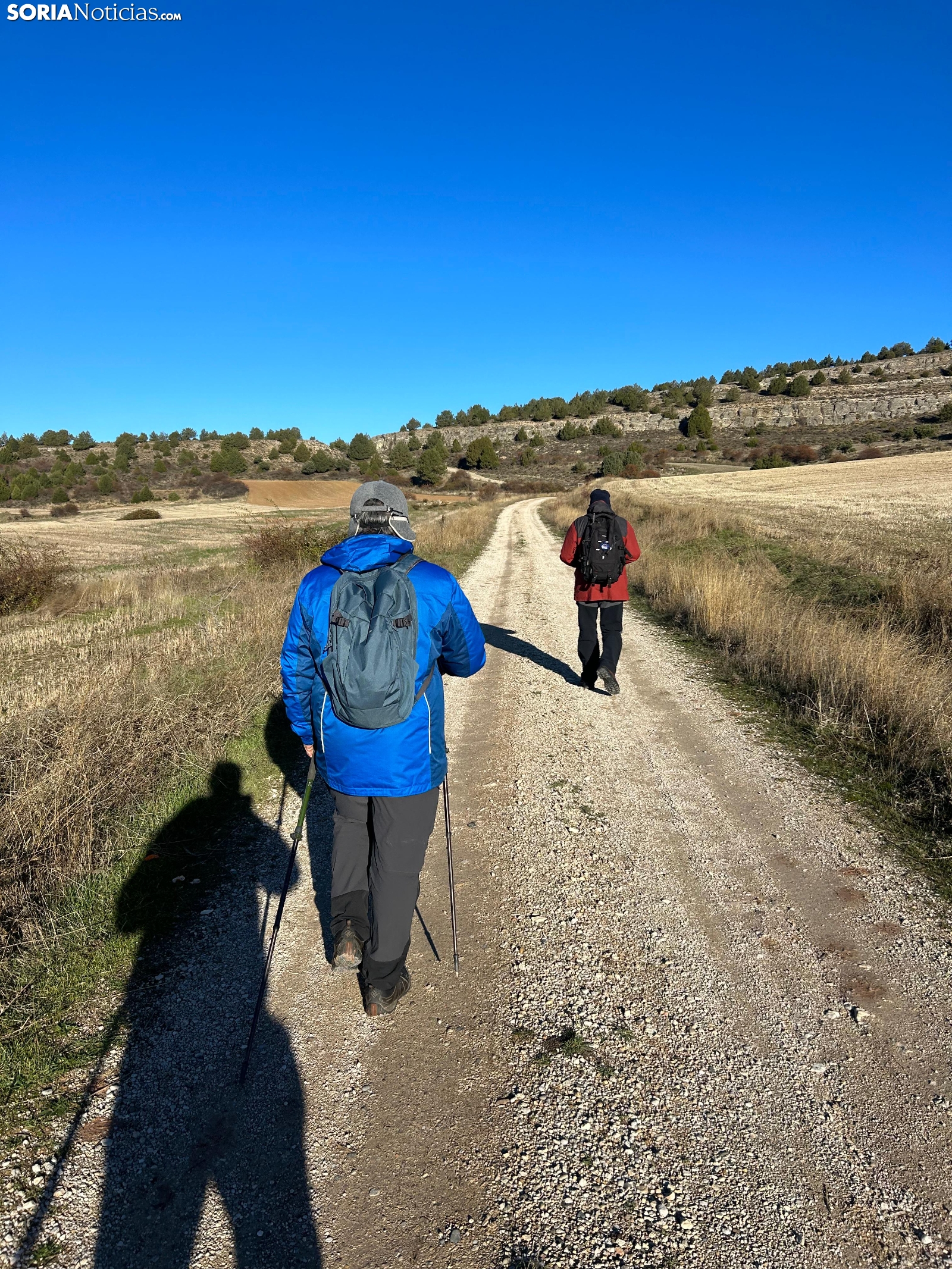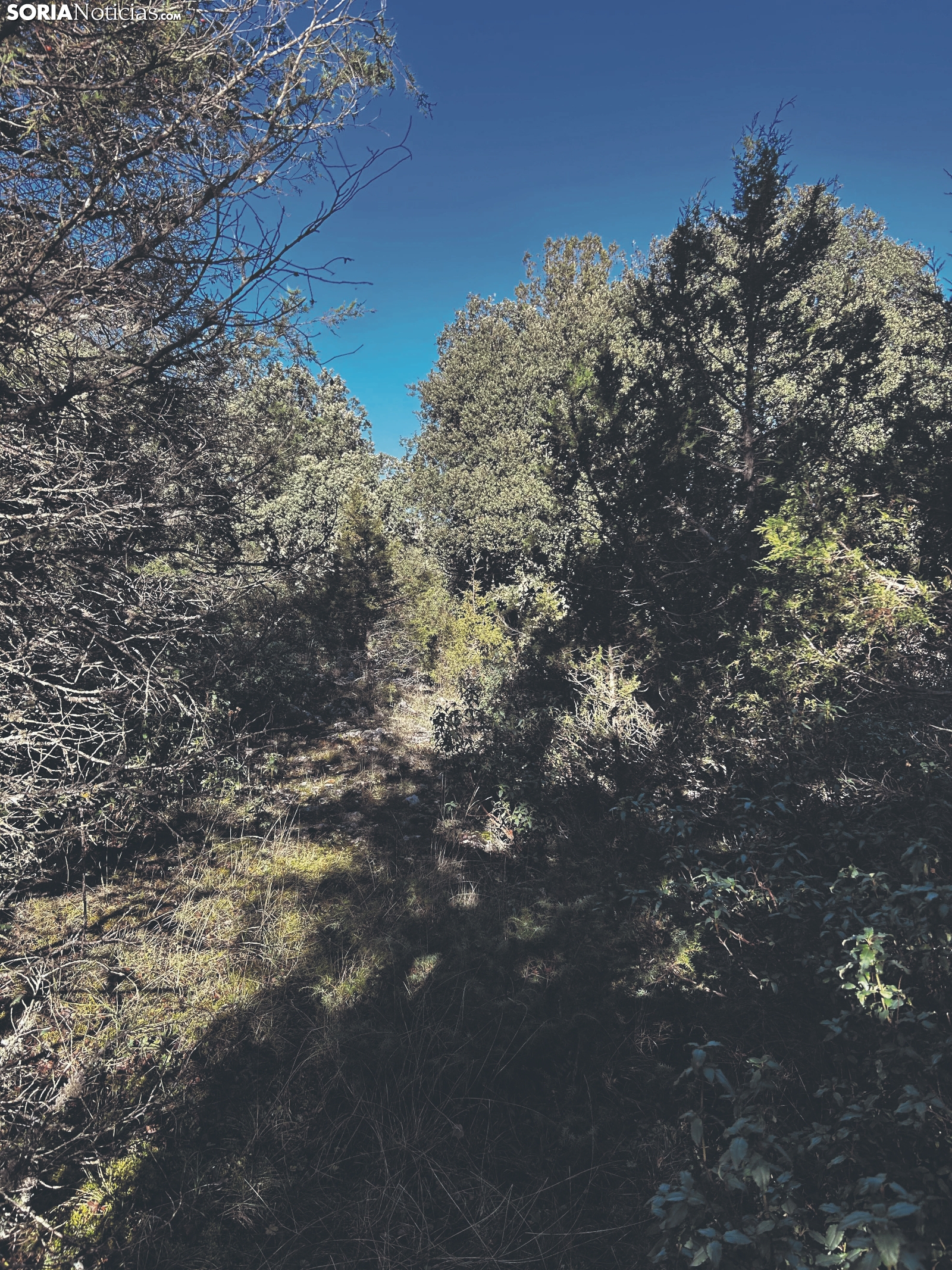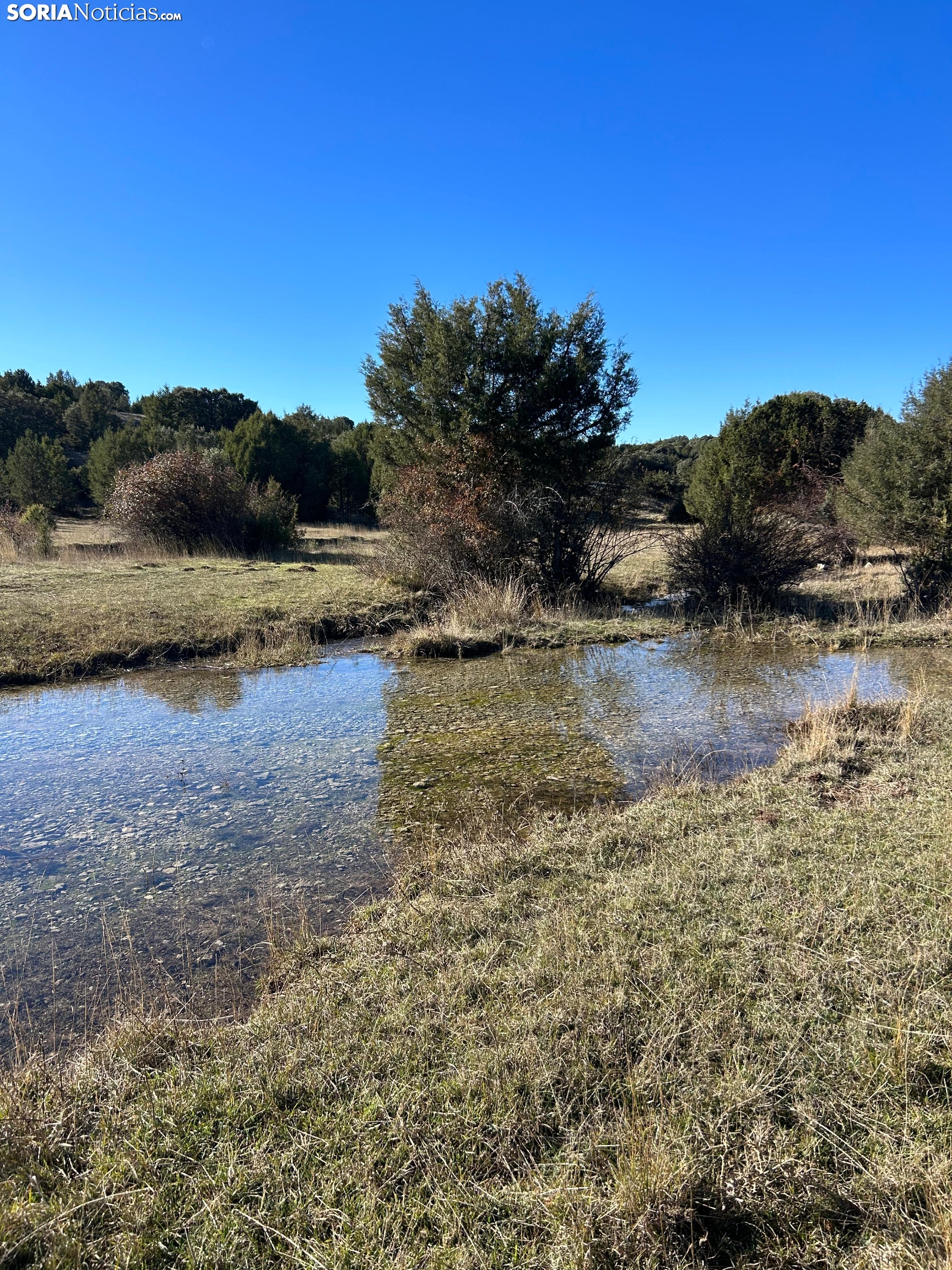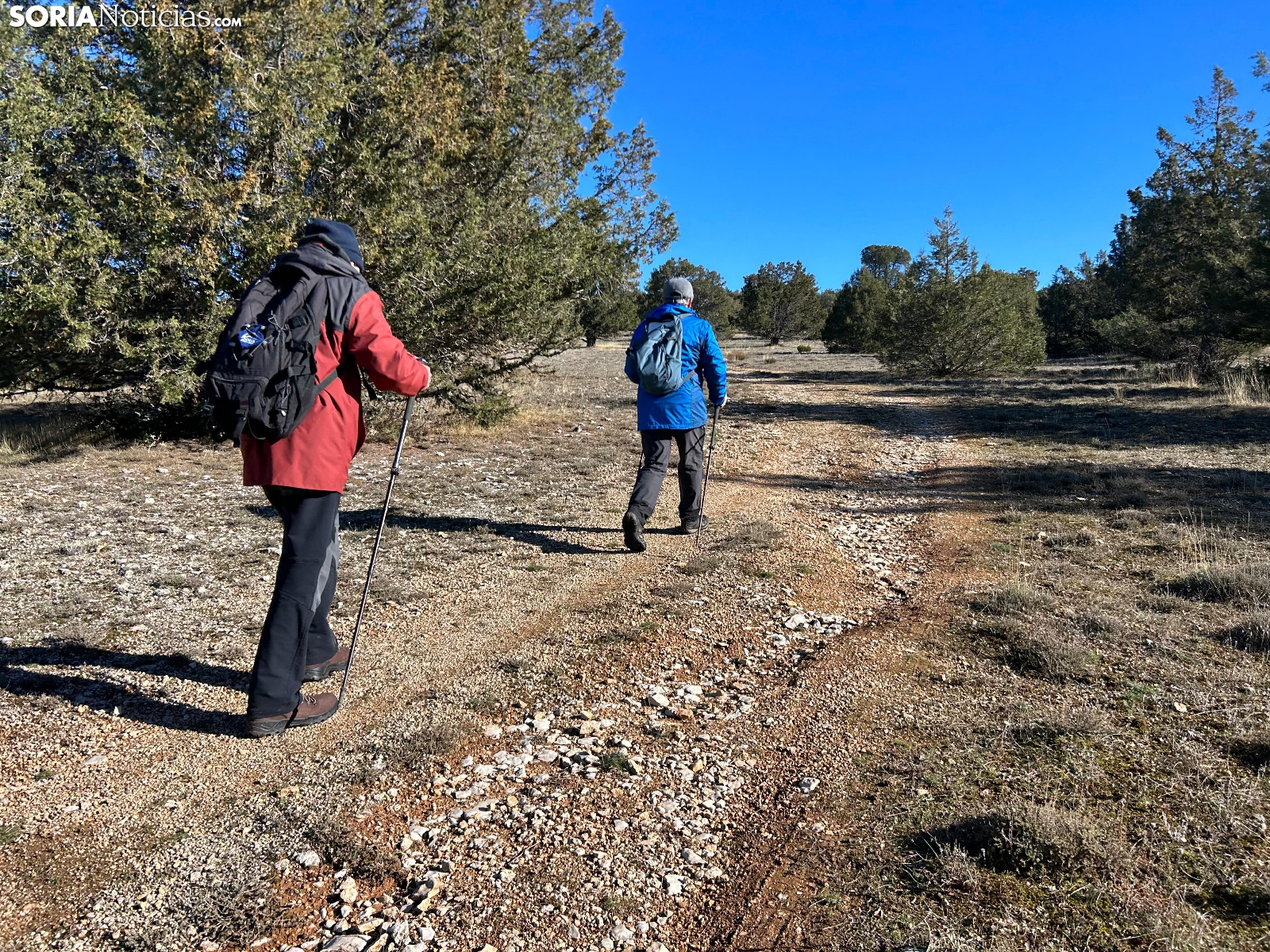 La primera parada de este viaje tendrá lugar en el nacimiento del manantial Fuente Vieja. Situado a un kilómetro del pueblo, se encuentra seco por la escasez de lluvias durante los meses de octubre y principios de noviembre. Después de observarlo, seguimos caminando por una cuesta de gran pendiente en la que tenemos que emplear los palos de andar para ayudarnos. Una vez alcanzamos la cima, divisamos una pradera totalmente verde y una bifurcación de caminos. Empleando el de la izquierda, nos sumergimos en un bosque de sabinas por el que es muy cómodo caminar -el terreno es muy esponjoso-. Este sabinar confluye con el de Calatañazor, el más denso del mundo y el segundo más extenso de Europa, tan solo superado por el de Albarracín (Teruel).