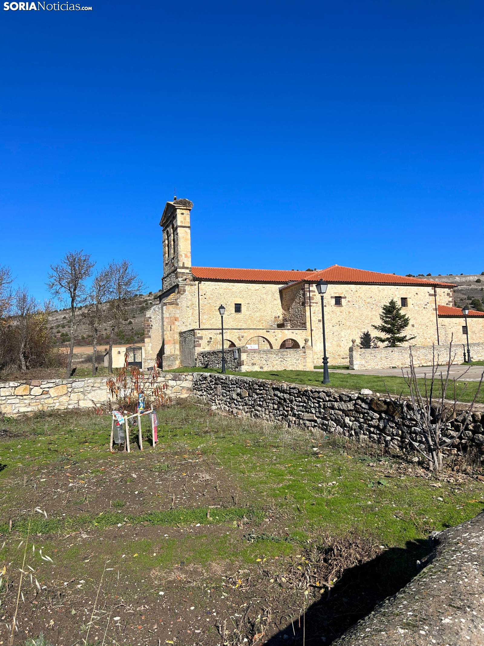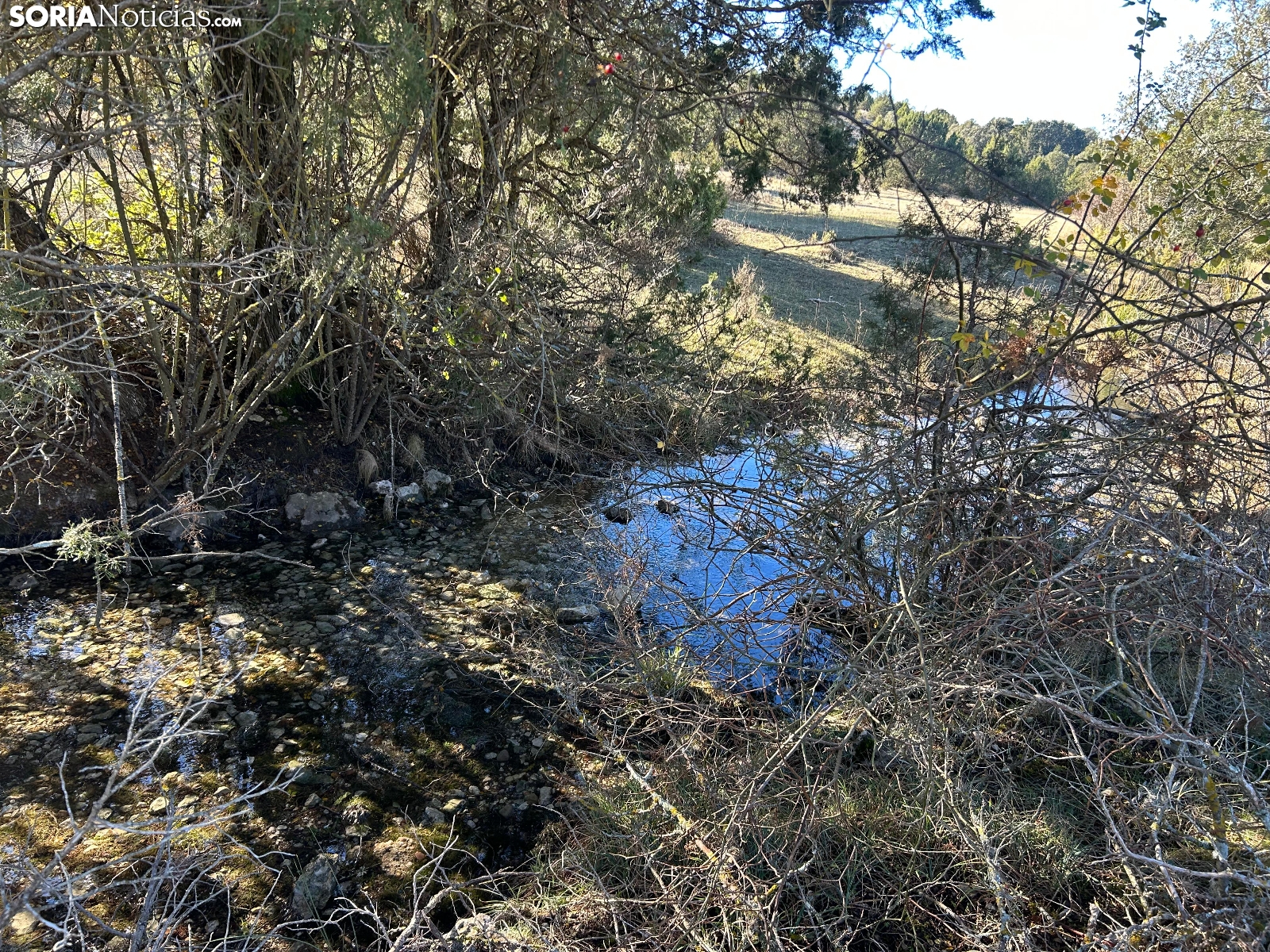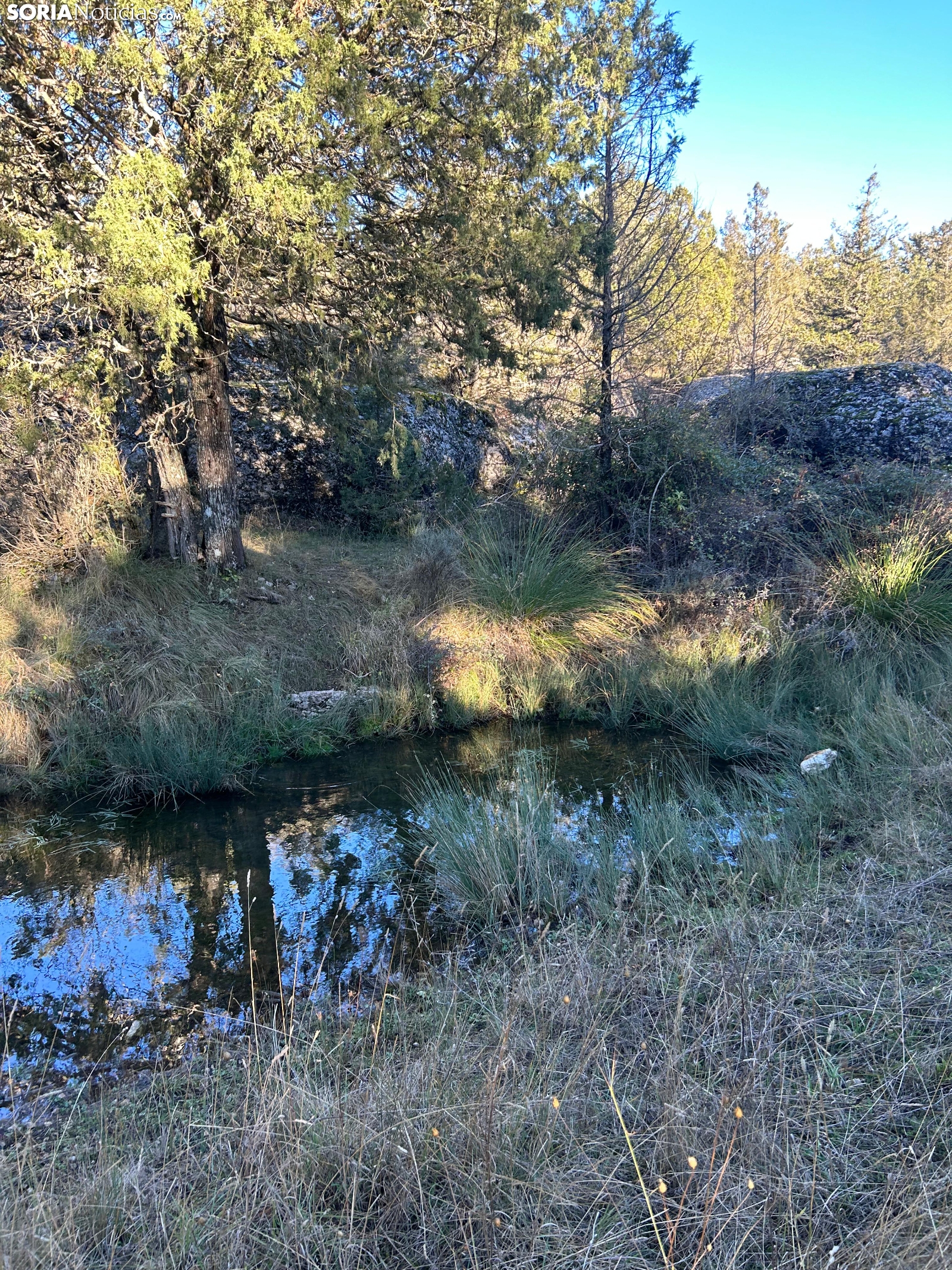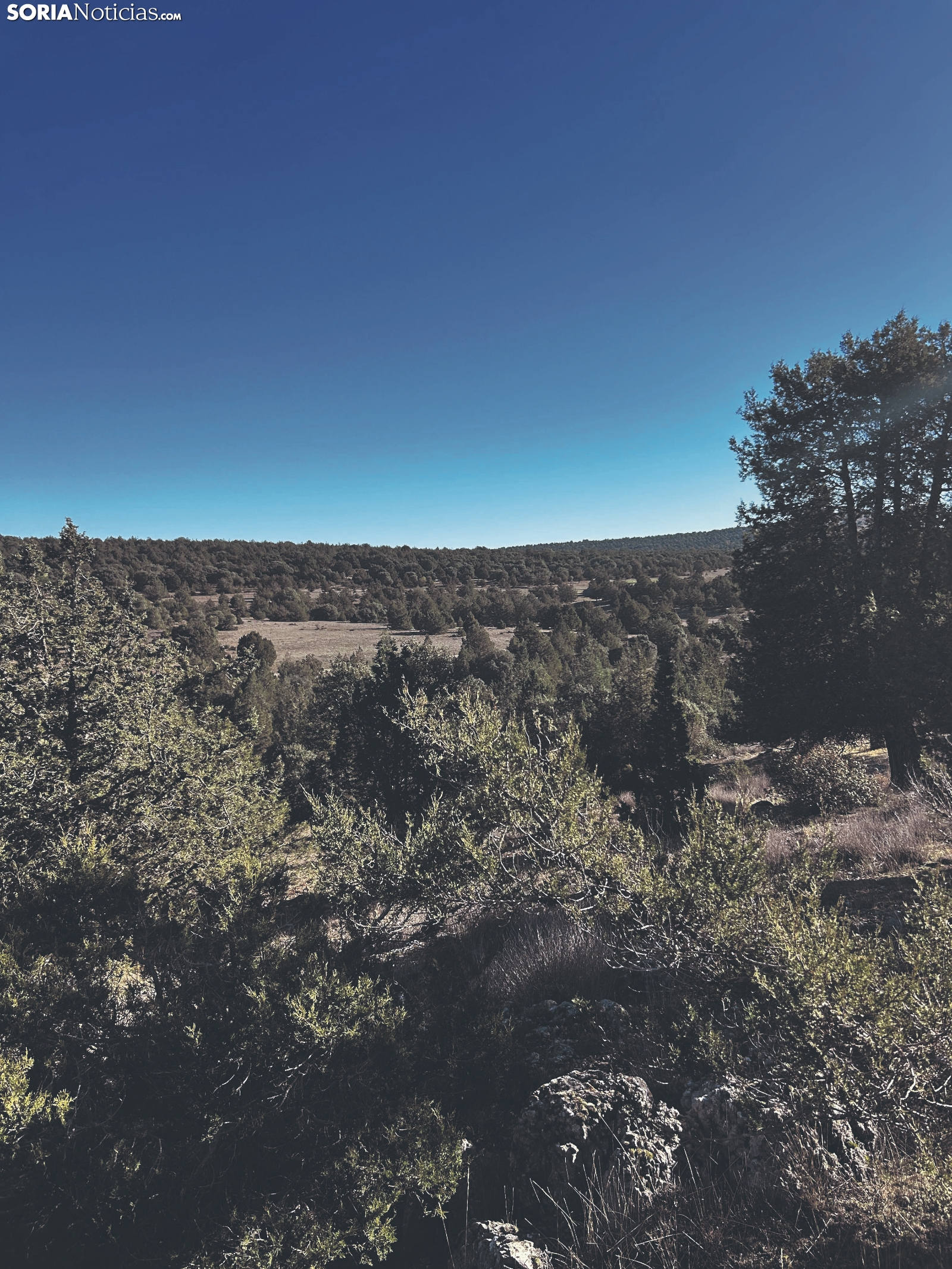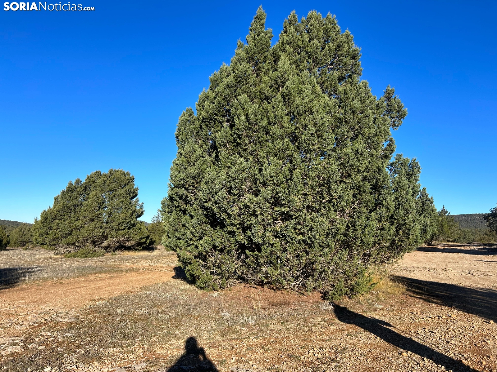 La primera parada de este viaje tendrá lugar en el nacimiento del manantial Fuente Vieja. Situado a un kilómetro del pueblo, se encuentra seco por la escasez de lluvias durante los meses de octubre y principios de noviembre. Después de observarlo, seguimos caminando por una cuesta de gran pendiente en la que tenemos que emplear los palos de andar para ayudarnos. Una vez alcanzamos la cima, divisamos una pradera totalmente verde y una bifurcación de caminos. Empleando el de la izquierda, nos sumergimos en un bosque de sabinas por el que es muy cómodo caminar -el terreno es muy esponjoso-. Este sabinar confluye con el de Calatañazor, el más denso del mundo y el segundo más extenso de Europa, tan solo superado por el de Albarracín (Teruel).