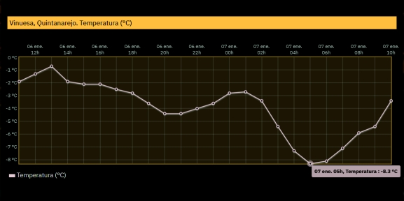 Es el caso de El Quintanarejo, en Vinuesa, donde a las cinco de la mañana la temperatura era de -8,3 ºC y dos horas antes, en la demarcación del Moncayo, concretamente en Ólvega, quedaban registrados los -7,8 ºC, dos horas antesy, a la una de la madrugada, Lubia daba este mismo valor. Cerca andaban por Morón de Almazán, con -7,6 ºC a las dos de la madrugada y a las cinco, en Barriomartín (La Póveda de Soria), bajaban hasta los -7,3 ºC, si bien tras un ligero repunte al alza, volvían a caer después, aunque no con tanta intensidad.
