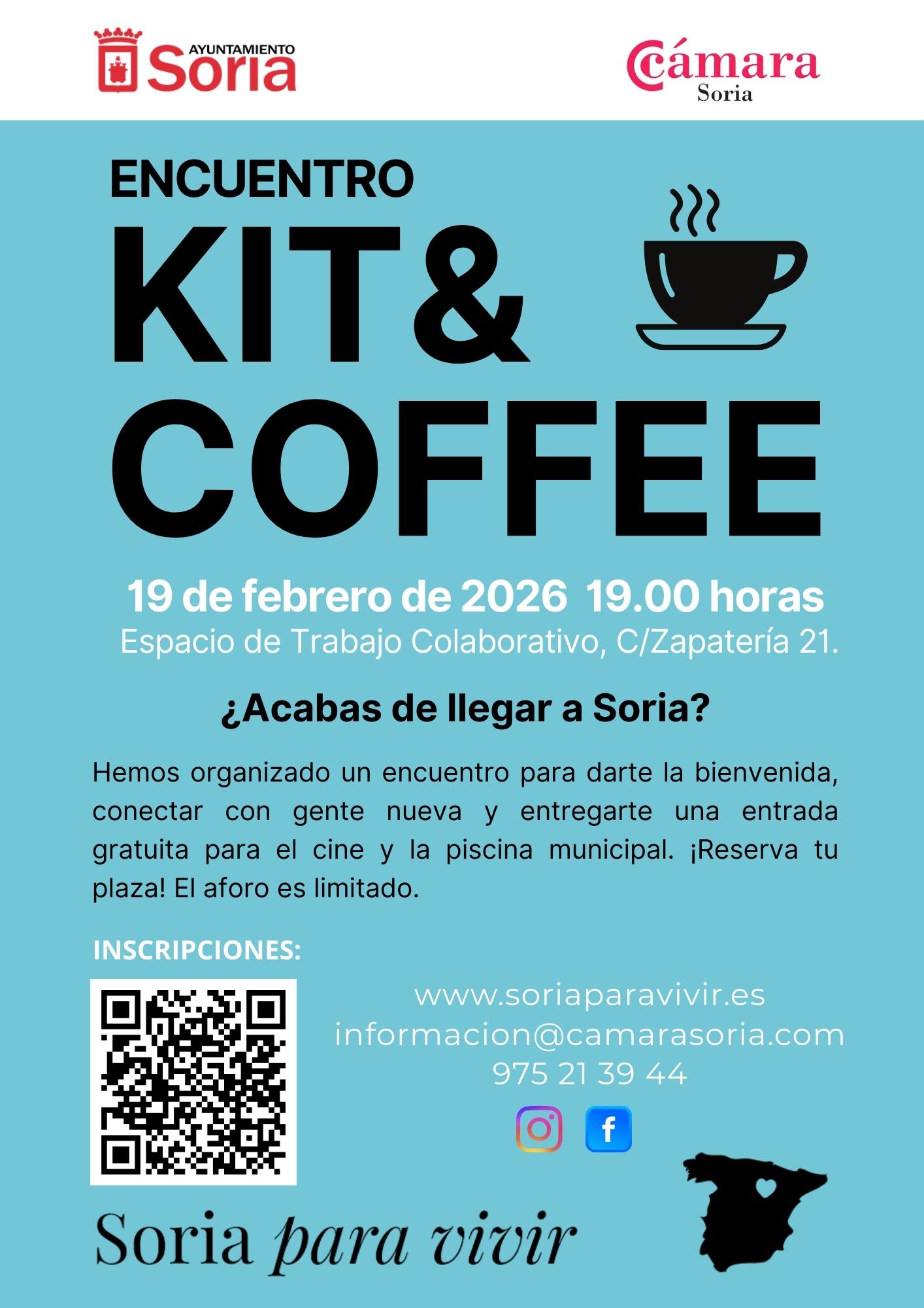 El Espacio de Trabajo Colaborativo situado en la calle Zapatería, 21, volverá a abrir sus puertas el próximo 19 de febrero para acoger la tercera edición del 'Kit & Coffee'. A partir de las 19.00 horas, este evento pretende servir de punto de anclaje para aquellos que han elegido Soria como nuevo hogar. Se trata de una dinámica que, tras la buena acogida de las dos convocatorias anteriores, se ha revelado como una herramienta eficaz para facilitar el aterrizaje vital y profesional de los nuevos vecinos, ofreciendo en esta ocasión incentivos culturales y deportivos como entradas gratuitas para el cine y la piscina.