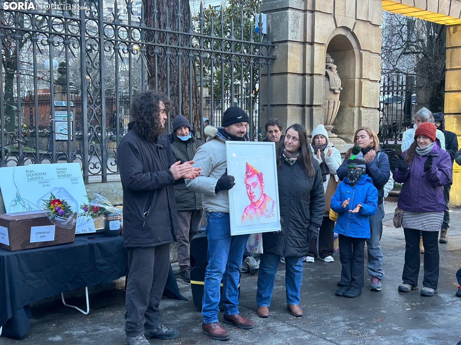 Recuerdo y Dignidad ha protagonizado esta tarde un acto muy emotivo en el centro de Soria. La Asociación, encabezada por su presidente, Iván Aparicio, ha hecho entrega a dos familias de los restos mortales, fechados en 1.936, de unas personas que llevaban buscando mucho tiempo. Junto a ellos, también han dado una ilustración de los fallecidos. Estos fueron encontrados gracias a una ardua labor de investigación y exhumación en diferentes puntos de la provincia.