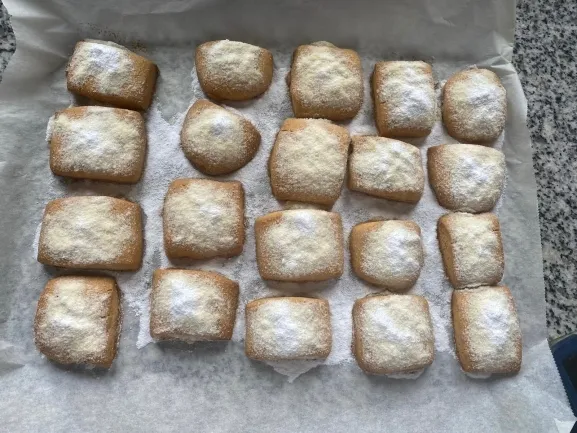 Para el formado, se separa una porción de masa y se estira con un rodillo hasta conseguir un grosor de 1,5 centímetros. Tradicionalmente, la masa se corta en pequeños cuadrados que se colocan en bandejas para introducirlos en el horno.