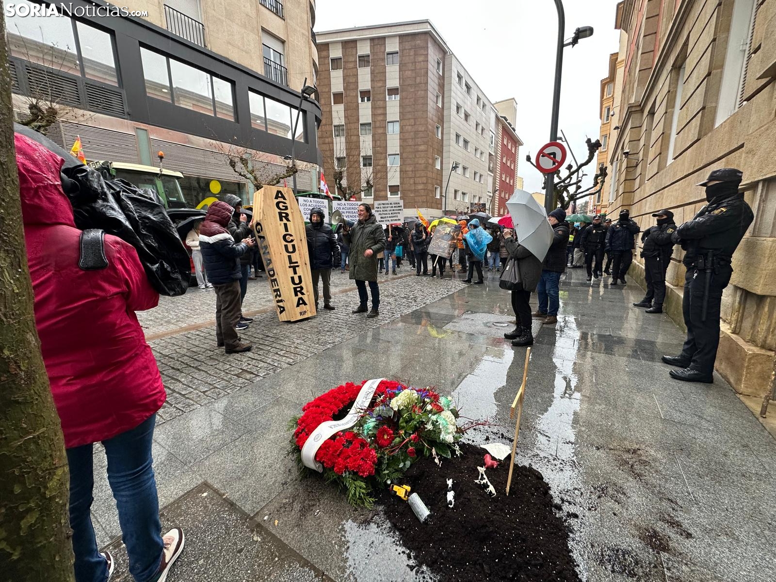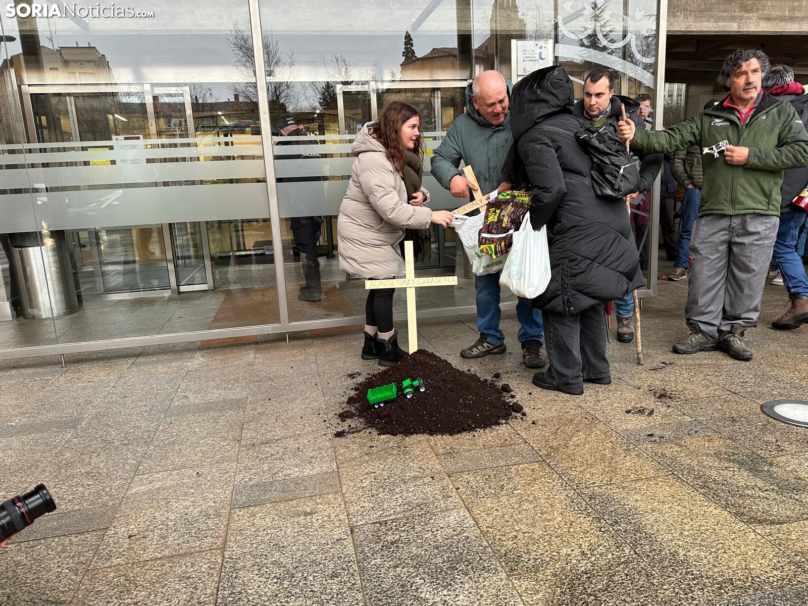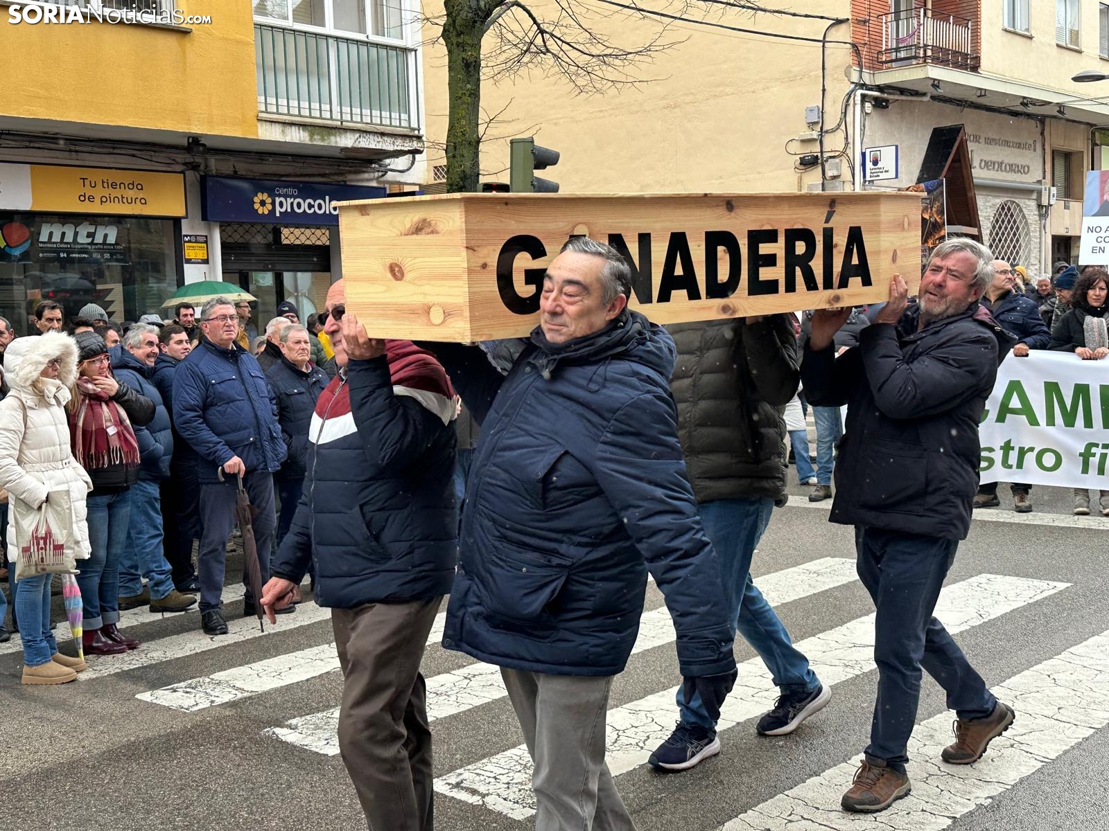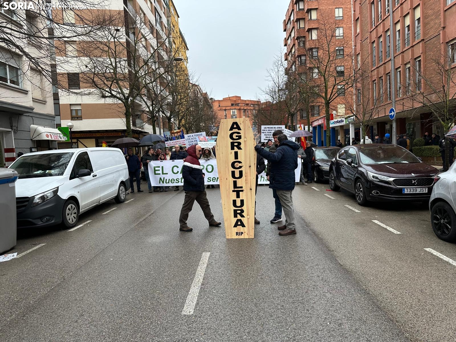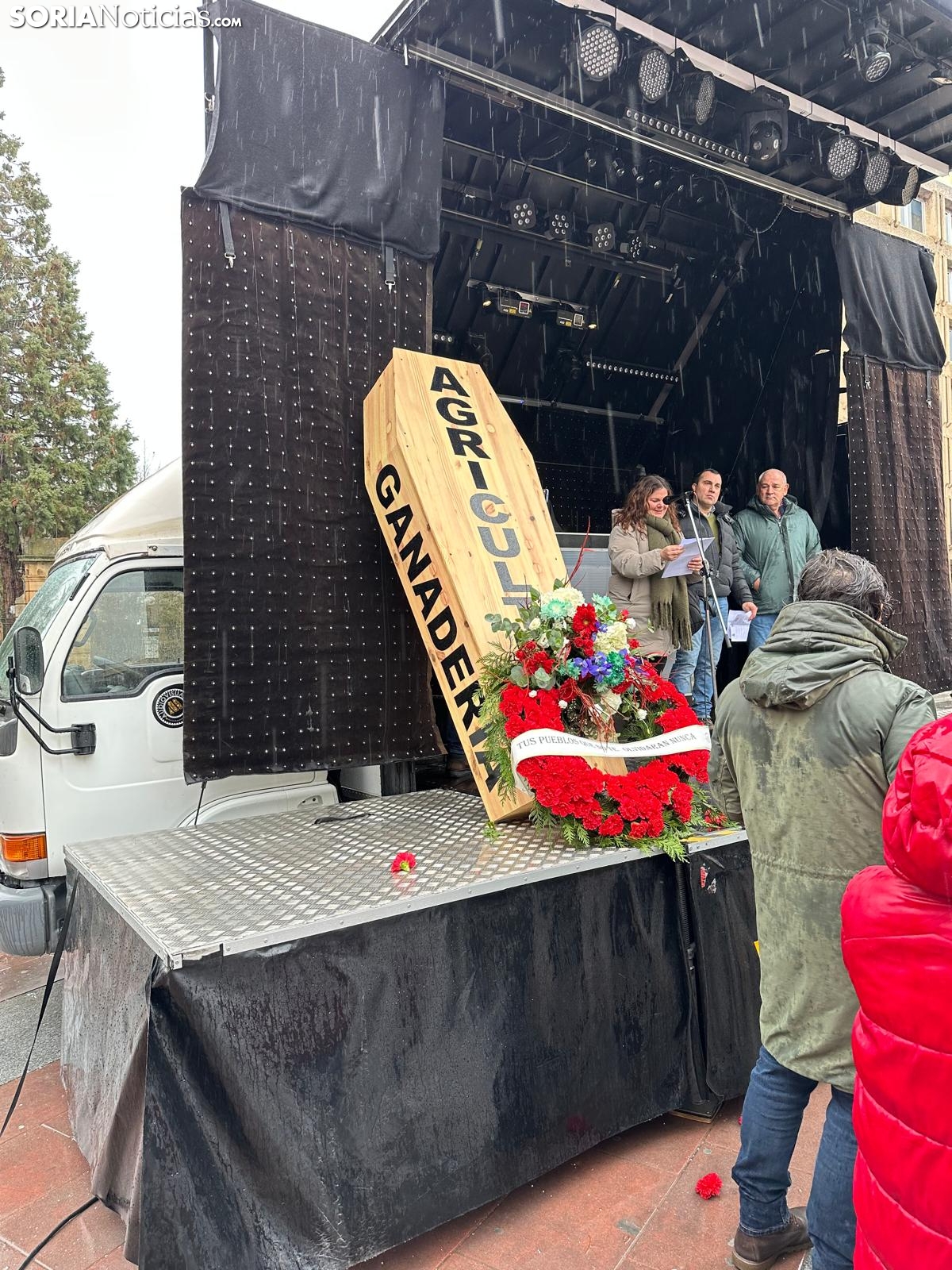 Los agricultores y ganaderos han dicho basta esta mañana en la capital de la provincia. A partir de las 12 de la tarde se han congregado en el inicio de la avenida Mariano Vicén para mostrar su descontento con los acuerdos comerciales firmados por la Unión Europea con Mercosur y otros contratos internacionales que perjudicarán a todos aquellos que forman parte del sector primario en Europa. Tractores y una masa humana han desfilado a lo largo de la avenida hasta llegar a la plaza Mariano Granados. Los silbatos que portaban los viandantes, el claxon de los tractores y un sonido que emulaba a una sirena, dando la voz de alarma, desde un megáfono han sido la sintonía que ha acompañado a la procesión, en la que se simulaba el funeral de la ganadería y la agricultura. En su trayecto han hecho escala en la Delegación Territorial de la Junta de Castilla y León y en la Subdelegación del Gobierno. En ambas paradas, han vertido frente a la puerta de las instituciones un saco de abono y han clavado una cruz de madera, emulando las tumbas de doña Agricultura y Ganadería. Además, han dejado en ambas instituciones cartas dirigidas a Alfonso Fernández-Mañueco y Pedro Sánchez en las que reflejan sus preocupaciones y piden unas mejores condiciones para el sector. Ya en Mariano Granados, ha tenido lugar la lectura del manifiesto y se ha depositado el féretro, con una vistosa corona de flores, para que todo el mundo pueda ver a la difunta Agricultura y Ganadería de Europa.