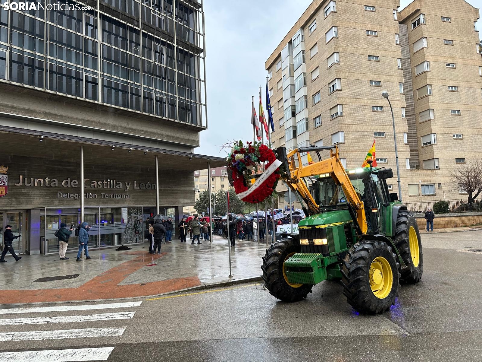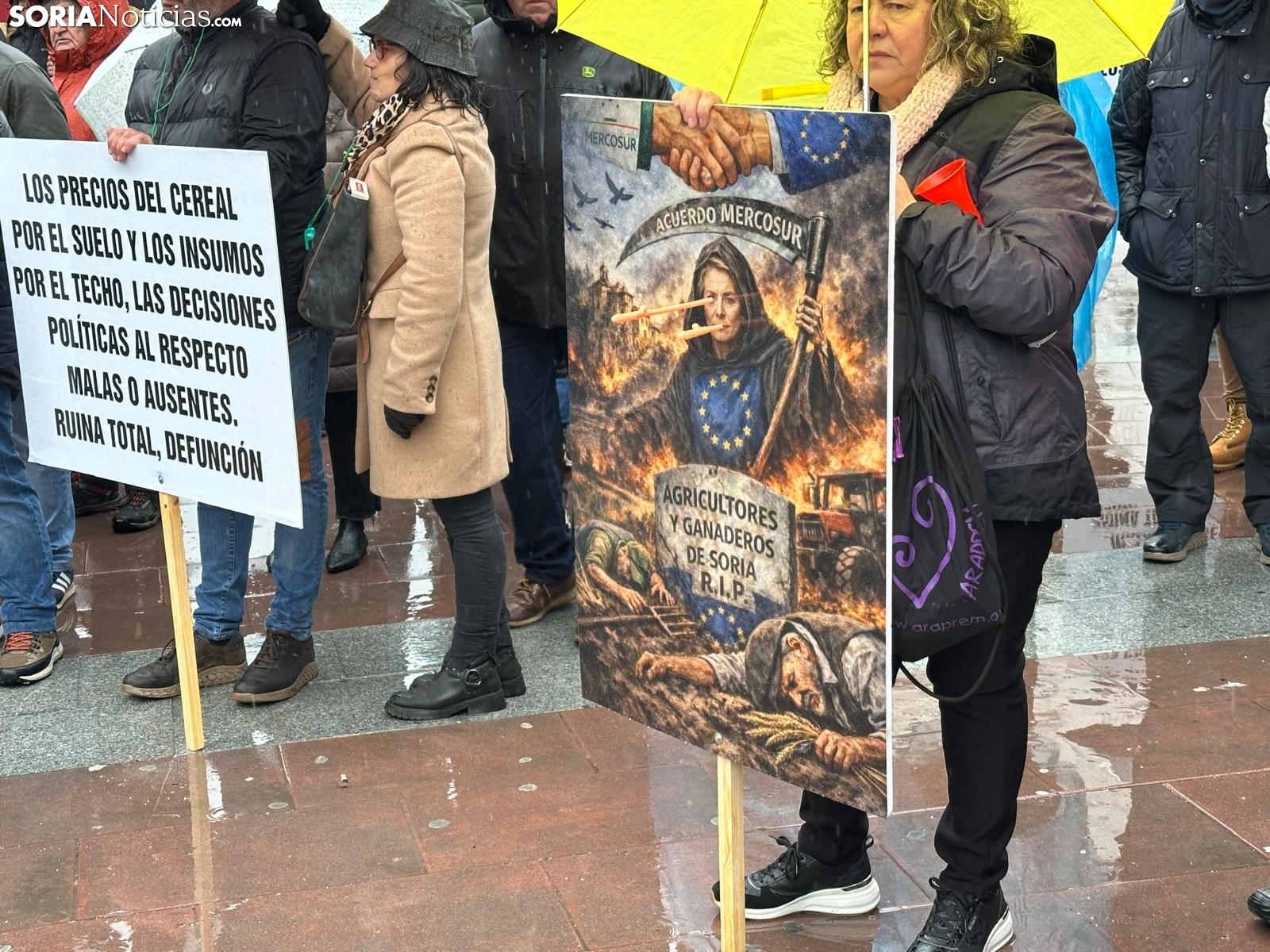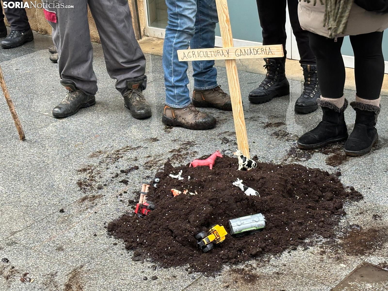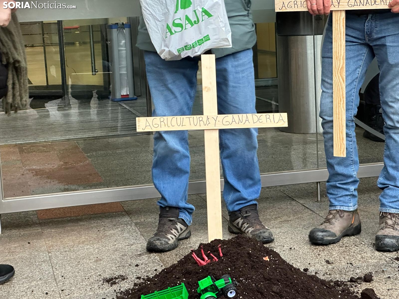 Los agricultores y ganaderos han dicho basta esta mañana en la capital de la provincia. A partir de las 12 de la tarde se han congregado en el inicio de la avenida Mariano Vicén para mostrar su descontento con los acuerdos comerciales firmados por la Unión Europea con Mercosur y otros contratos internacionales que perjudicarán a todos aquellos que forman parte del sector primario en Europa. Tractores y una masa humana han desfilado a lo largo de la avenida hasta llegar a la plaza Mariano Granados. Los silbatos que portaban los viandantes, el claxon de los tractores y un sonido que emulaba a una sirena, dando la voz de alarma, desde un megáfono han sido la sintonía que ha acompañado a la procesión, en la que se simulaba el funeral de la ganadería y la agricultura. En su trayecto han hecho escala en la Delegación Territorial de la Junta de Castilla y León y en la Subdelegación del Gobierno. En ambas paradas, han vertido frente a la puerta de las instituciones un saco de abono y han clavado una cruz de madera, emulando las tumbas de doña Agricultura y Ganadería. Además, han dejado en ambas instituciones cartas dirigidas a Alfonso Fernández-Mañueco y Pedro Sánchez en las que reflejan sus preocupaciones y piden unas mejores condiciones para el sector. Ya en Mariano Granados, ha tenido lugar la lectura del manifiesto y se ha depositado el féretro, con una vistosa corona de flores, para que todo el mundo pueda ver a la difunta Agricultura y Ganadería de Europa.