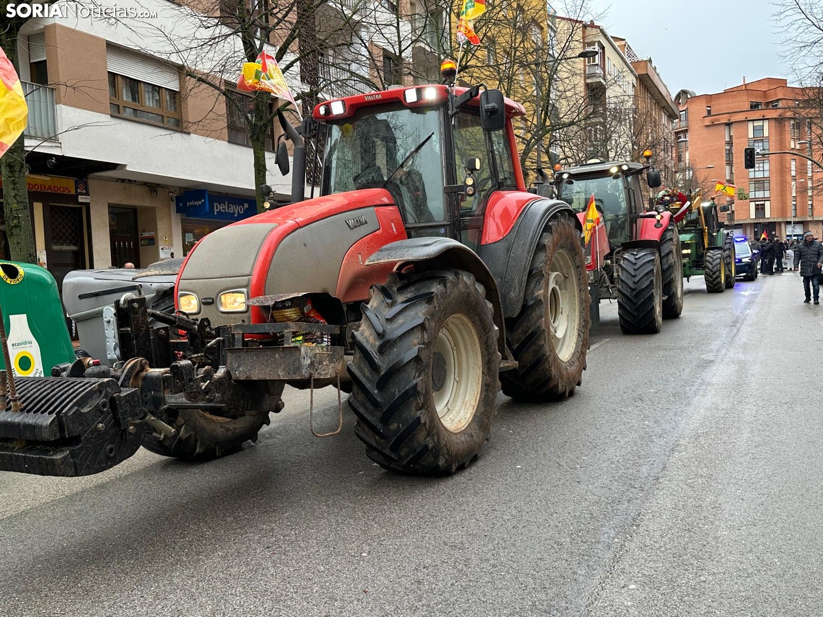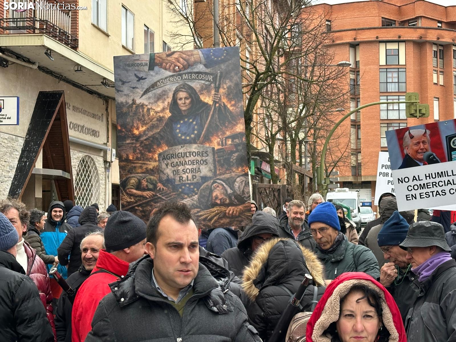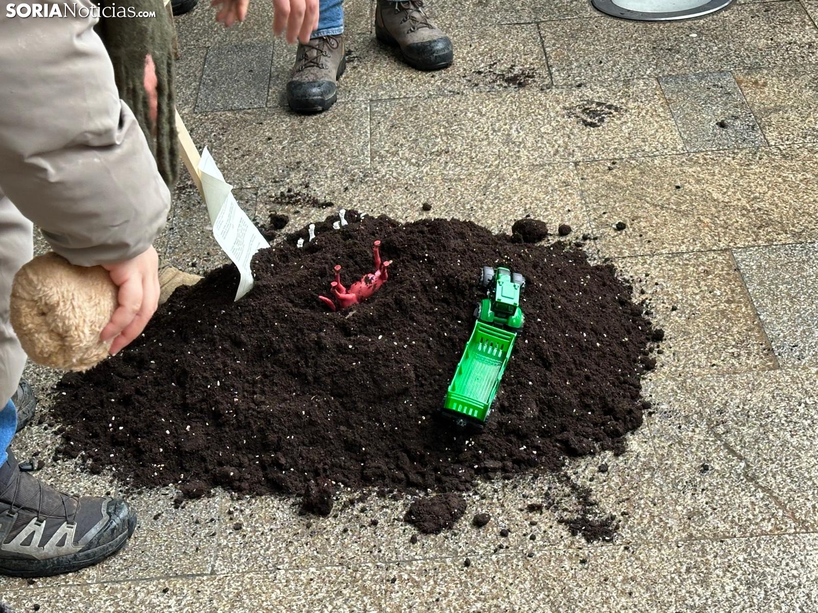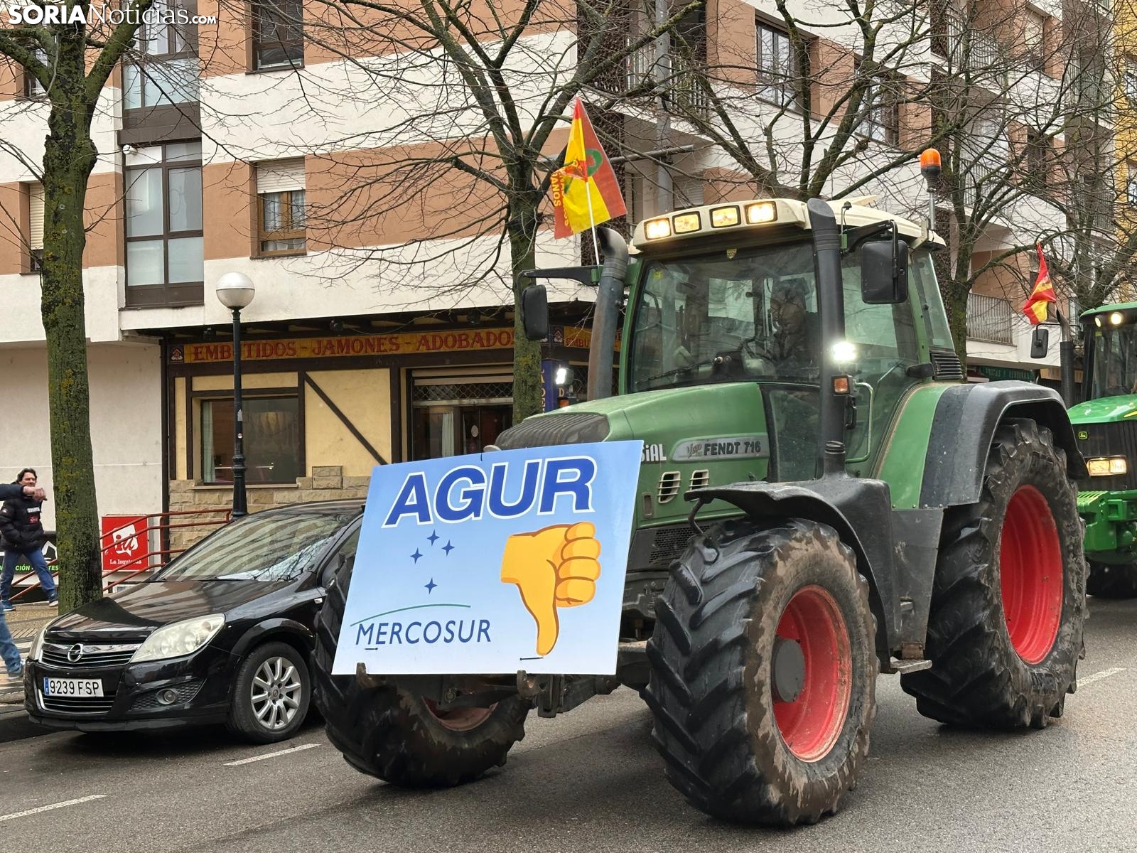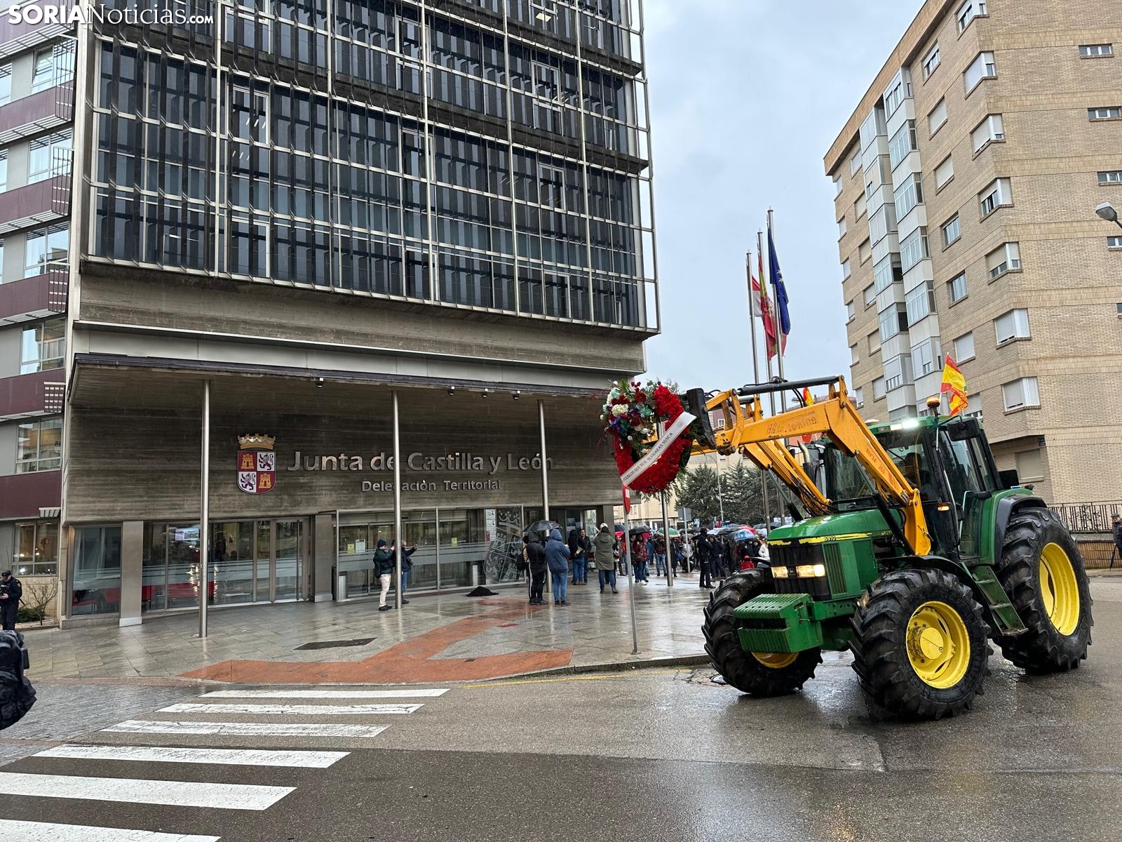 Los agricultores y ganaderos han dicho basta esta mañana en la capital de la provincia. A partir de las 12 de la tarde se han congregado en el inicio de la avenida Mariano Vicén para mostrar su descontento con los acuerdos comerciales firmados por la Unión Europea con Mercosur y otros contratos internacionales que perjudicarán a todos aquellos que forman parte del sector primario en Europa. Tractores y una masa humana han desfilado a lo largo de la avenida hasta llegar a la plaza Mariano Granados. Los silbatos que portaban los viandantes, el claxon de los tractores y un sonido que emulaba a una sirena, dando la voz de alarma, desde un megáfono han sido la sintonía que ha acompañado a la procesión, en la que se simulaba el funeral de la ganadería y la agricultura. En su trayecto han hecho escala en la Delegación Territorial de la Junta de Castilla y León y en la Subdelegación del Gobierno. En ambas paradas, han vertido frente a la puerta de las instituciones un saco de abono y han clavado una cruz de madera, emulando las tumbas de doña Agricultura y Ganadería. Además, han dejado en ambas instituciones cartas dirigidas a Alfonso Fernández-Mañueco y Pedro Sánchez en las que reflejan sus preocupaciones y piden unas mejores condiciones para el sector. Ya en Mariano Granados, ha tenido lugar la lectura del manifiesto y se ha depositado el féretro, con una vistosa corona de flores, para que todo el mundo pueda ver a la difunta Agricultura y Ganadería de Europa.