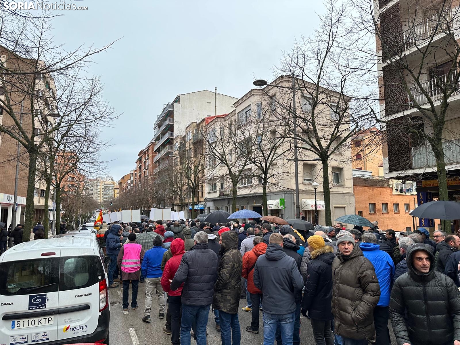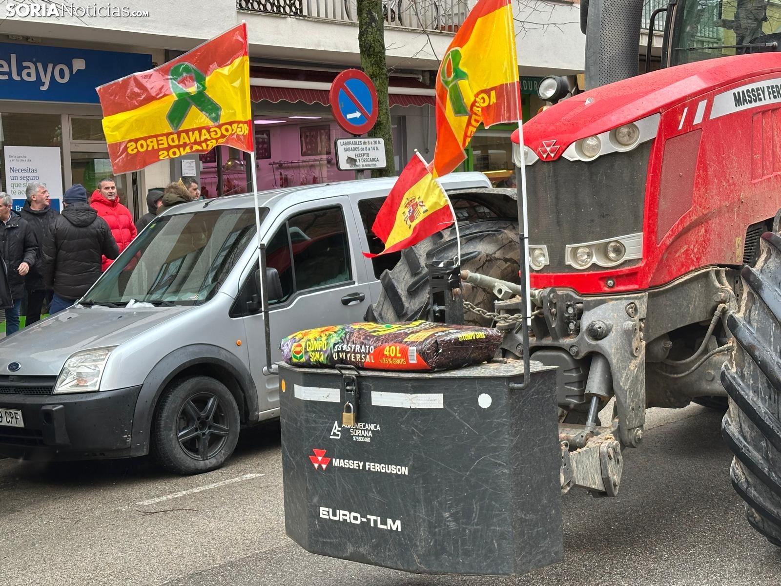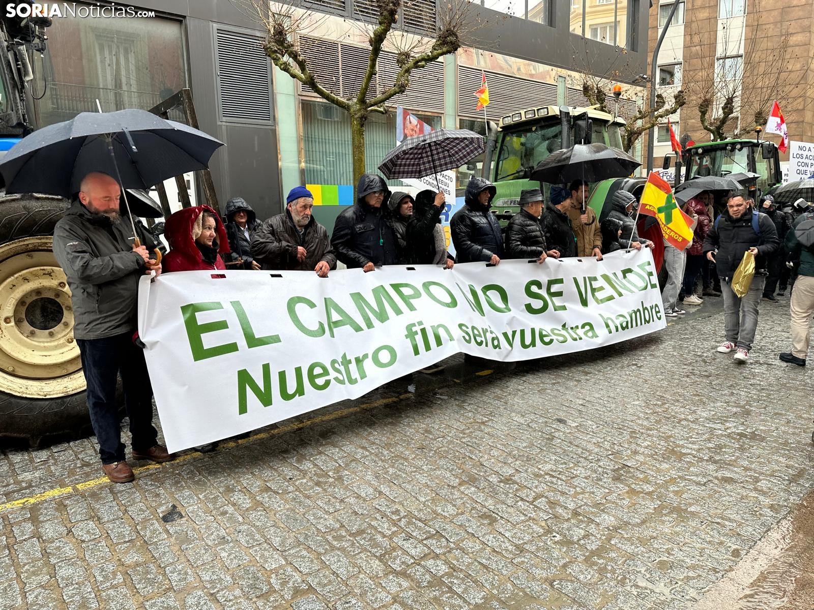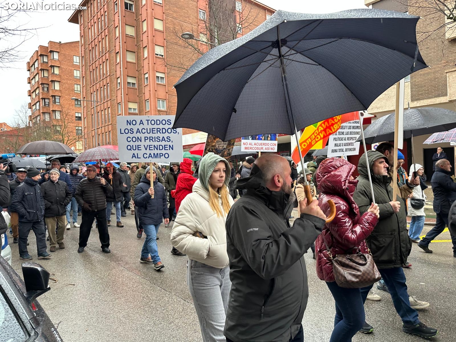 Los agricultores y ganaderos han dicho basta esta mañana en la capital de la provincia. A partir de las 12 de la tarde se han congregado en el inicio de la avenida Mariano Vicén para mostrar su descontento con los acuerdos comerciales firmados por la Unión Europea con Mercosur y otros contratos internacionales que perjudicarán a todos aquellos que forman parte del sector primario en Europa. Tractores y una masa humana han desfilado a lo largo de la avenida hasta llegar a la plaza Mariano Granados. Los silbatos que portaban los viandantes, el claxon de los tractores y un sonido que emulaba a una sirena, dando la voz de alarma, desde un megáfono han sido la sintonía que ha acompañado a la procesión, en la que se simulaba el funeral de la ganadería y la agricultura. En su trayecto han hecho escala en la Delegación Territorial de la Junta de Castilla y León y en la Subdelegación del Gobierno. En ambas paradas, han vertido frente a la puerta de las instituciones un saco de abono y han clavado una cruz de madera, emulando las tumbas de doña Agricultura y Ganadería. Además, han dejado en ambas instituciones cartas dirigidas a Alfonso Fernández-Mañueco y Pedro Sánchez en las que reflejan sus preocupaciones y piden unas mejores condiciones para el sector. Ya en Mariano Granados, ha tenido lugar la lectura del manifiesto y se ha depositado el féretro, con una vistosa corona de flores, para que todo el mundo pueda ver a la difunta Agricultura y Ganadería de Europa.