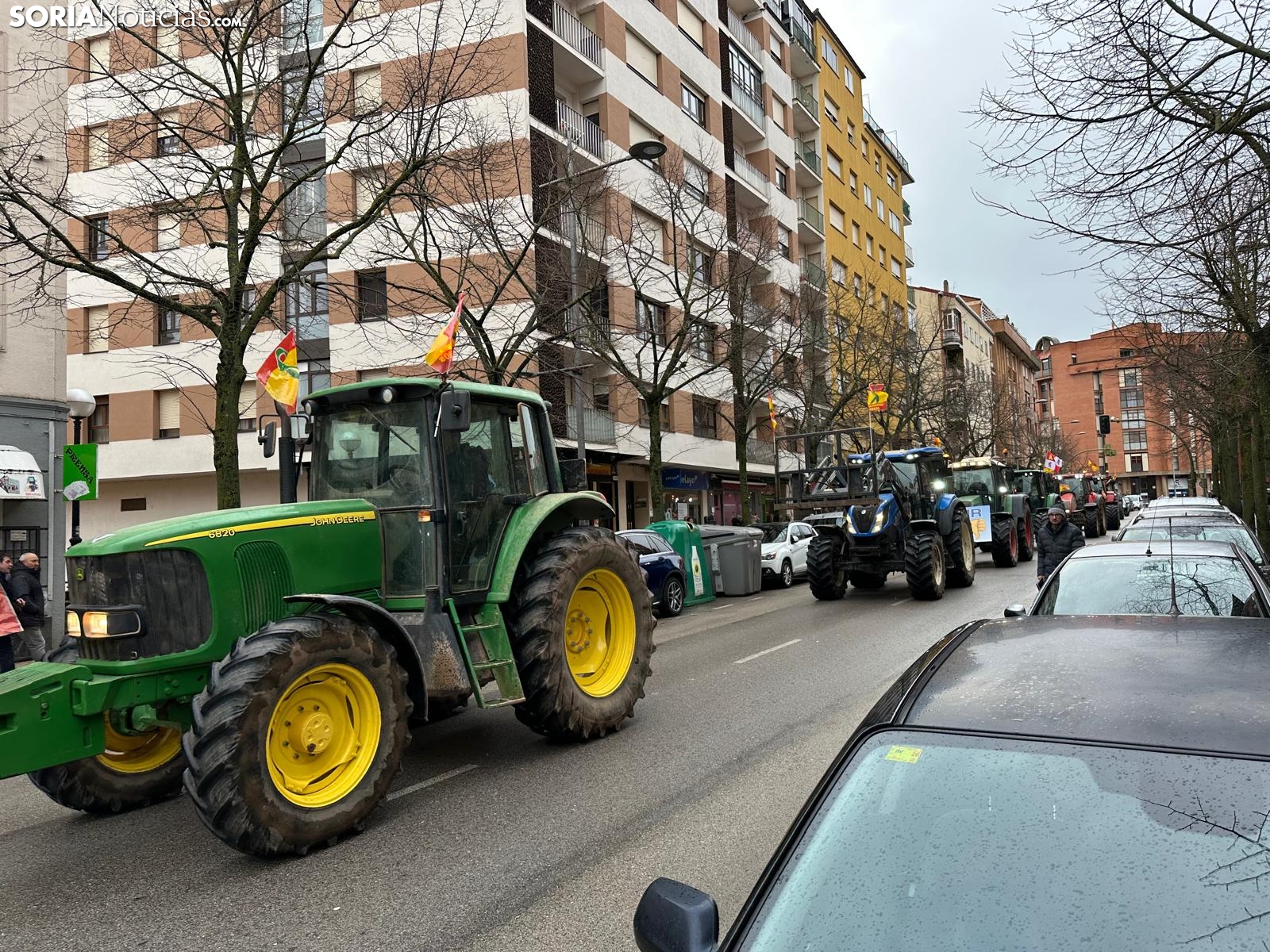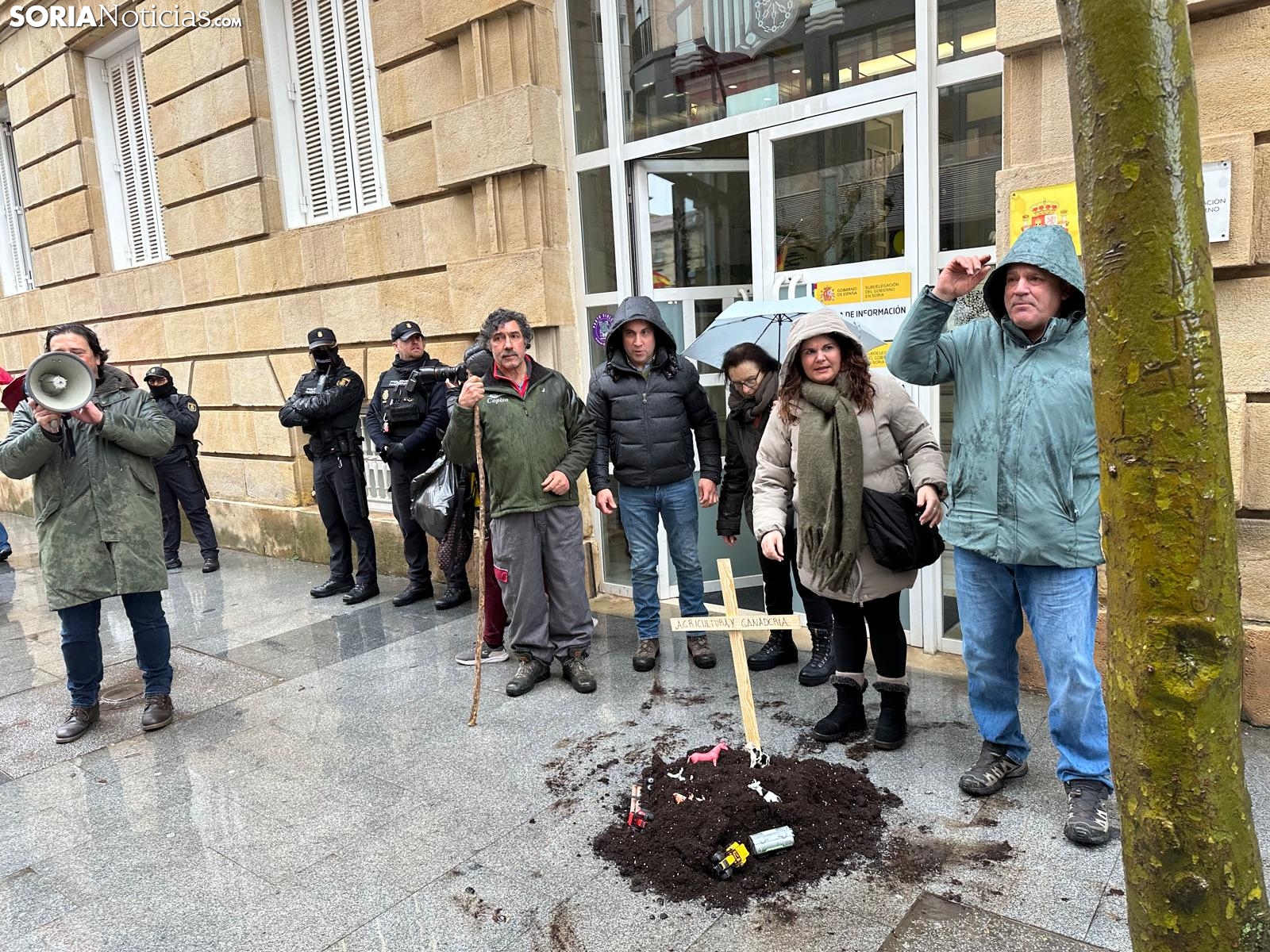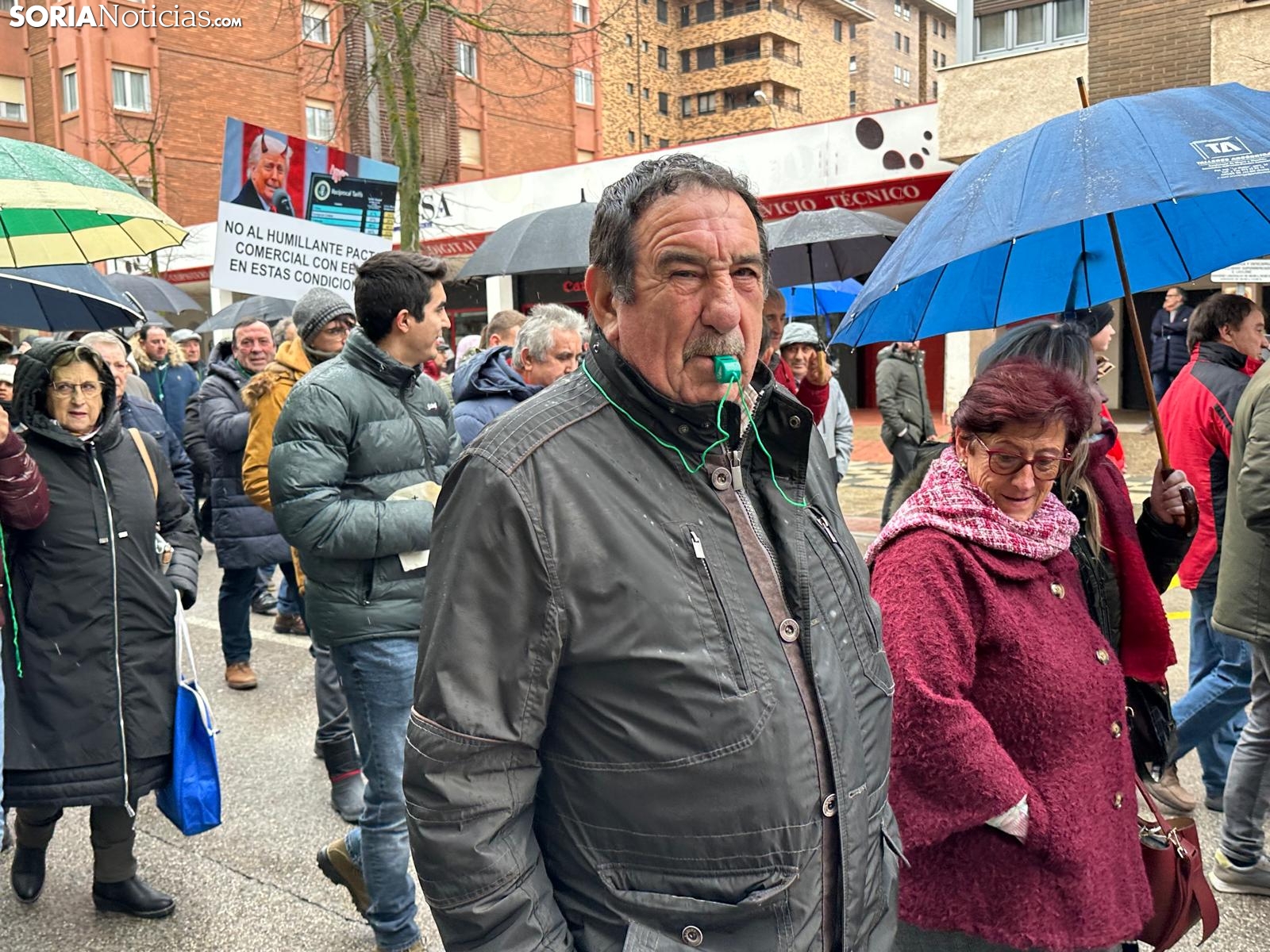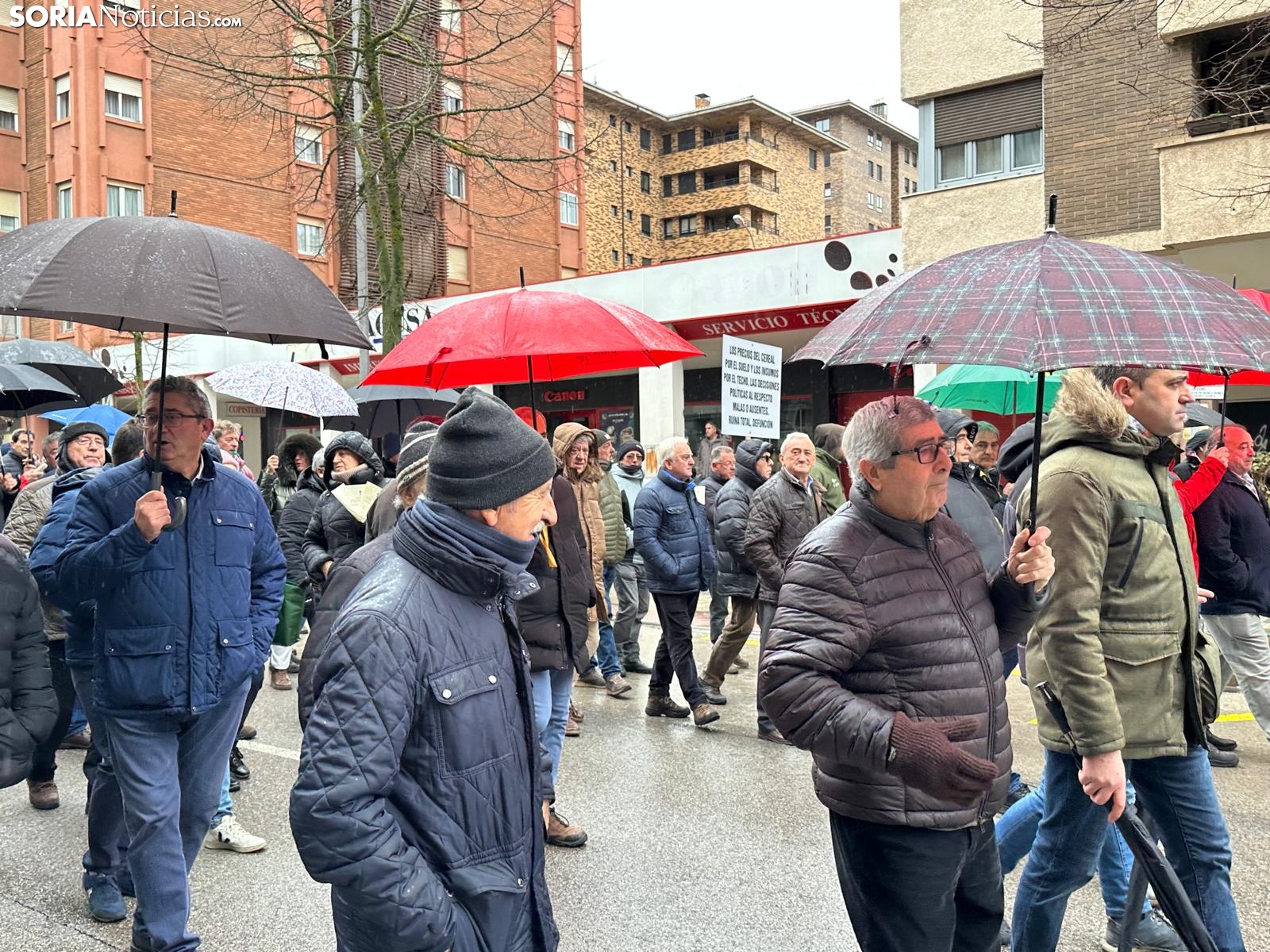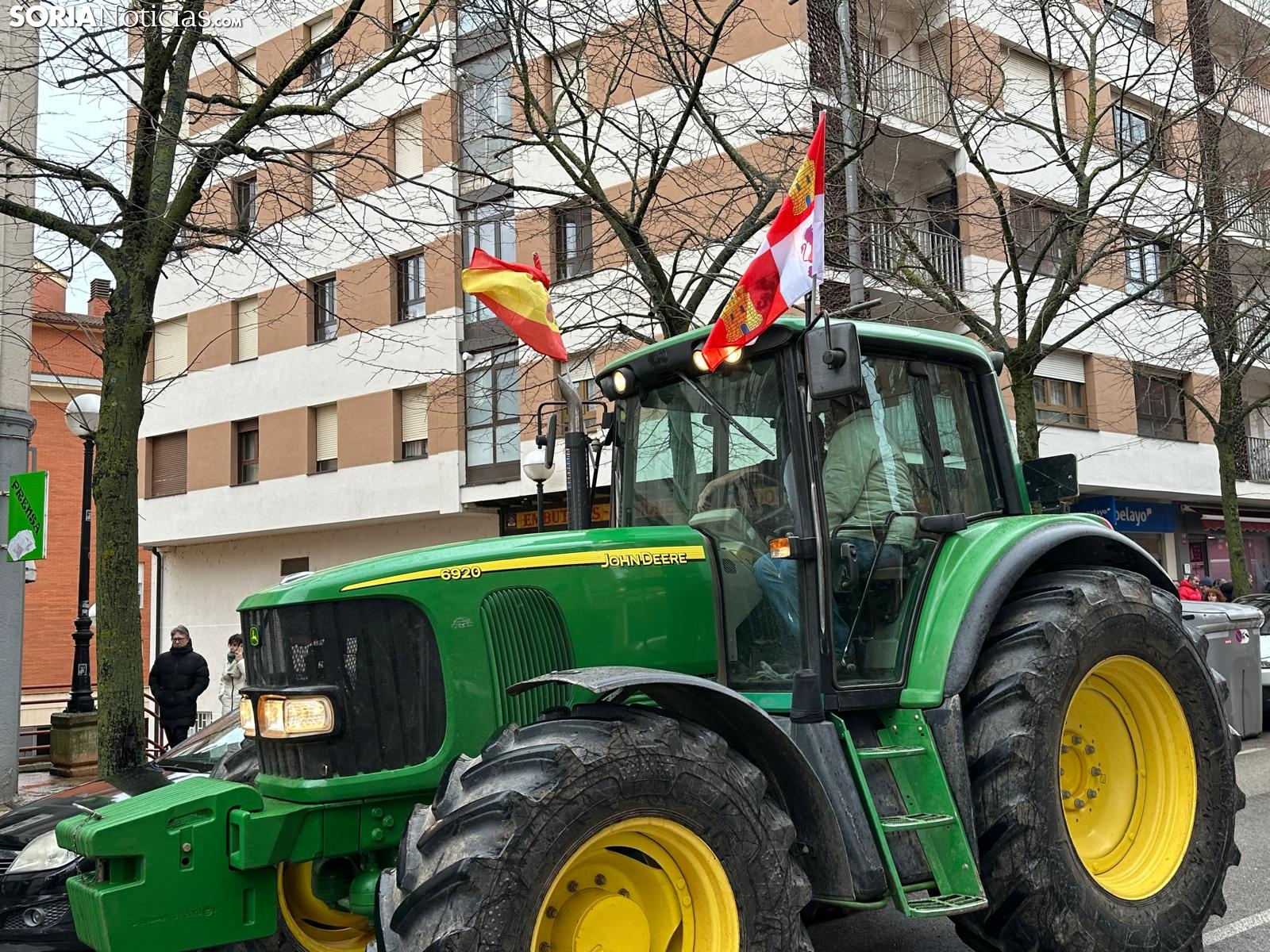 Los agricultores y ganaderos han dicho basta esta mañana en la capital de la provincia. A partir de las 12 de la tarde se han congregado en el inicio de la avenida Mariano Vicén para mostrar su descontento con los acuerdos comerciales firmados por la Unión Europea con Mercosur y otros contratos internacionales que perjudicarán a todos aquellos que forman parte del sector primario en Europa. Tractores y una masa humana han desfilado a lo largo de la avenida hasta llegar a la plaza Mariano Granados. Los silbatos que portaban los viandantes, el claxon de los tractores y un sonido que emulaba a una sirena, dando la voz de alarma, desde un megáfono han sido la sintonía que ha acompañado a la procesión, en la que se simulaba el funeral de la ganadería y la agricultura. En su trayecto han hecho escala en la Delegación Territorial de la Junta de Castilla y León y en la Subdelegación del Gobierno. En ambas paradas, han vertido frente a la puerta de las instituciones un saco de abono y han clavado una cruz de madera, emulando las tumbas de doña Agricultura y Ganadería. Además, han dejado en ambas instituciones cartas dirigidas a Alfonso Fernández-Mañueco y Pedro Sánchez en las que reflejan sus preocupaciones y piden unas mejores condiciones para el sector. Ya en Mariano Granados, ha tenido lugar la lectura del manifiesto y se ha depositado el féretro, con una vistosa corona de flores, para que todo el mundo pueda ver a la difunta Agricultura y Ganadería de Europa.