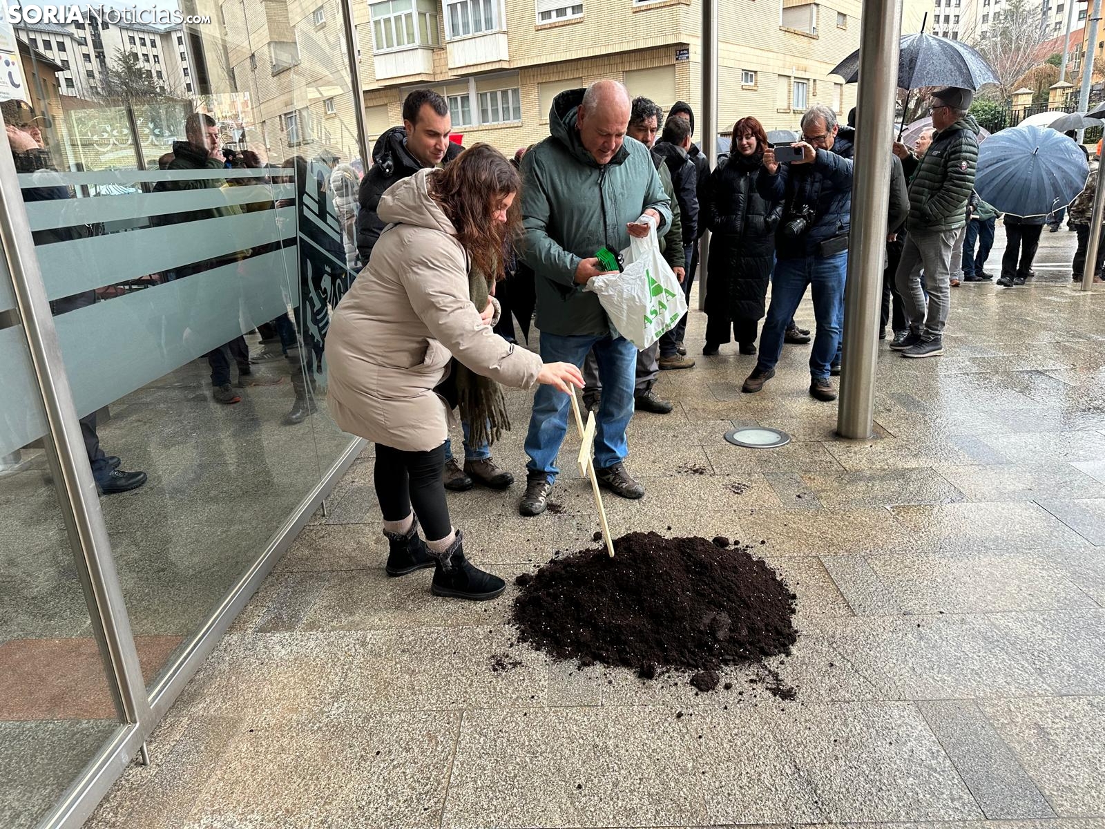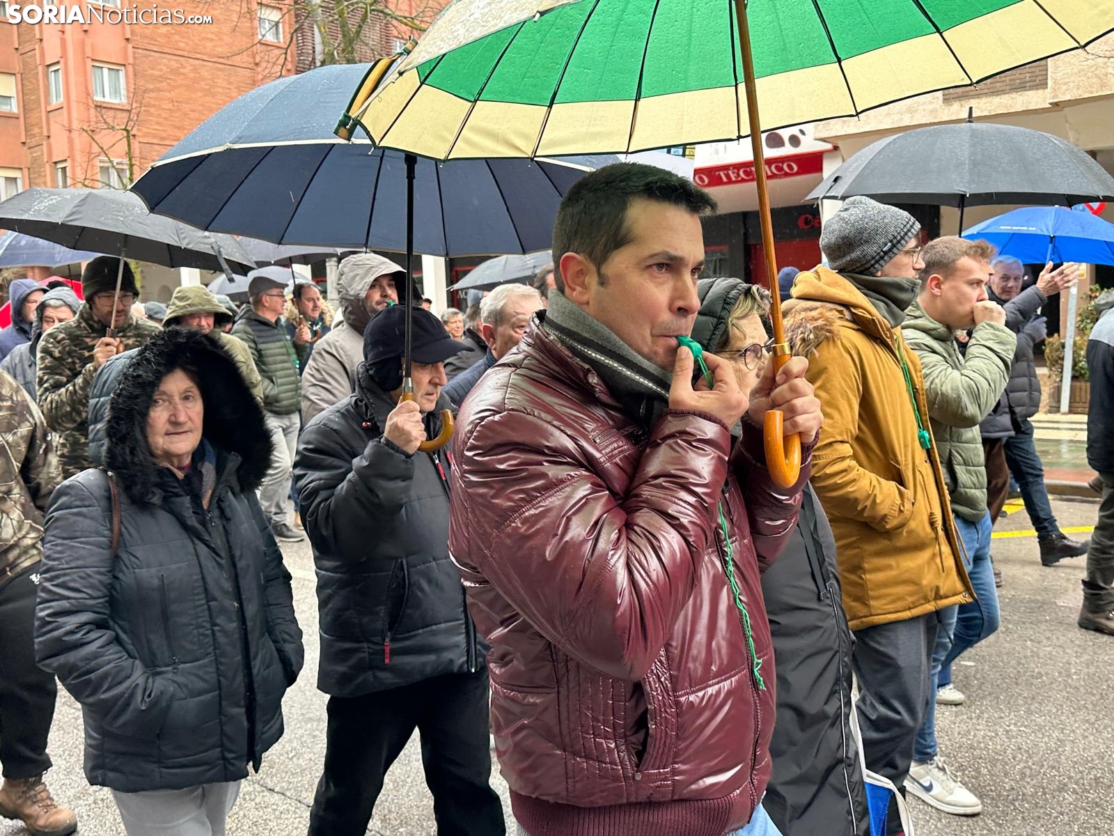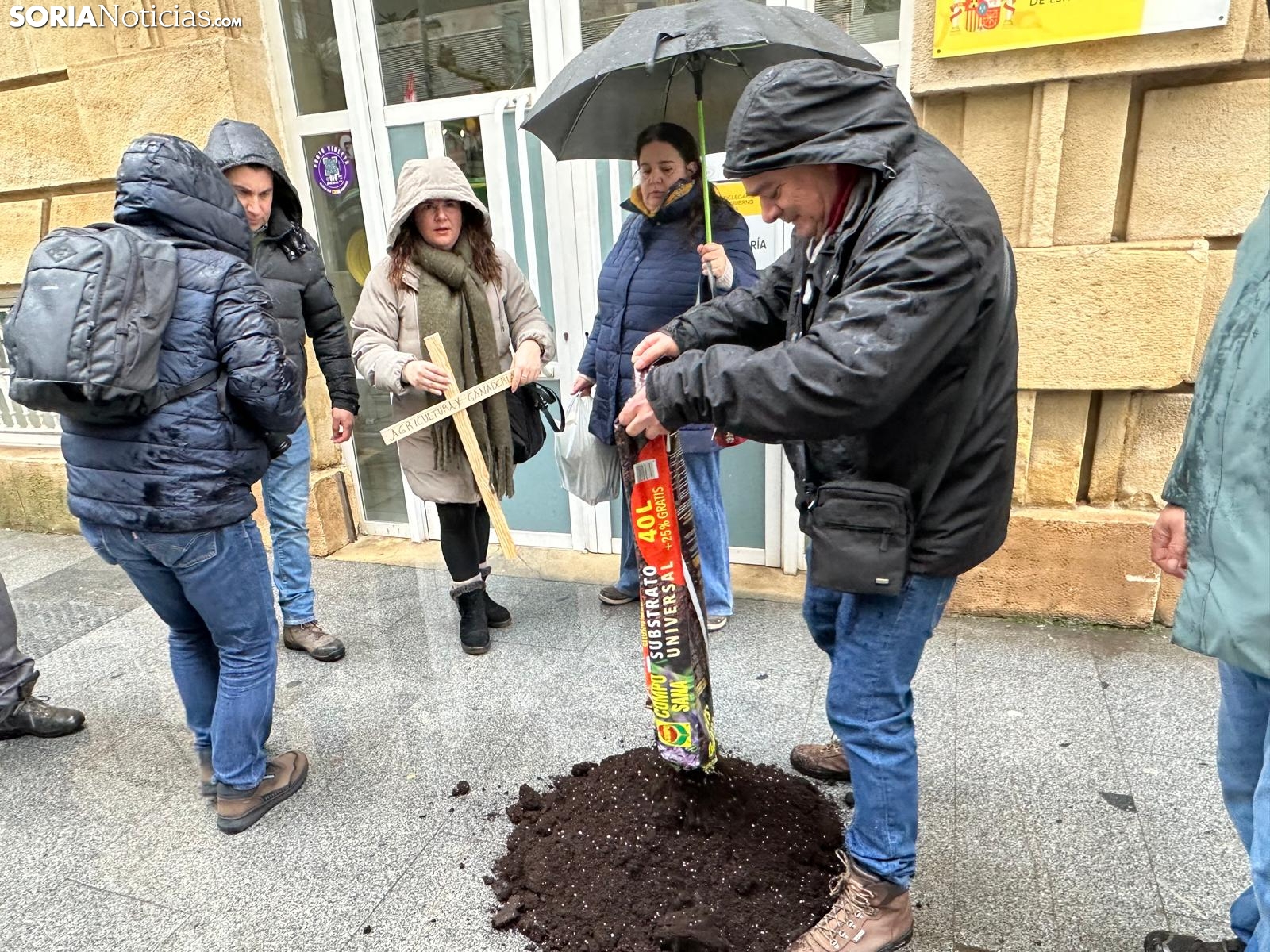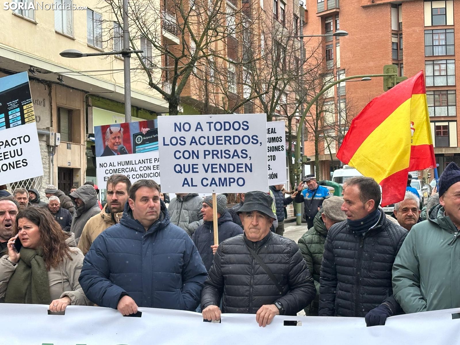 Los agricultores y ganaderos han dicho basta esta mañana en la capital de la provincia. A partir de las 12 de la tarde se han congregado en el inicio de la avenida Mariano Vicén para mostrar su descontento con los acuerdos comerciales firmados por la Unión Europea con Mercosur y otros contratos internacionales que perjudicarán a todos aquellos que forman parte del sector primario en Europa. Tractores y una masa humana han desfilado a lo largo de la avenida hasta llegar a la plaza Mariano Granados. Los silbatos que portaban los viandantes, el claxon de los tractores y un sonido que emulaba a una sirena, dando la voz de alarma, desde un megáfono han sido la sintonía que ha acompañado a la procesión, en la que se simulaba el funeral de la ganadería y la agricultura. En su trayecto han hecho escala en la Delegación Territorial de la Junta de Castilla y León y en la Subdelegación del Gobierno. En ambas paradas, han vertido frente a la puerta de las instituciones un saco de abono y han clavado una cruz de madera, emulando las tumbas de doña Agricultura y Ganadería. Además, han dejado en ambas instituciones cartas dirigidas a Alfonso Fernández-Mañueco y Pedro Sánchez en las que reflejan sus preocupaciones y piden unas mejores condiciones para el sector. Ya en Mariano Granados, ha tenido lugar la lectura del manifiesto y se ha depositado el féretro, con una vistosa corona de flores, para que todo el mundo pueda ver a la difunta Agricultura y Ganadería de Europa.
