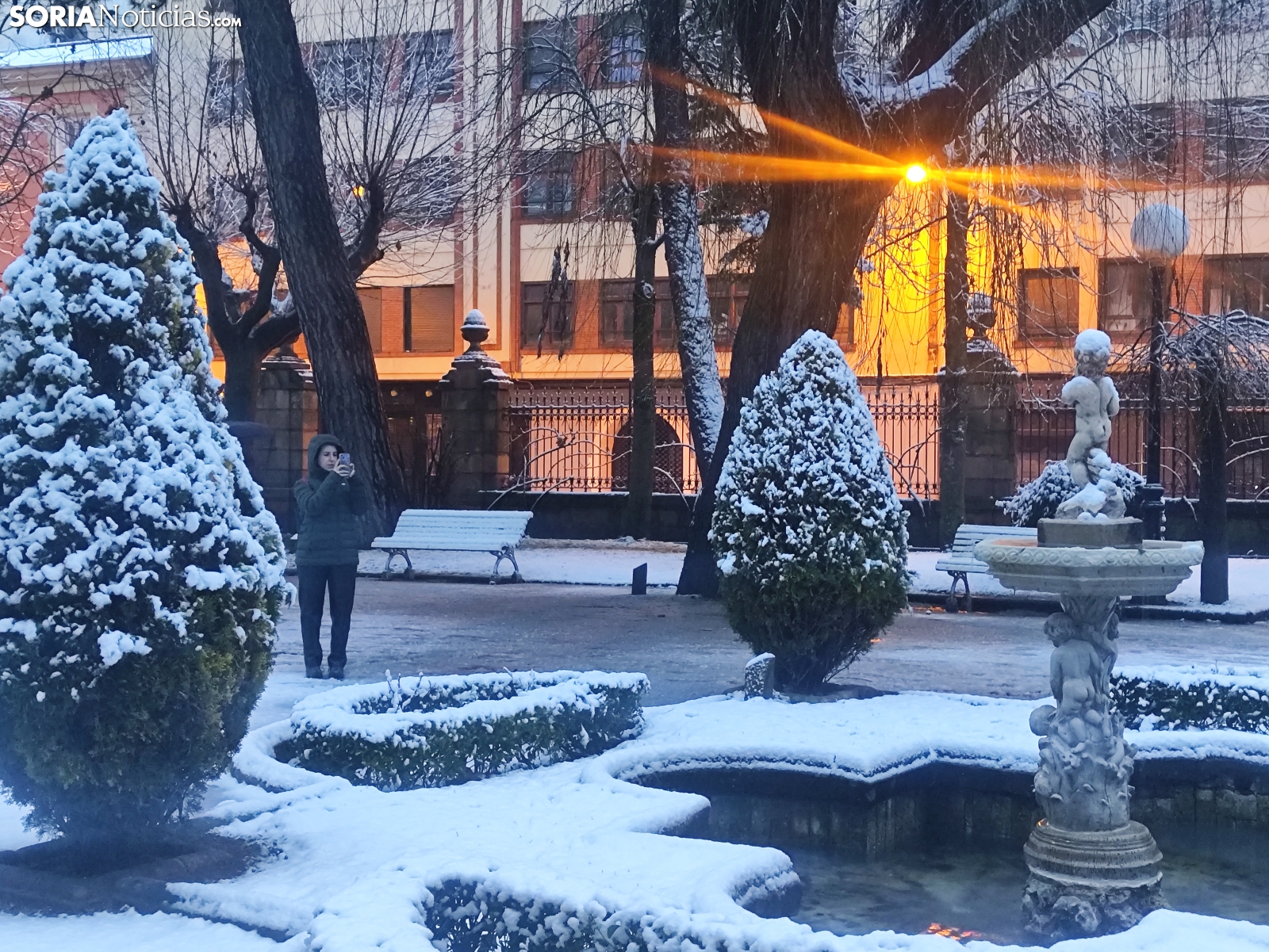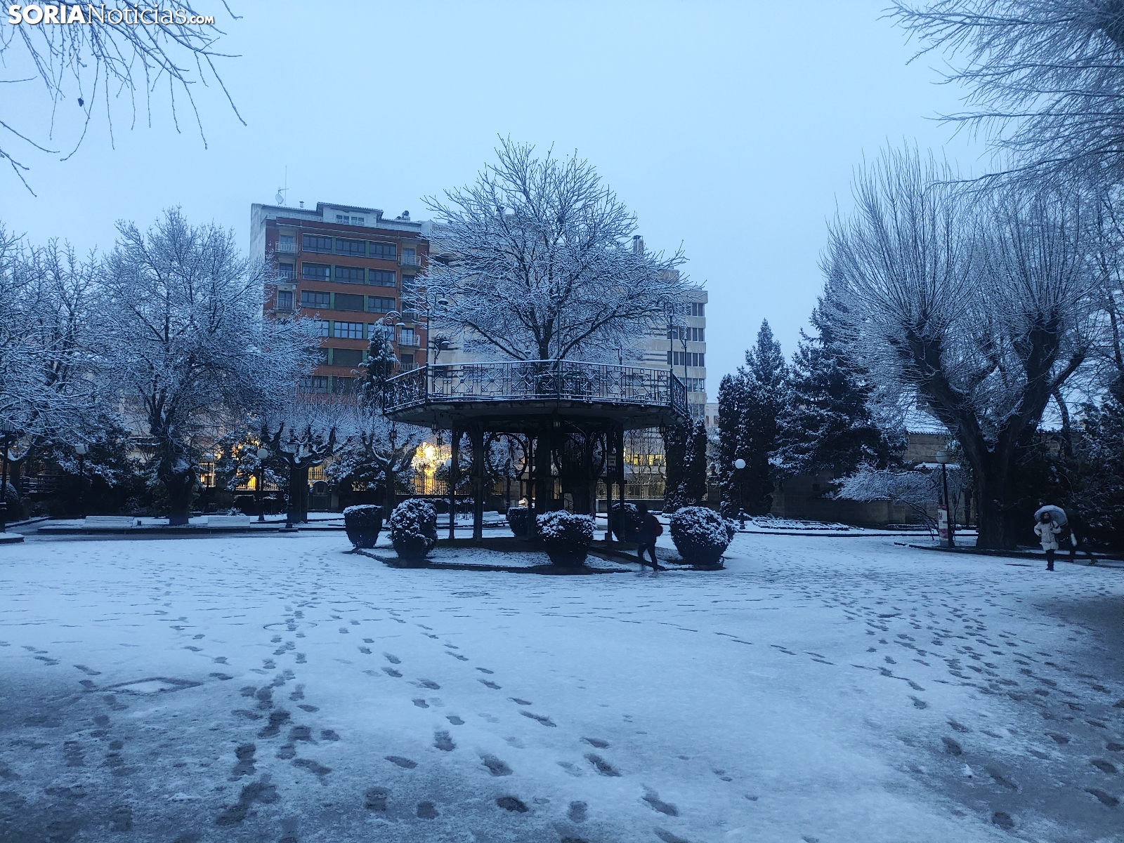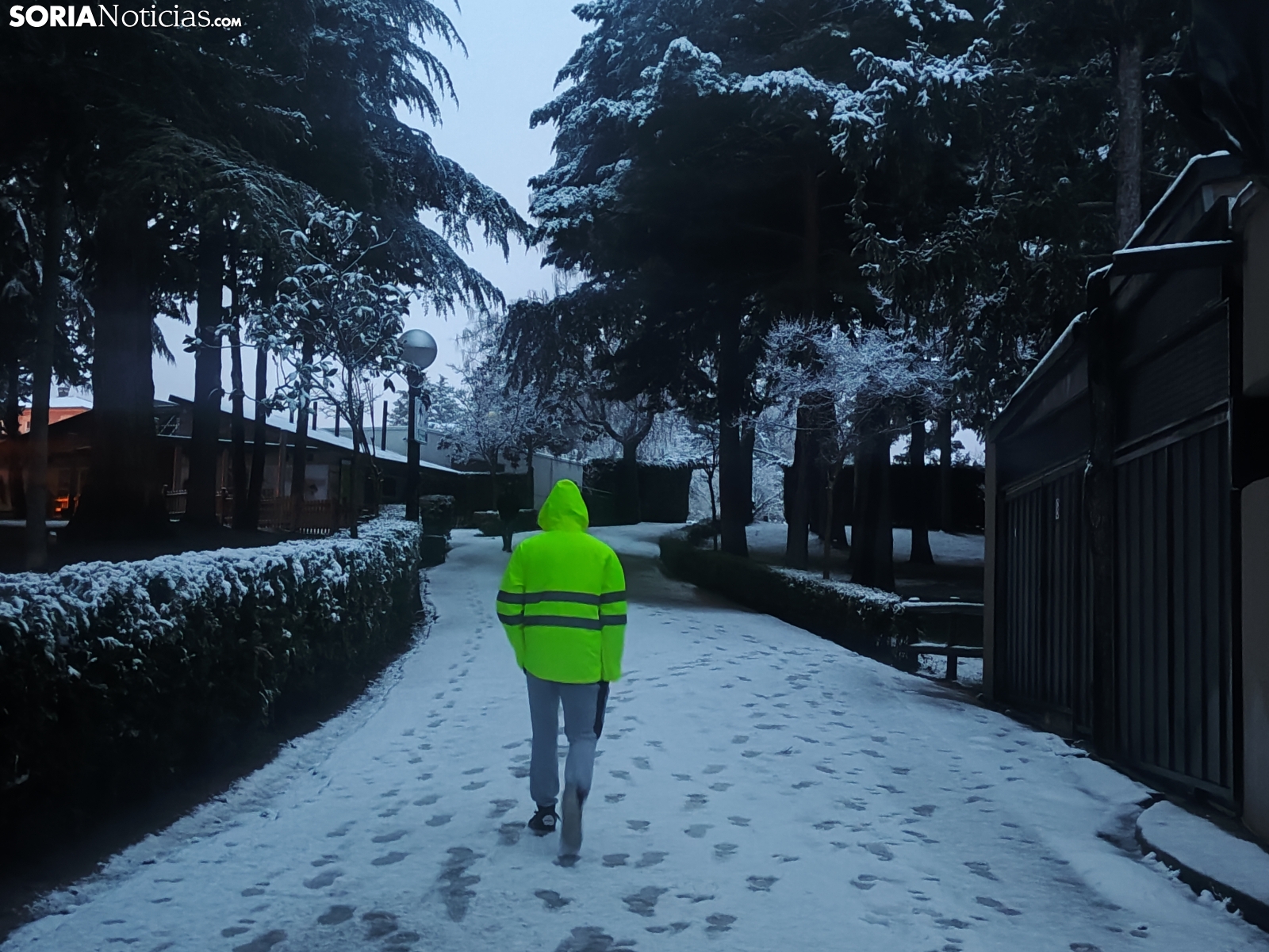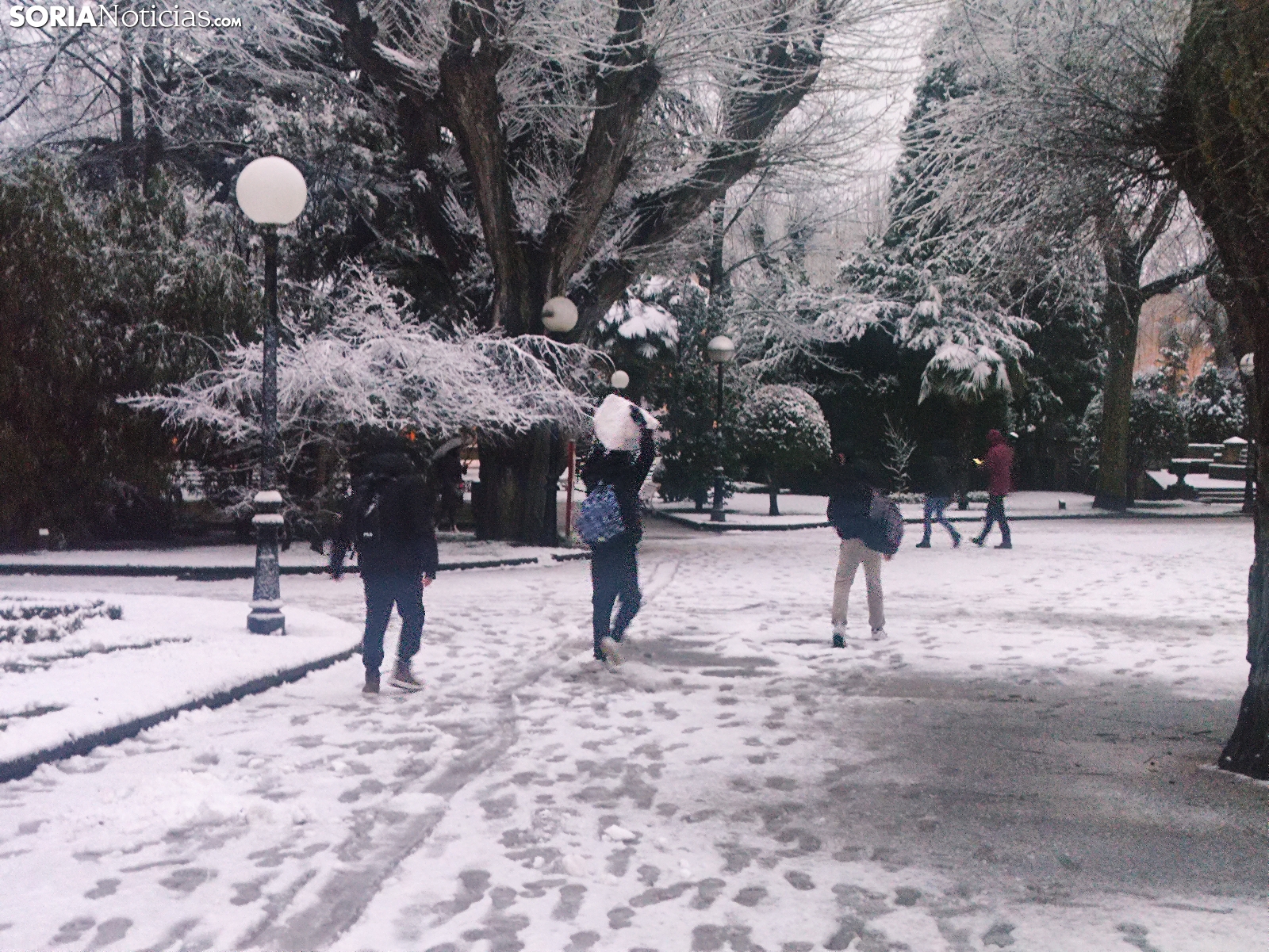 Las previsiones de la Aemet se han cumplido y la nieve nos ha dado los buenos días este miércoles. La circulación, con precaución, era escasa a primera hora. La entrada a los colegios y a los puestos de trabajo complicará la mañana. La nevada no ha sido muy prolongada, pero en menos de una hora entre las 5 y las 7 de la mañana tanto las aceras como las carreteras de la capital se han cubierto. Una capa de nieve de 2 o 3 centímetros bajo la cual en algunos rincones se escondían placas de hielo. Mientras cientos de soriano acudían renegados a su trabajo con muy cuidado y muy despacio, otros más jóvenes disfrutaban de la nieva en el parque de la Dehesa camino a los colegios e institutos.