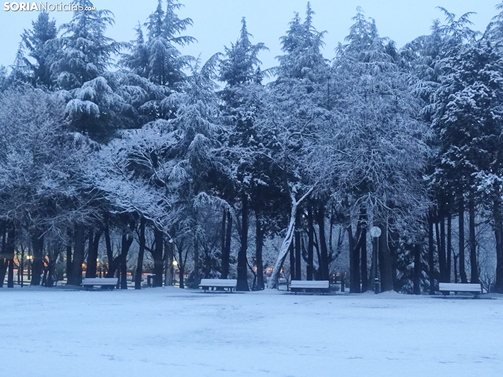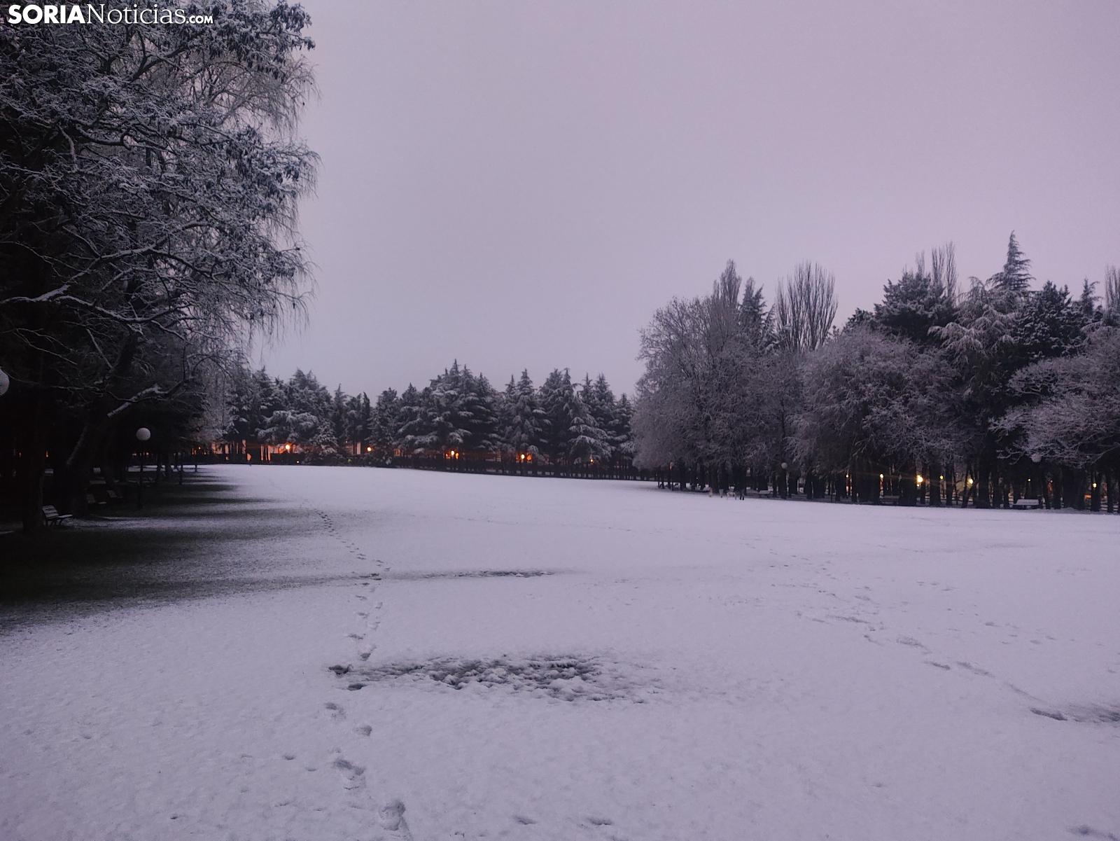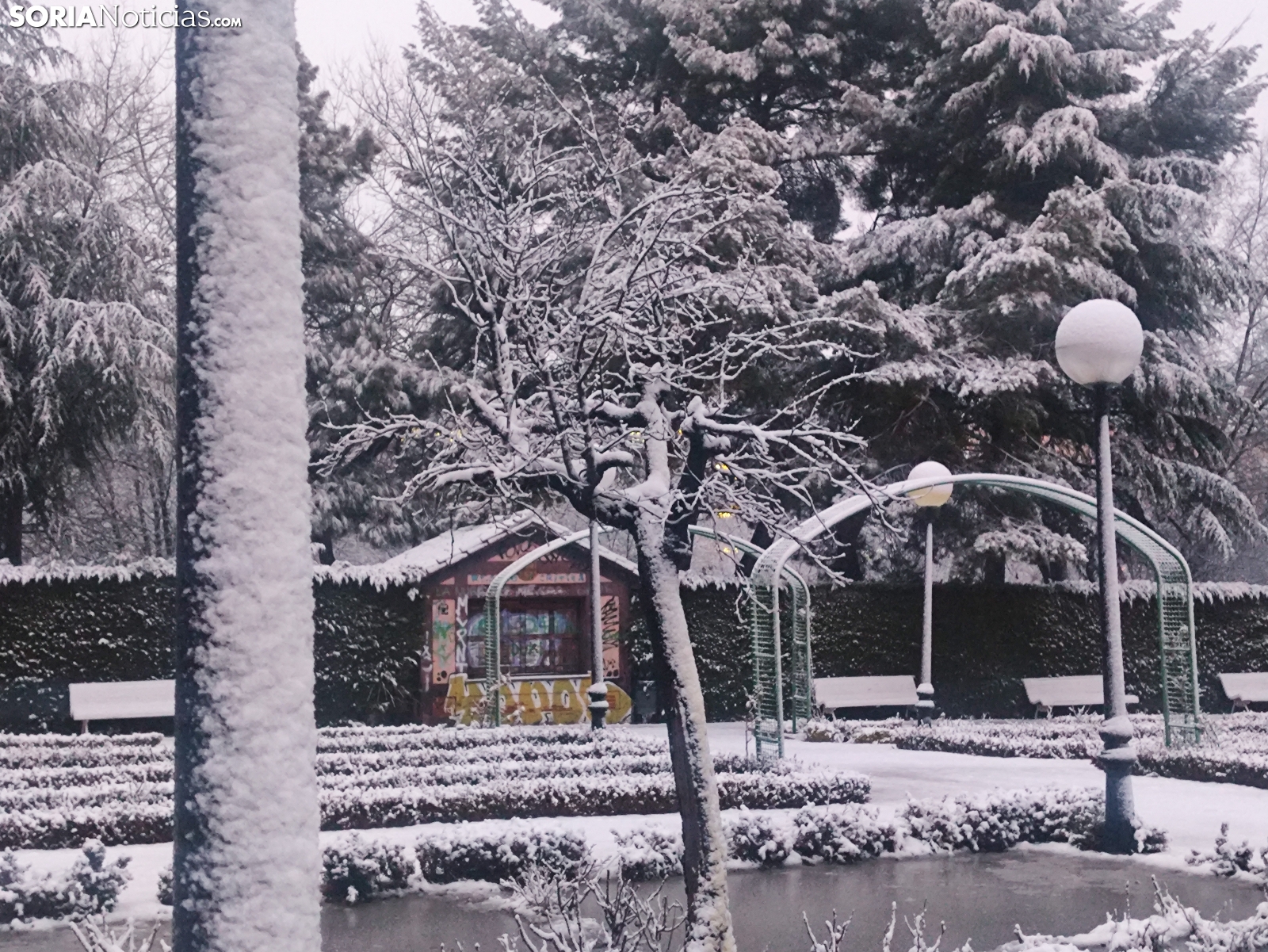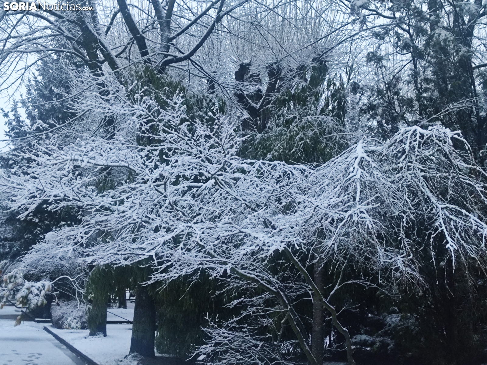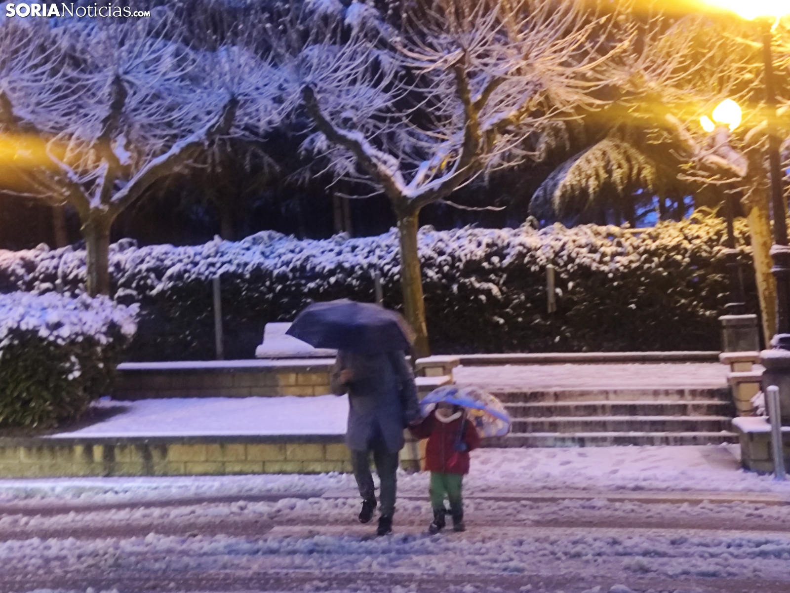 Las previsiones de la Aemet se han cumplido y la nieve nos ha dado los buenos días este miércoles. La circulación, con precaución, era escasa a primera hora. La entrada a los colegios y a los puestos de trabajo complicará la mañana. La nevada no ha sido muy prolongada, pero en menos de una hora entre las 5 y las 7 de la mañana tanto las aceras como las carreteras de la capital se han cubierto. Una capa de nieve de 2 o 3 centímetros bajo la cual en algunos rincones se escondían placas de hielo. Mientras cientos de soriano acudían renegados a su trabajo con muy cuidado y muy despacio, otros más jóvenes disfrutaban de la nieva en el parque de la Dehesa camino a los colegios e institutos.