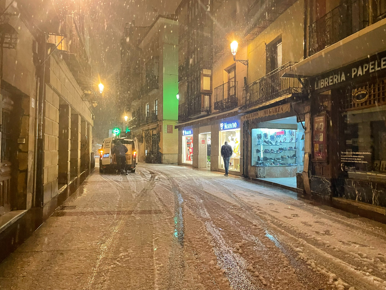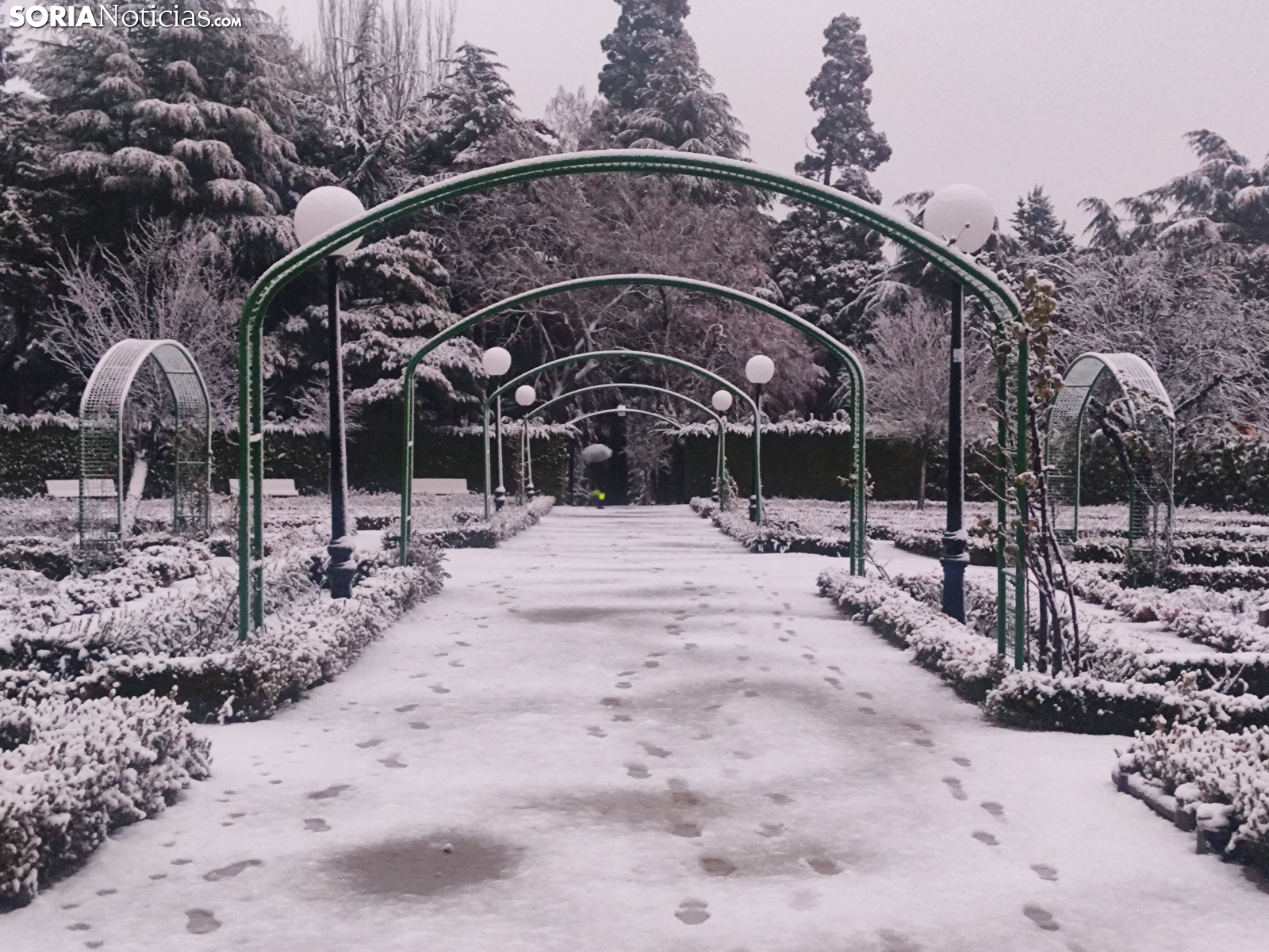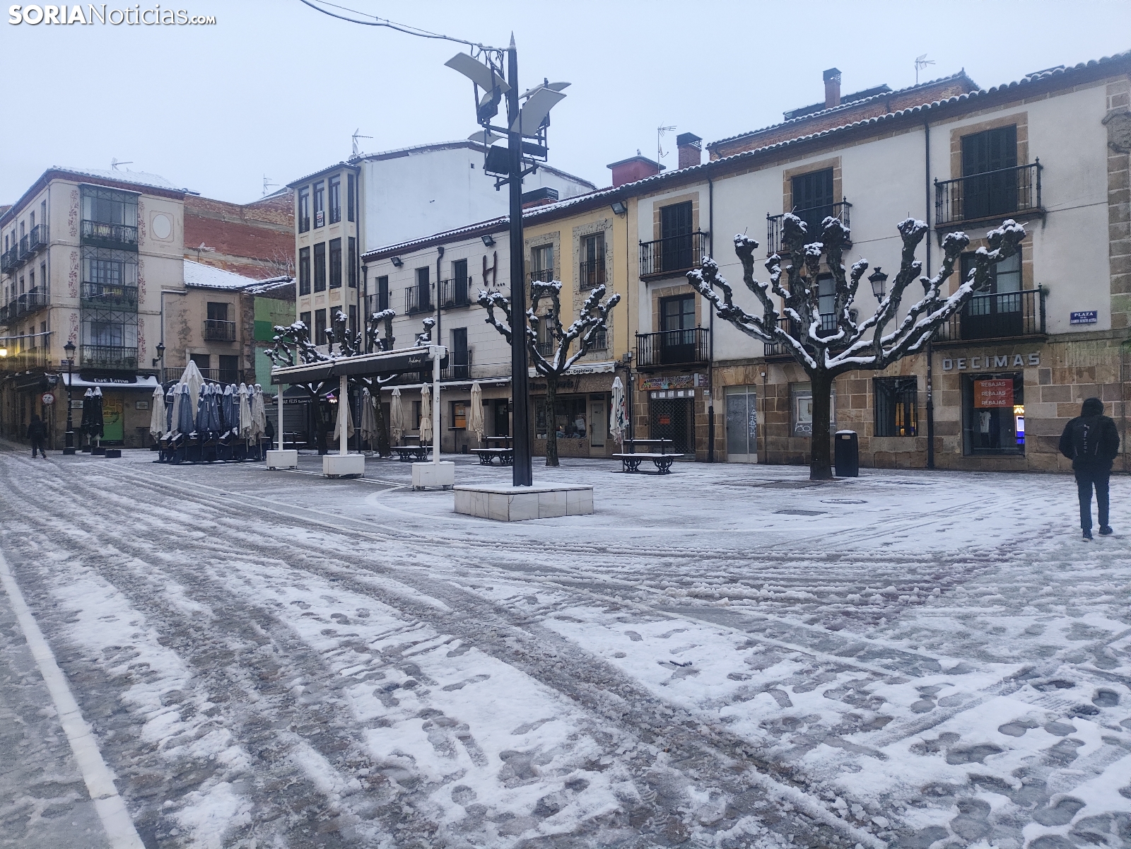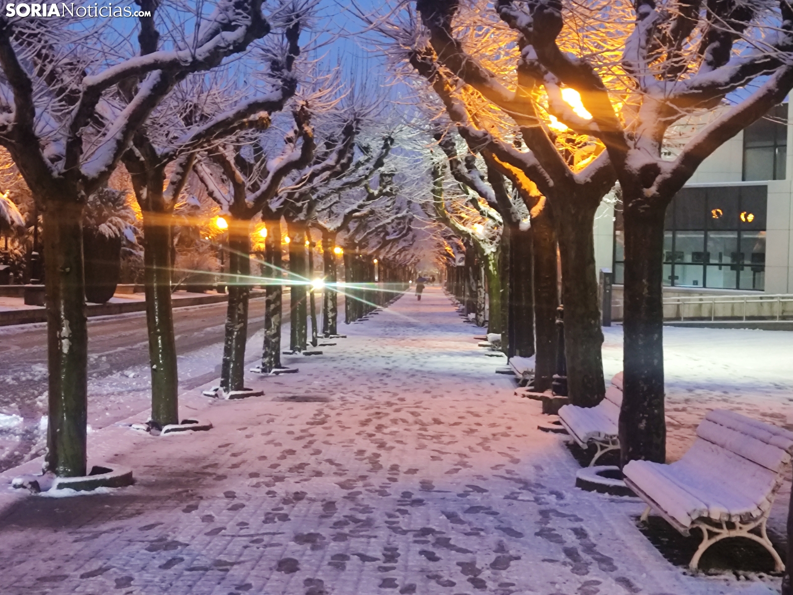Las previsiones de la Aemet se han cumplido y la nieve nos ha dado los buenos días este miércoles. La circulación, con precaución, era escasa a primera hora. La entrada a los colegios y a los puestos de trabajo complicará la mañana. La nevada no ha sido muy prolongada, pero en menos de una hora entre las 5 y las 7 de la mañana tanto las aceras como las carreteras de la capital se han cubierto. Una capa de nieve de 2 o 3 centímetros bajo la cual en algunos rincones se escondían placas de hielo. Mientras cientos de soriano acudían renegados a su trabajo con muy cuidado y muy despacio, otros más jóvenes disfrutaban de la nieva en el parque de la Dehesa camino a los colegios e institutos.