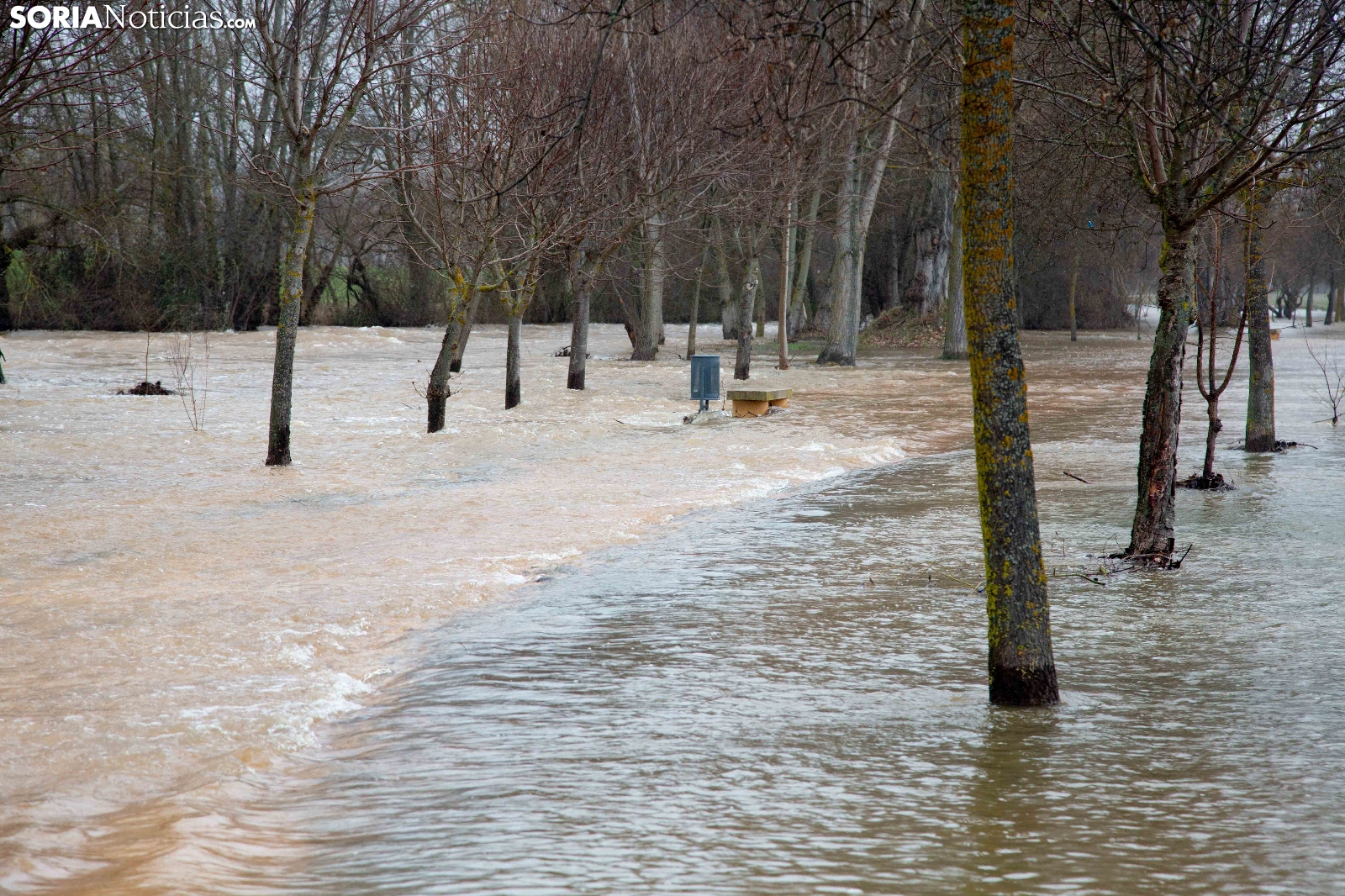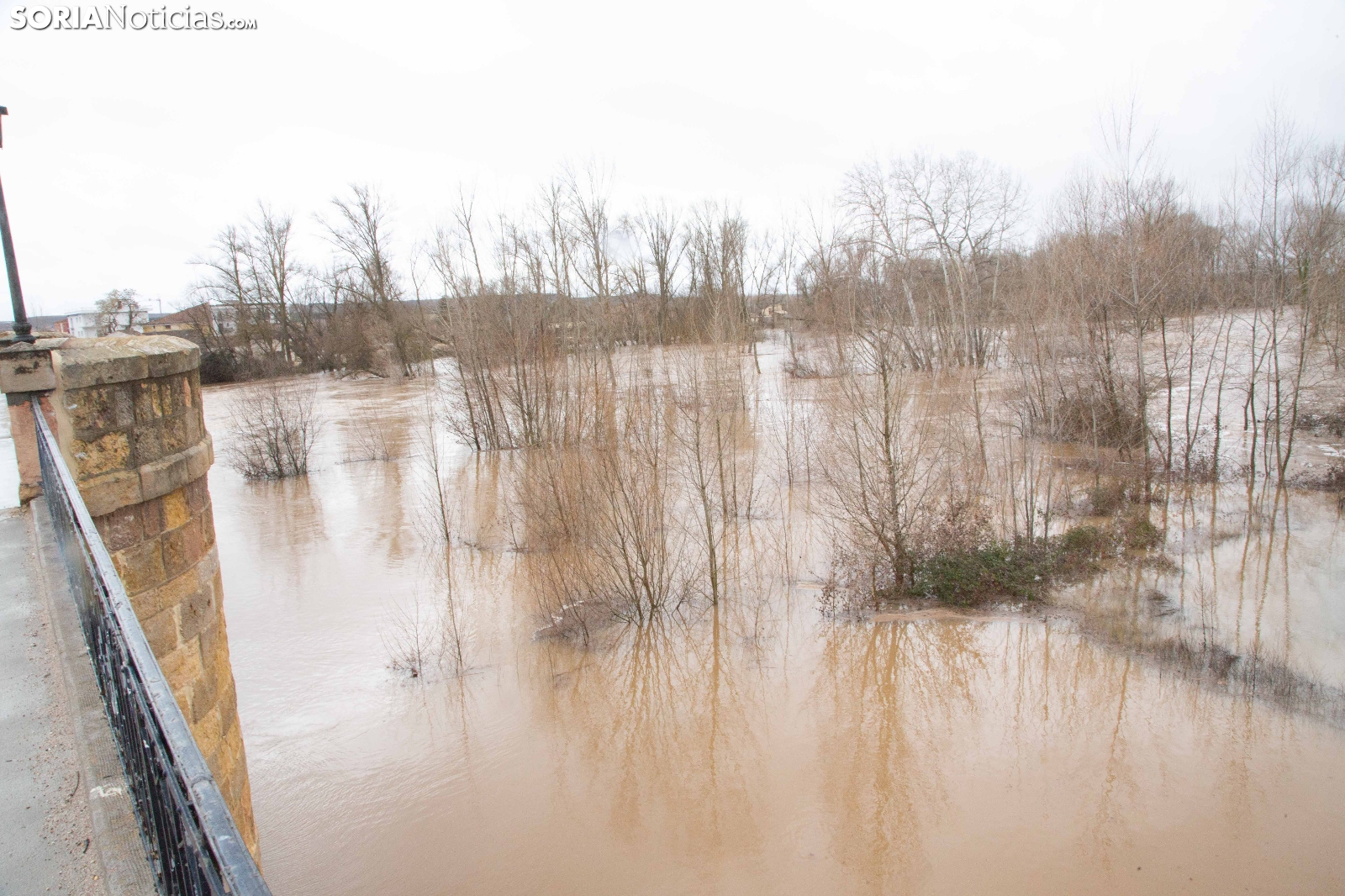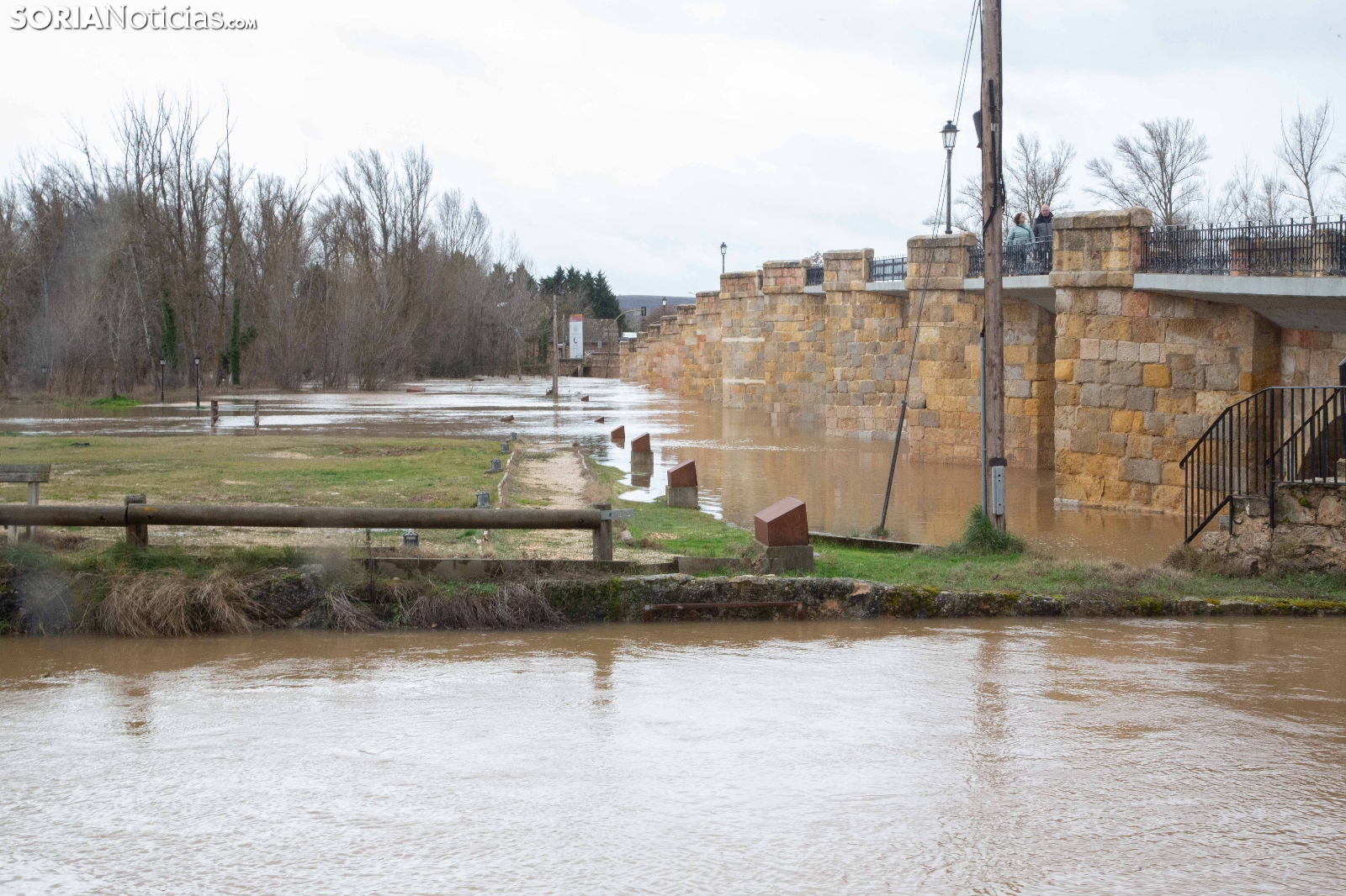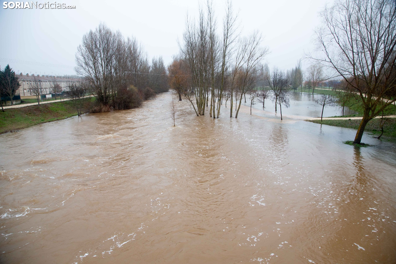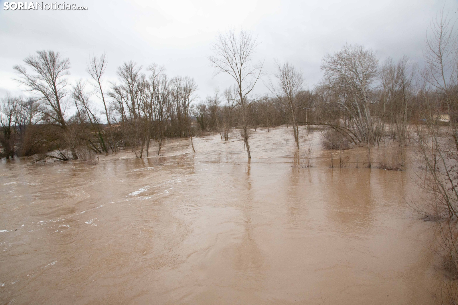 Las crecidas en los cauces siguen en aumento espoleadas por la borrasca Nils, último de los temporales que consecutivamente vienen ceniéndose por la Penísula. Dos cauces, uno afluente, el Ucero, que previamente se unía al Abión en Osma, se desborda de manera espectacular a su paso por El Burgo, mientras que el Duero, aguas abajo en San Esteban de Gormaz, baja rotundo, conquistando orillas y terrenos de recreo.