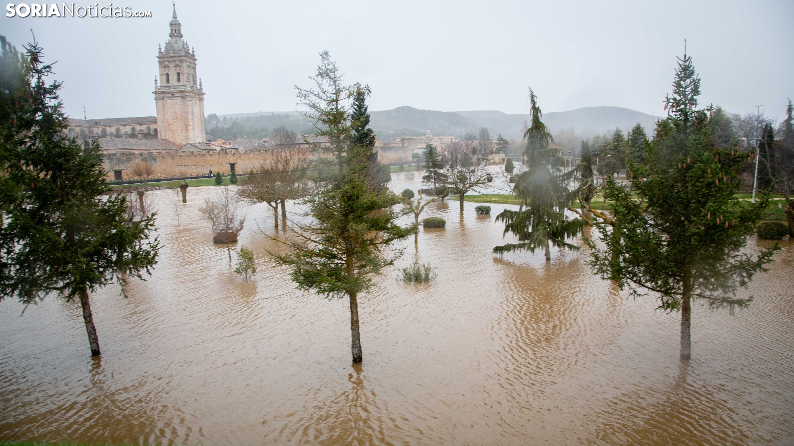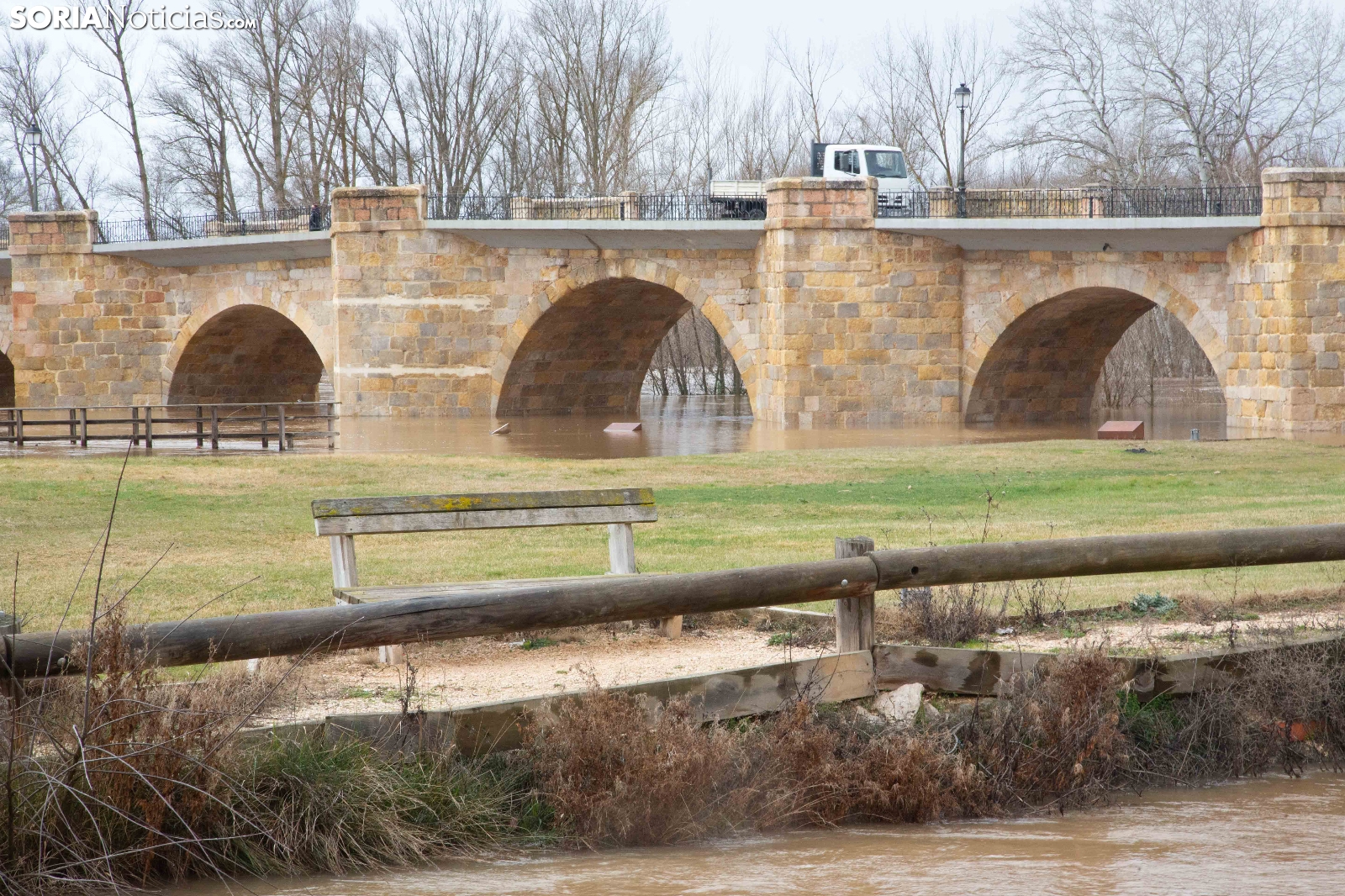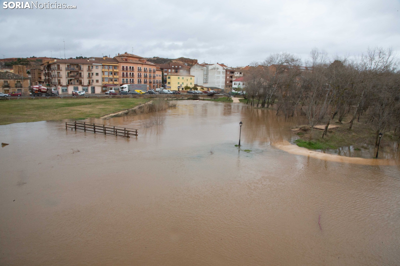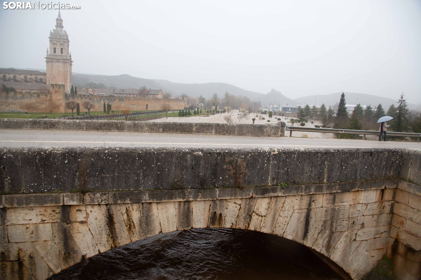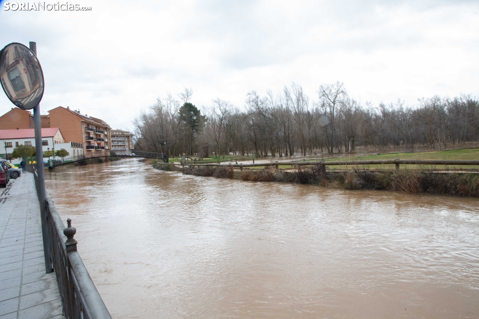 Las crecidas en los cauces siguen en aumento espoleadas por la borrasca Nils, último de los temporales que consecutivamente vienen ceniéndose por la Penísula. Dos cauces, uno afluente, el Ucero, que previamente se unía al Abión en Osma, se desborda de manera espectacular a su paso por El Burgo, mientras que el Duero, aguas abajo en San Esteban de Gormaz, baja rotundo, conquistando orillas y terrenos de recreo.