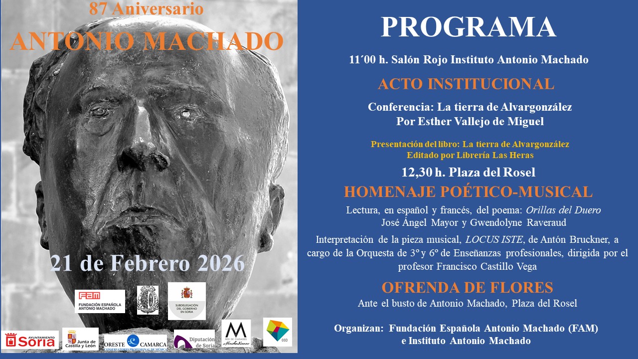 Soria volverá a rendir un sentido homenaje a Antonio Machado el sábado 21 de este febrero. La programación, diseñada conjuntamente por la Fundación Española Antonio Machado y el histórico instituto de Educación Secundaria que lleva su nombre, incluye una conferencia centrada en 'La tierra de Alvargonzález' y una tradicional ofrenda floral acompañada de música orquestal ante el busto del escritor.