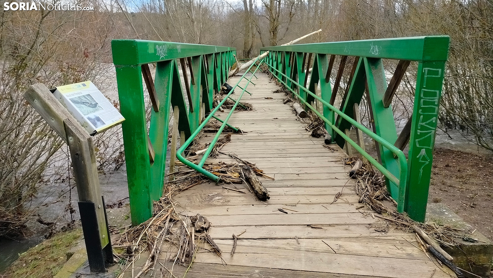 El puente que atraviesa el cauce en ese punto ha sufrido el embate del tiempo, que ha arrancado parte de la estructura metálica. El agua, además, con el arrastre de vegetación y de árboles, ha incrustado varios troncos, tal y como puede verse en la imagen que remite uno de nuestros lectores casi al cierre de la edición de este sábado.