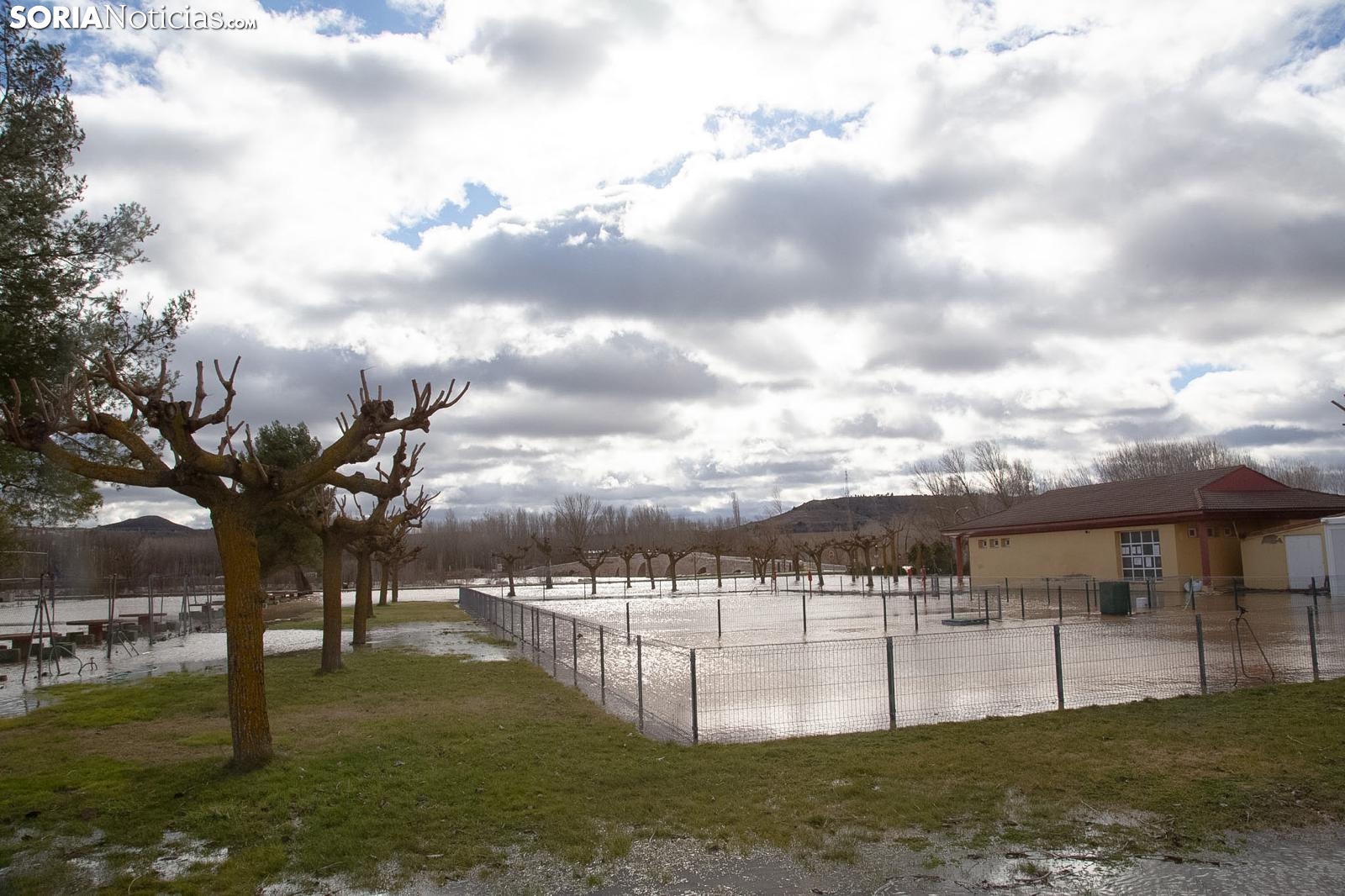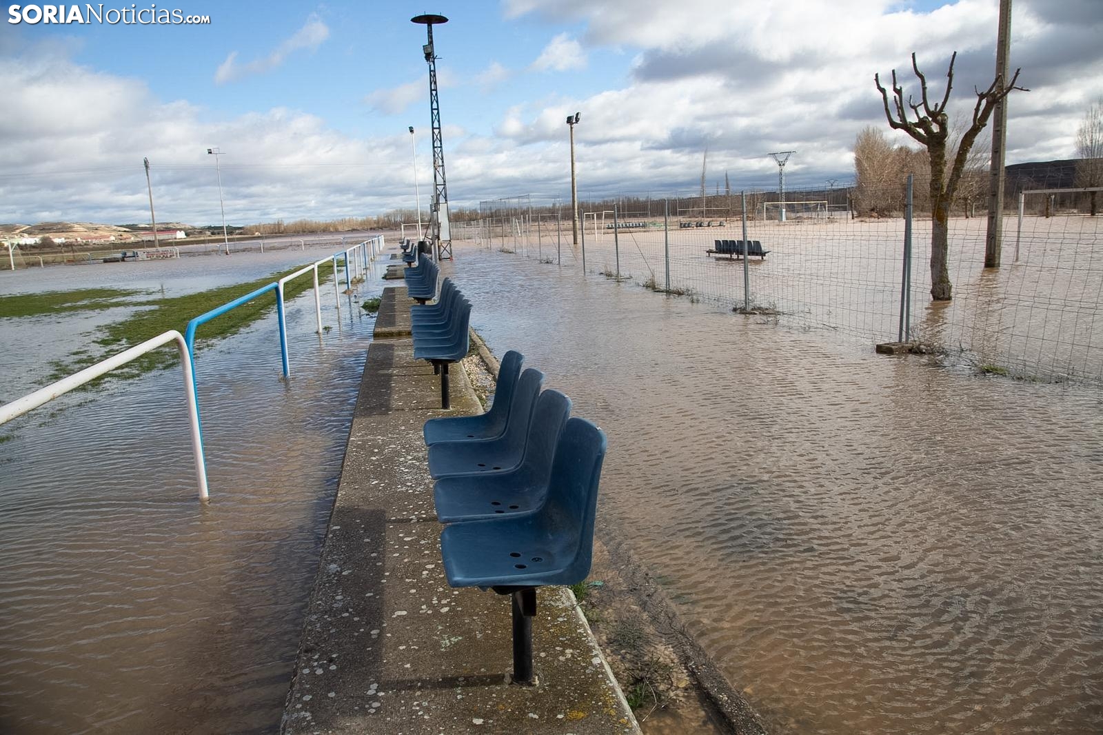 Además, la depuradora se halla "al límite", y aunque todavía no se ha visto afectada, el volumen del río se halla prácticamente a la misma altura. También preocupan los pisos de la calle Nuestra Señora de Paúl, que ven cómo las aguas se encuentran a menos de cien metros de distancia, al igual que el polideportivo municipal. El campo de fútbol, del mismo modo, está anegado.