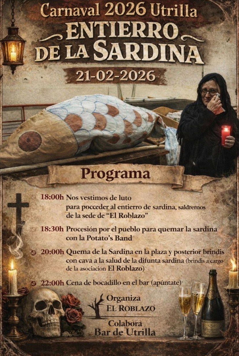 Las celebraciones carnavaleras en Utrilla no terminan aquí. La asociación El Roblazo, organizadora de los festejos en colaboración con el Bar de Utrilla, ya tiene todo preparado para despedir a Don Carnal el próximo sábado 21 de febrero con el tradicional Entierro de la Sardina.