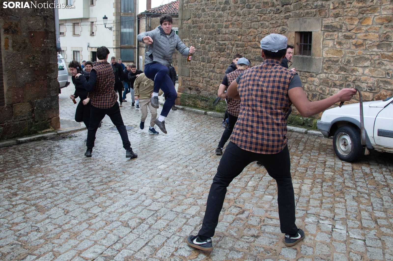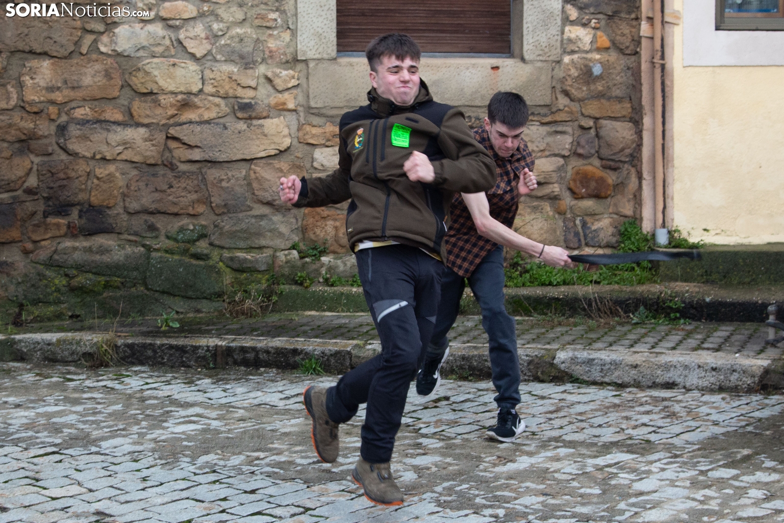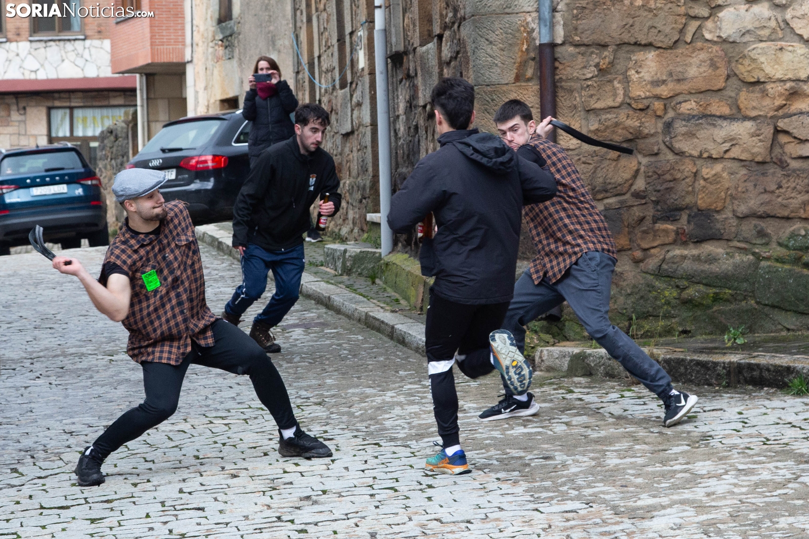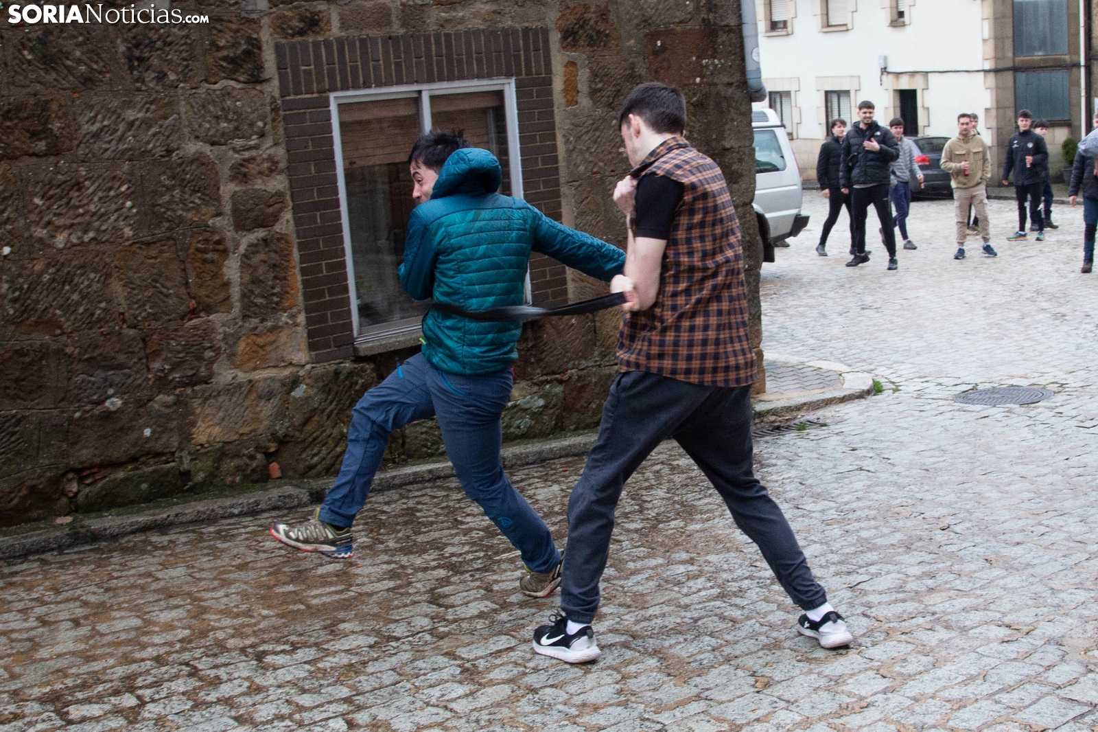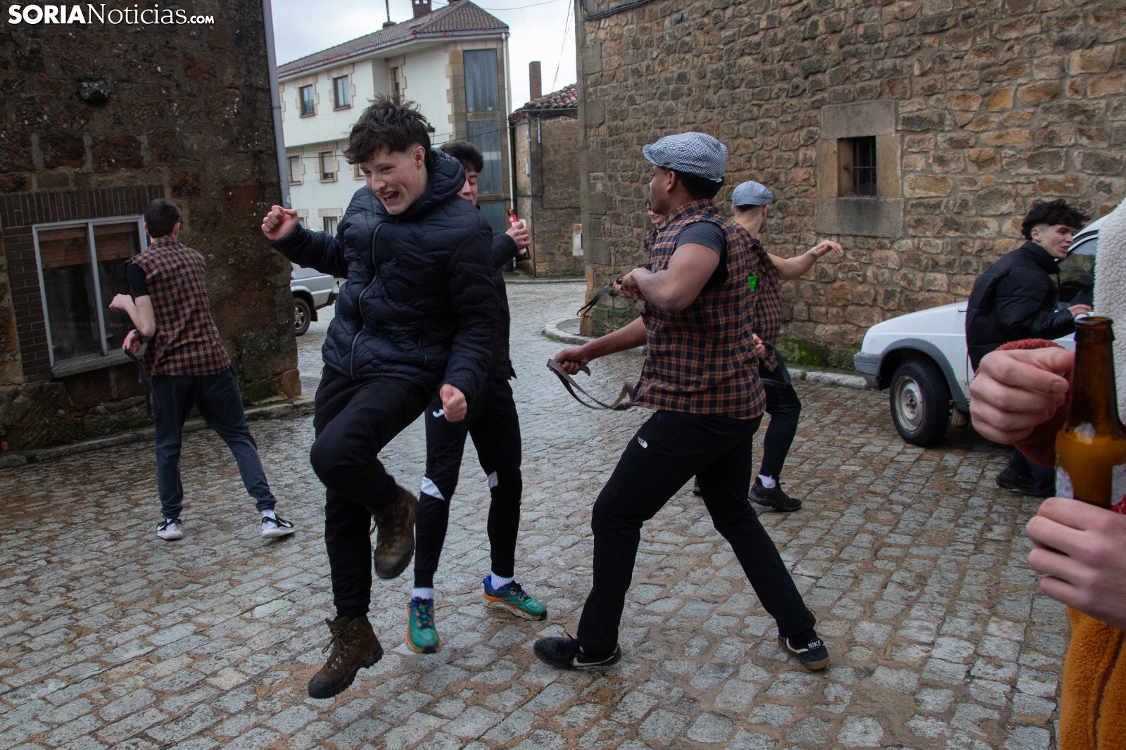 Duruelo de la Sierra ha vuelto a cumplir con su tradición de carnavales en su último día. Hoy martes, la localidad pinariega se ha echado a la calle con su tradicional recorrido musical en una ronda popular donde, como es costumbre, mayorales y motriles imponían su peculiar disciplina golpeando con varas y cintos a la concurrencia. Carreras y risas, además de algún que otro impacto ha servido de antesala para una comida popular de 'Mozos y mozas' que da paso a los disfraces y al baile.