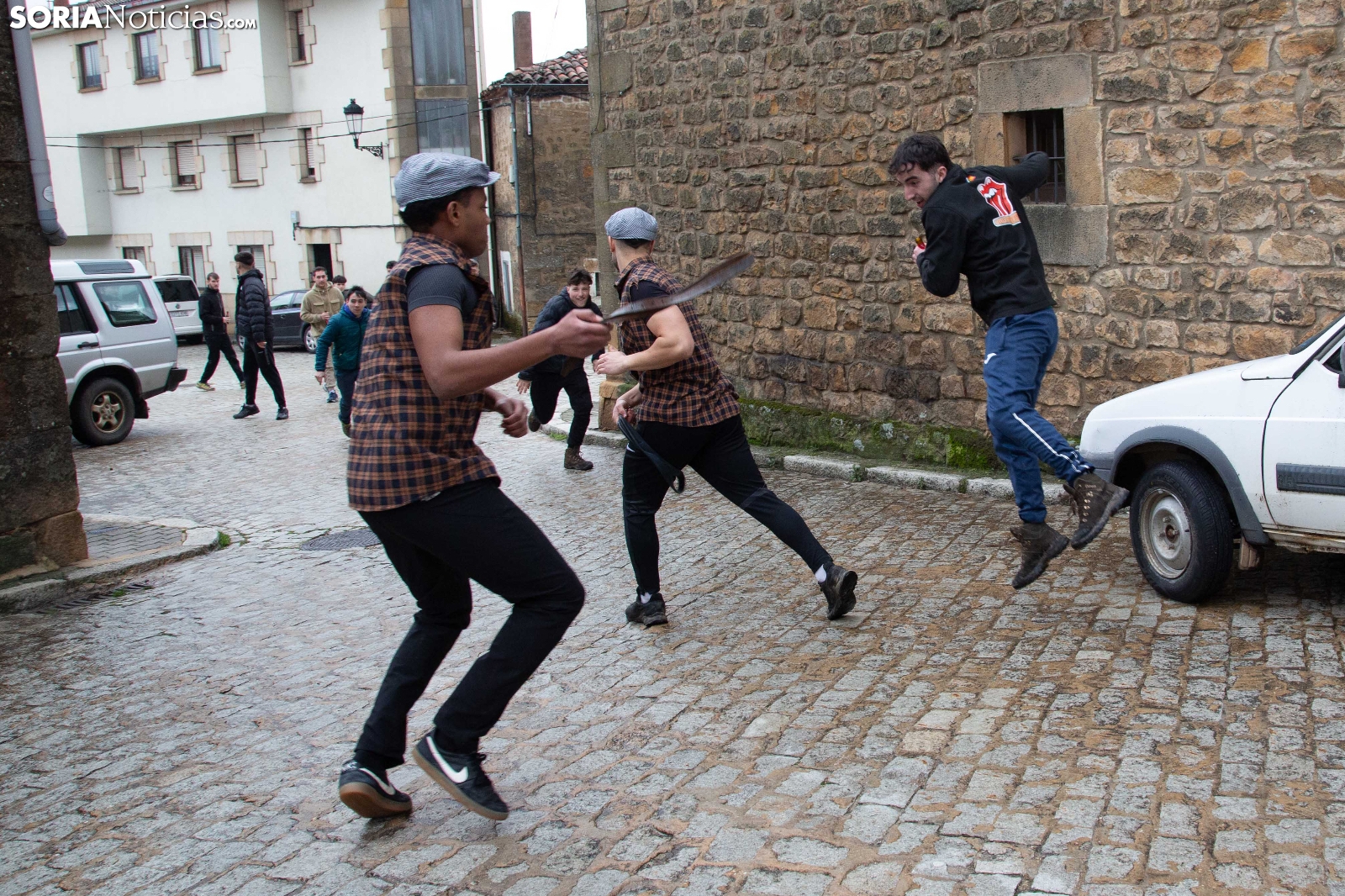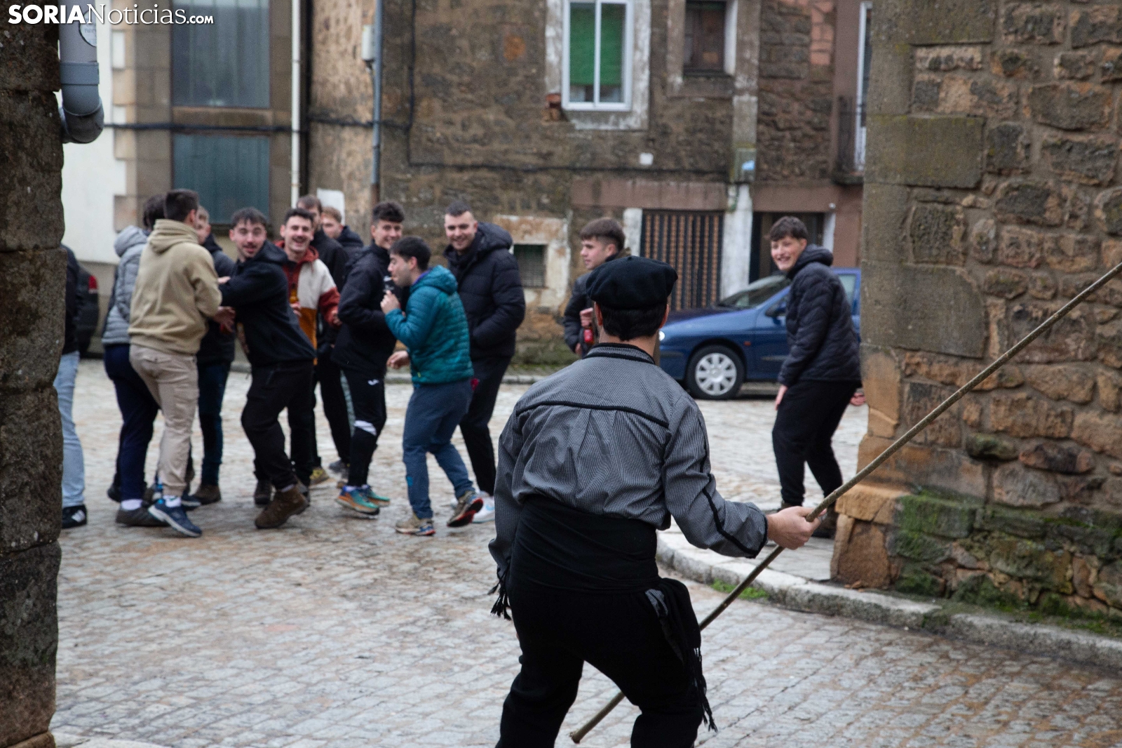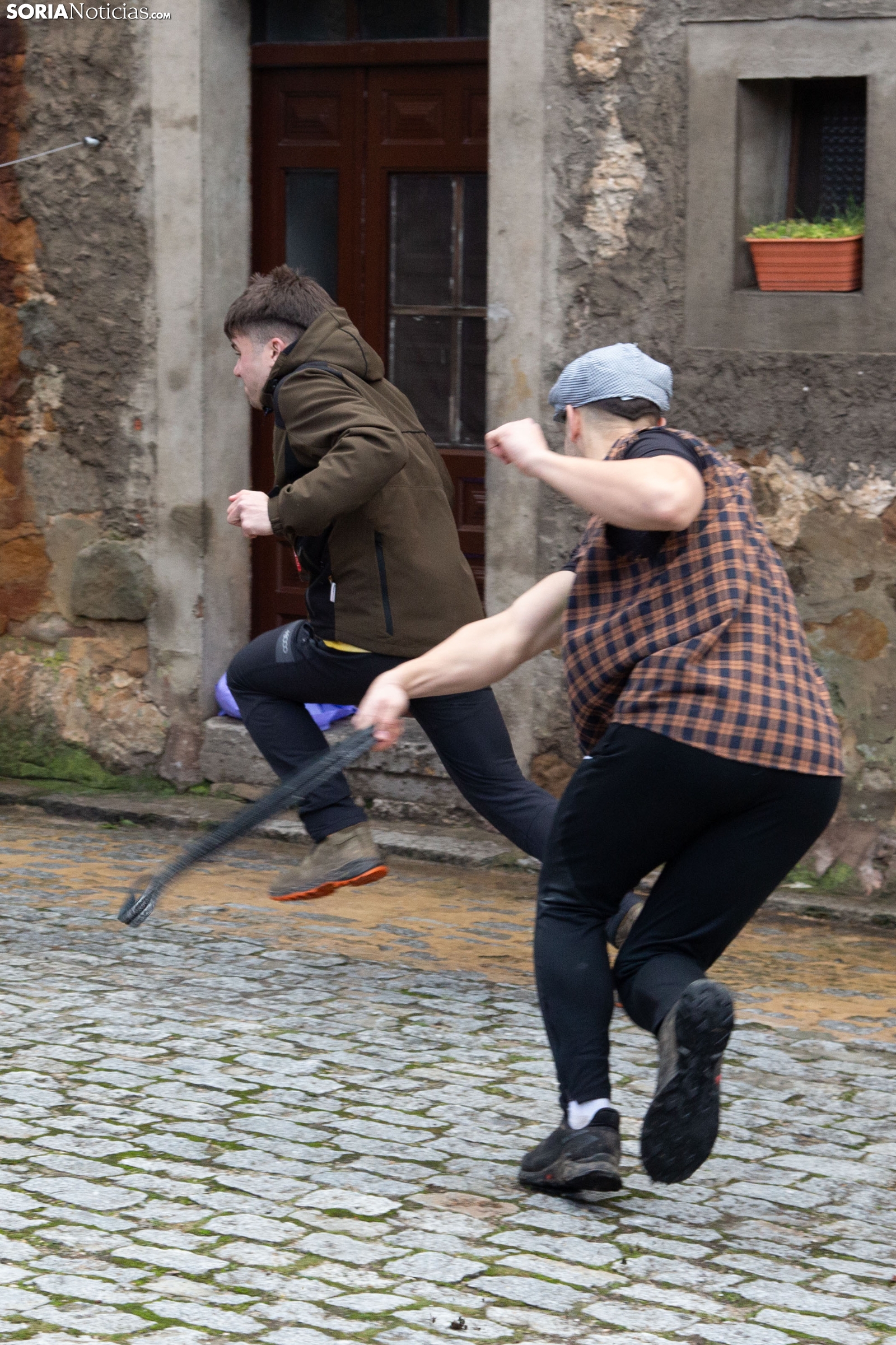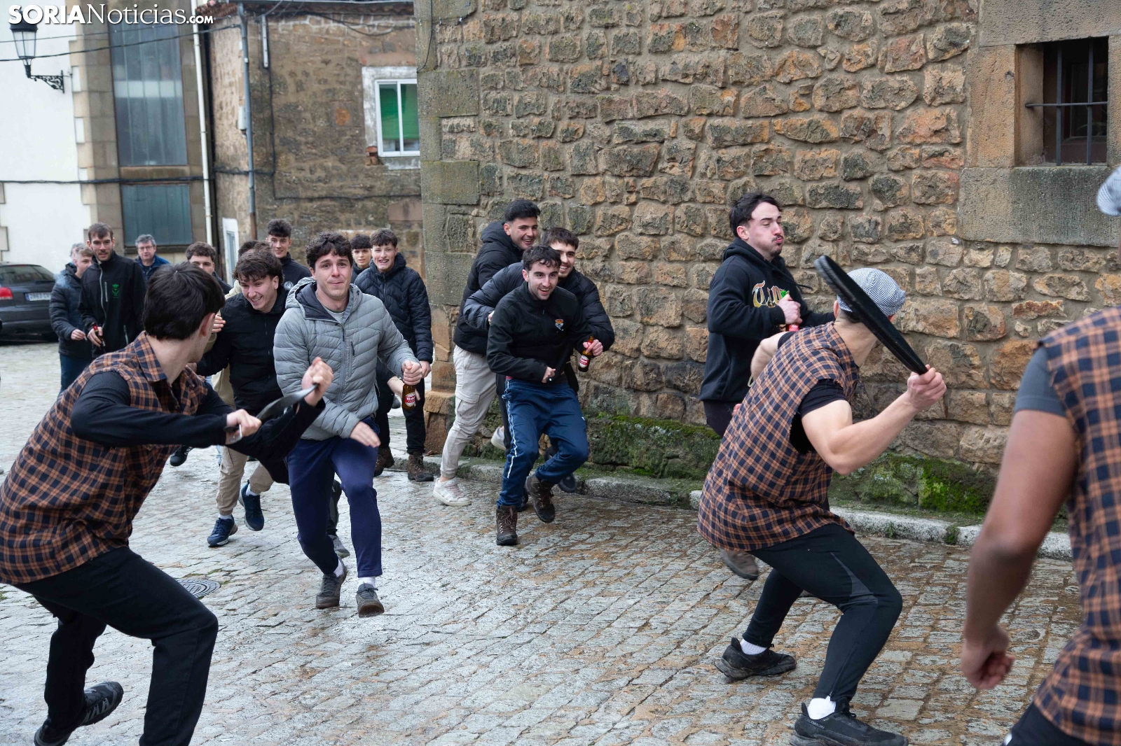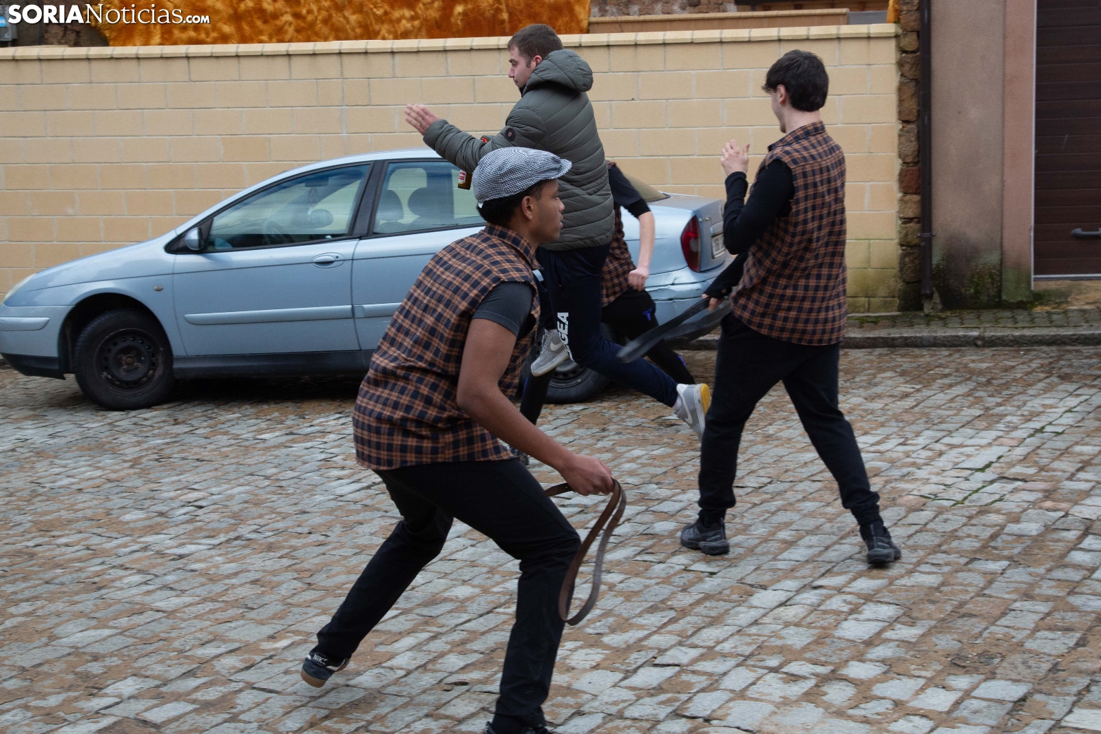 Duruelo de la Sierra ha vuelto a cumplir con su tradición de carnavales en su último día. Hoy martes, la localidad pinariega se ha echado a la calle con su tradicional recorrido musical en una ronda popular donde, como es costumbre, mayorales y motriles imponían su peculiar disciplina golpeando con varas y cintos a la concurrencia. Carreras y risas, además de algún que otro impacto ha servido de antesala para una comida popular de 'Mozos y mozas' que da paso a los disfraces y al baile.
