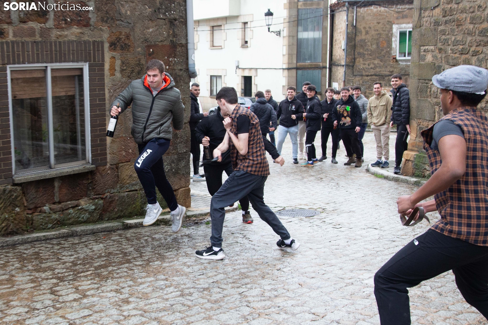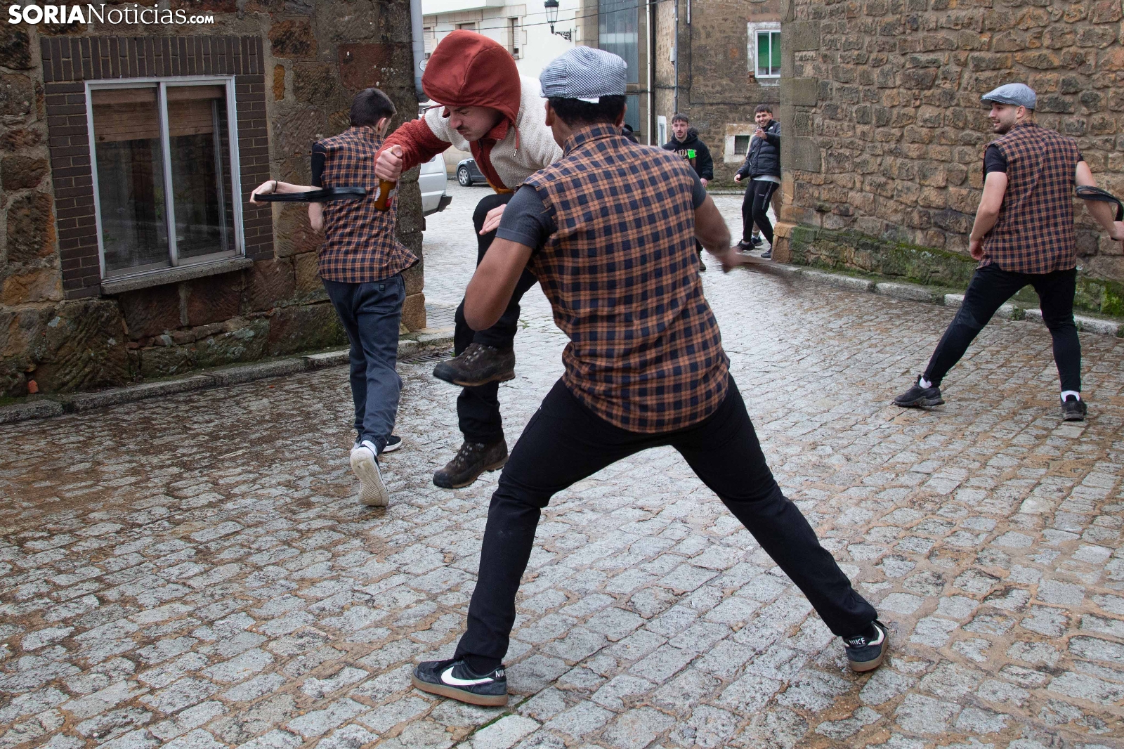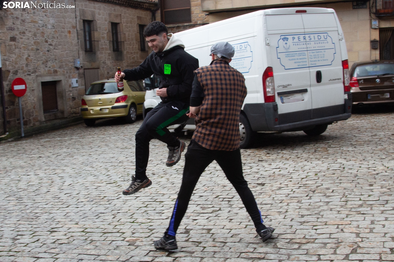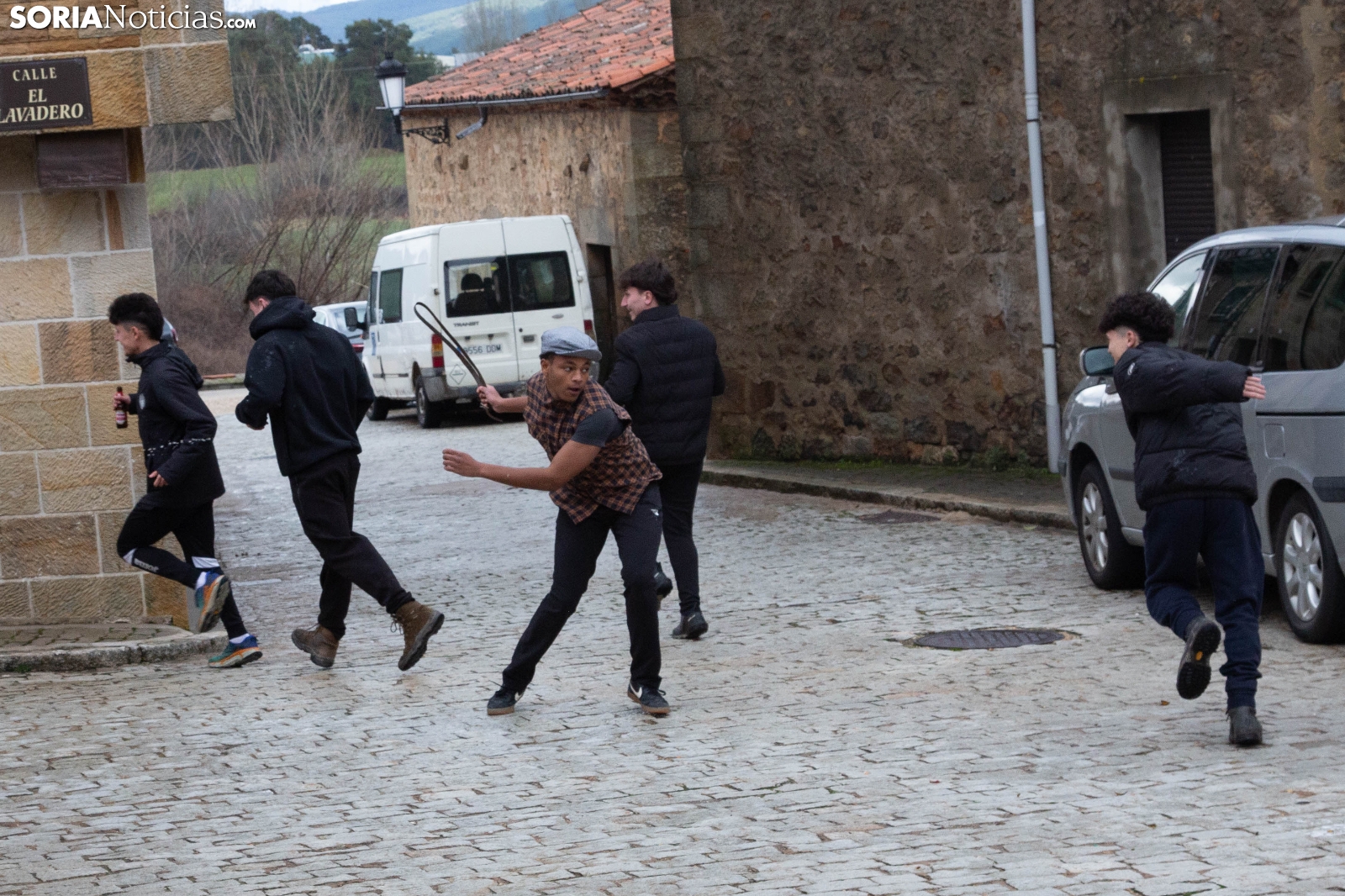 Duruelo de la Sierra ha vuelto a cumplir con su tradición de carnavales en su último día. Hoy martes, la localidad pinariega se ha echado a la calle con su tradicional recorrido musical en una ronda popular donde, como es costumbre, mayorales y motriles imponían su peculiar disciplina golpeando con varas y cintos a la concurrencia. Carreras y risas, además de algún que otro impacto ha servido de antesala para una comida popular de 'Mozos y mozas' que da paso a los disfraces y al baile.