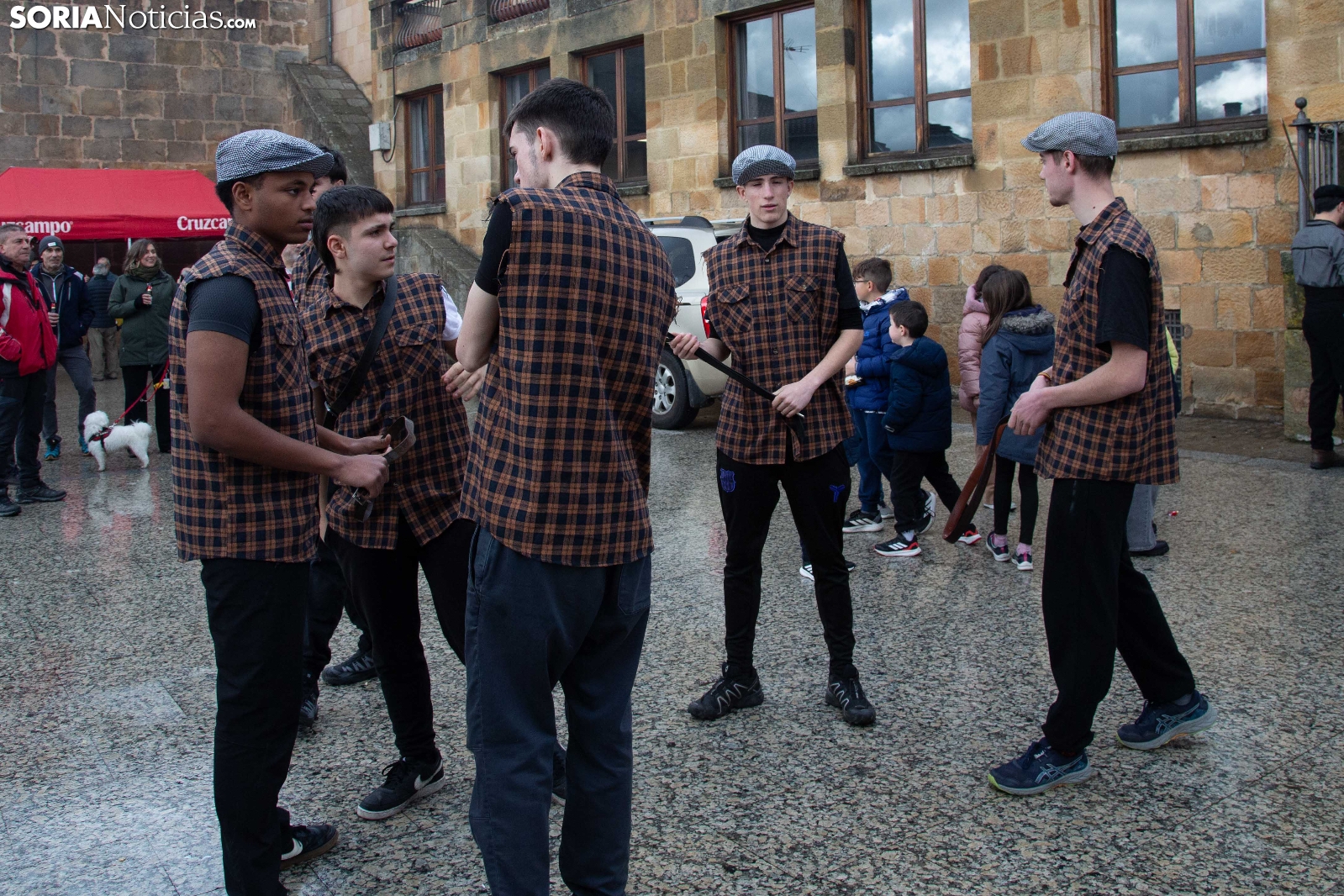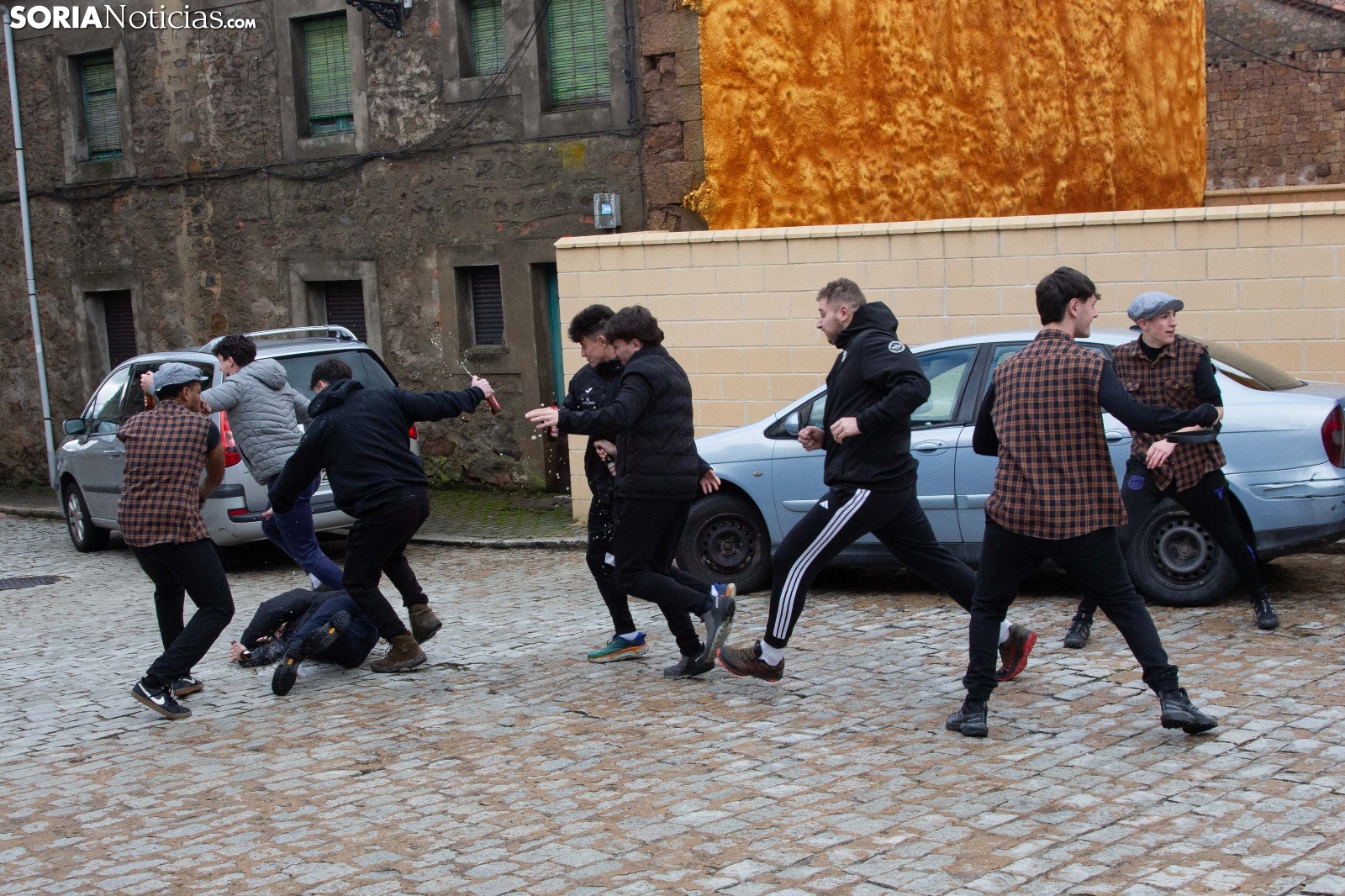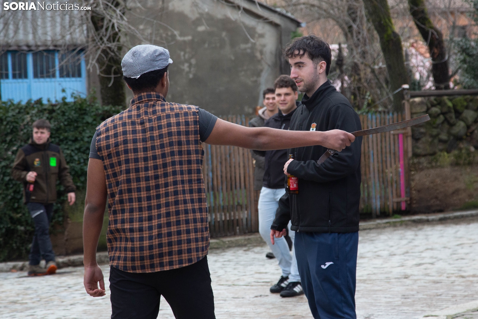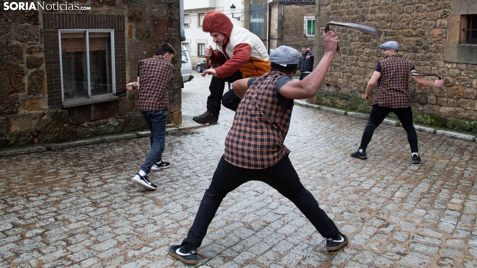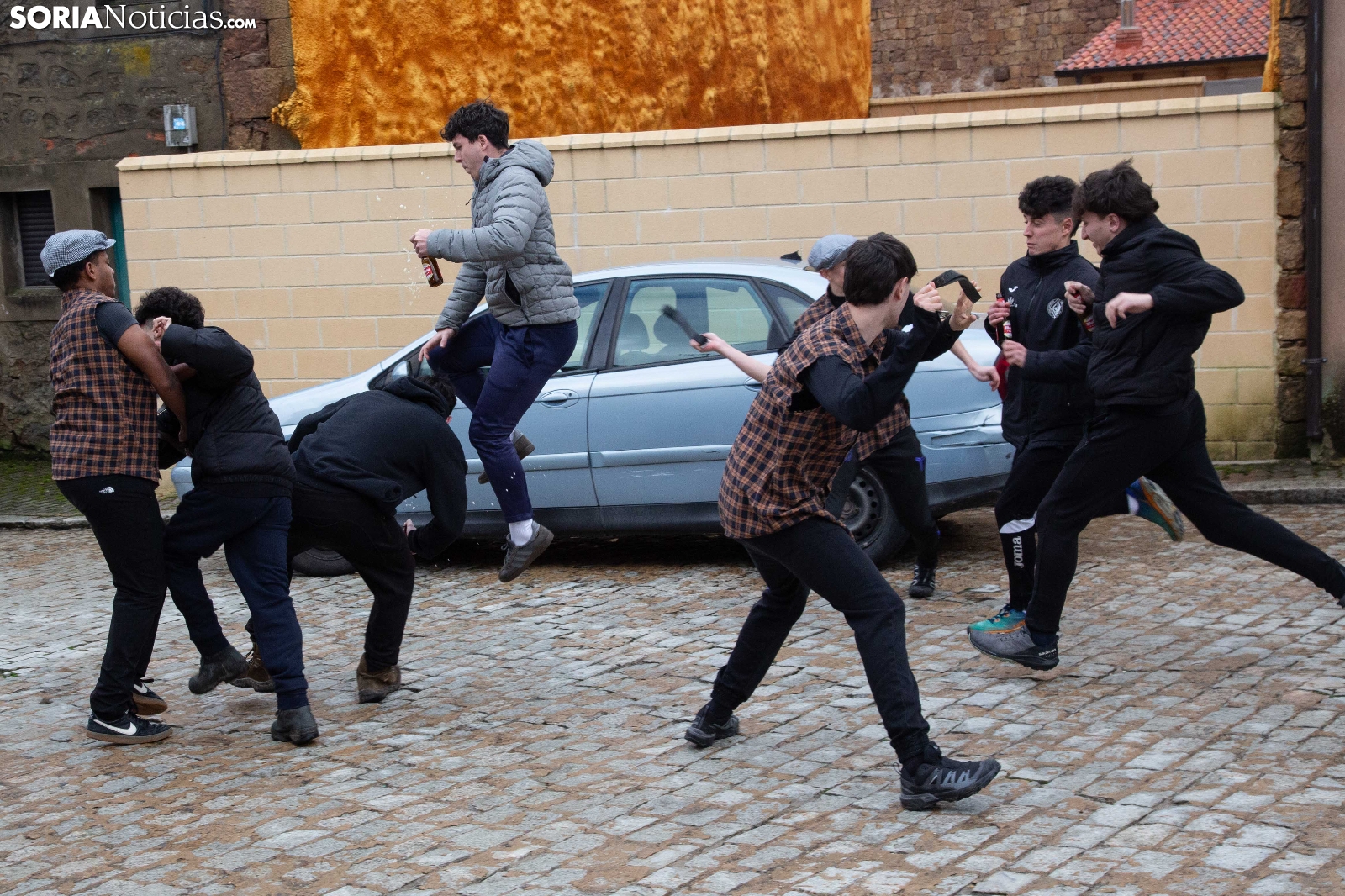 Duruelo de la Sierra ha vuelto a cumplir con su tradición de carnavales en su último día. Hoy martes, la localidad pinariega se ha echado a la calle con su tradicional recorrido musical en una ronda popular donde, como es costumbre, mayorales y motriles imponían su peculiar disciplina golpeando con varas y cintos a la concurrencia. Carreras y risas, además de algún que otro impacto ha servido de antesala para una comida popular de 'Mozos y mozas' que da paso a los disfraces y al baile.