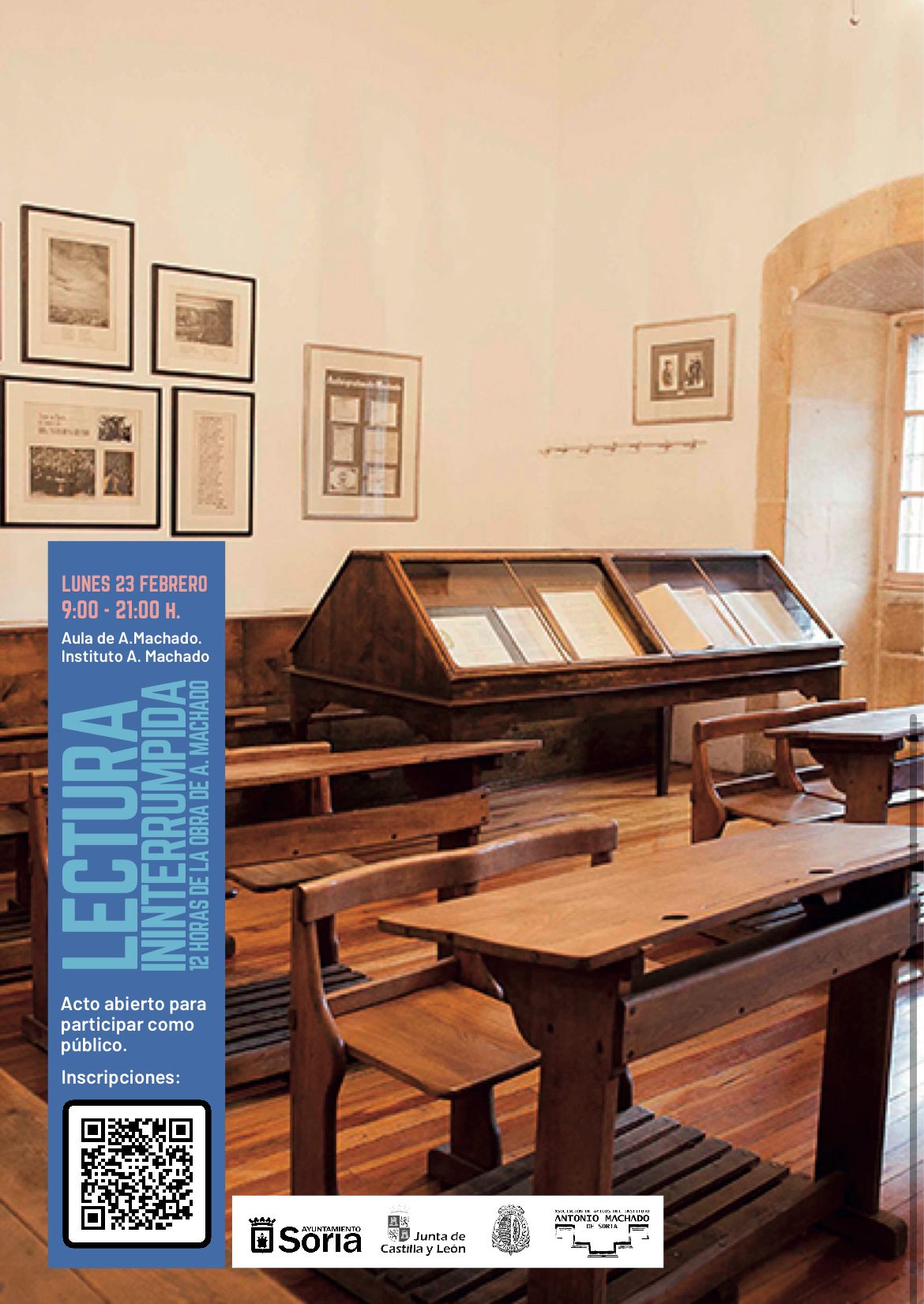 Para aquellos interesados en formar parte de este homenaje colectivo, el proceso de participación ya se encuentra activo. Las inscripciones pueden formalizarse a través del formulario habilitado para la ocasión, accesible mediante el código QR incluido en la cartelería o contactando directamente con la organización. El objetivo final es promover un acto abierto y participativo que reafirme, una vez más, la vigencia de los versos de Machado en la sociedad soriana actual.