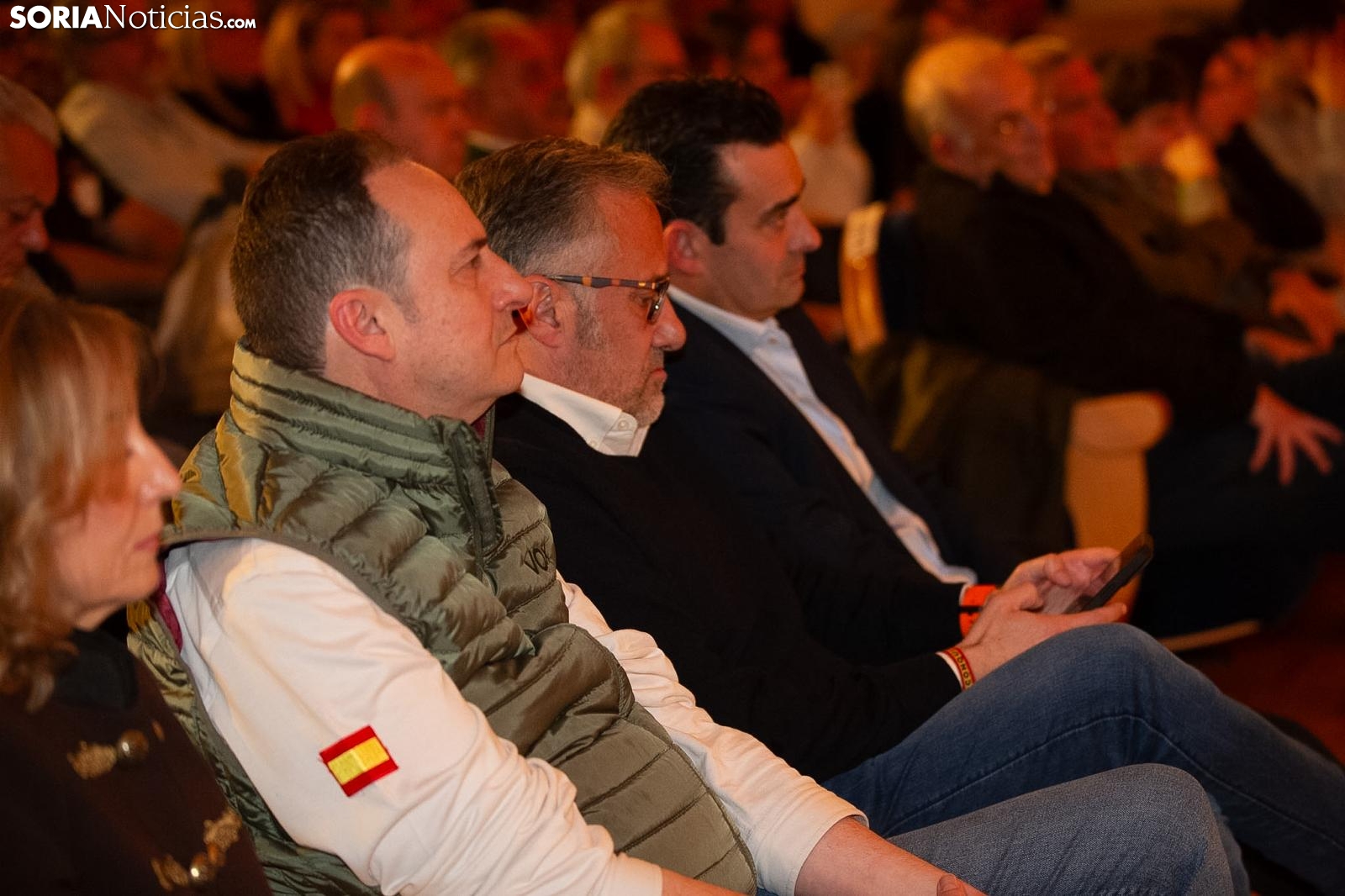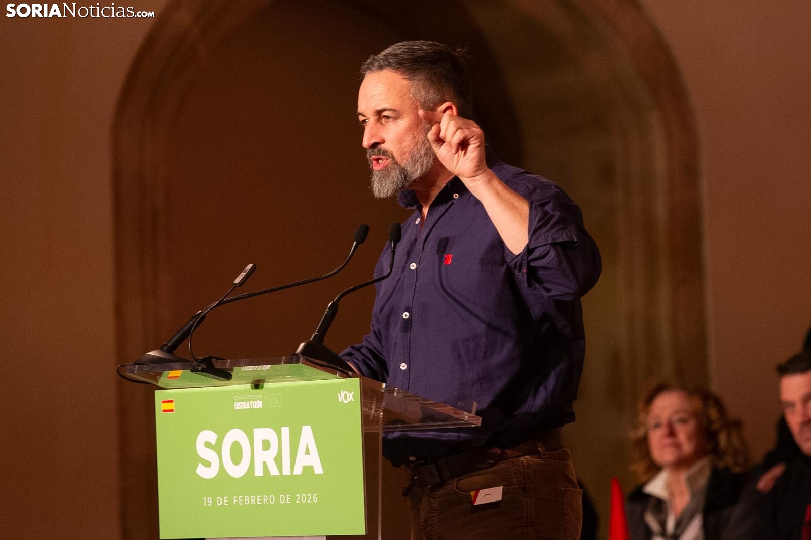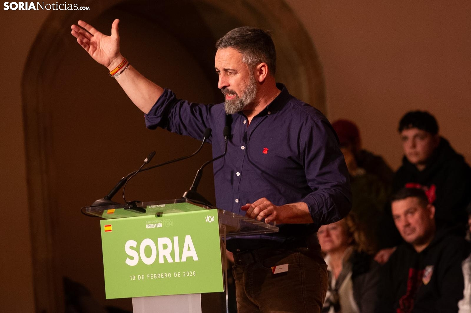 Santiago Abascal ha visitado esta tarde Soria para apoyar la candidatura de Carlos Pollán a la presidencia de la Junta de Castilla y León. En una Aula Magna con centenares de personas, muchas de ella jóvenes, el líder de Vox no ha dejado títere con cabeza cargando contra el PSOE, el PP, Gabriel Rufián o la inmigración ilegal, entre otros muchos temas.