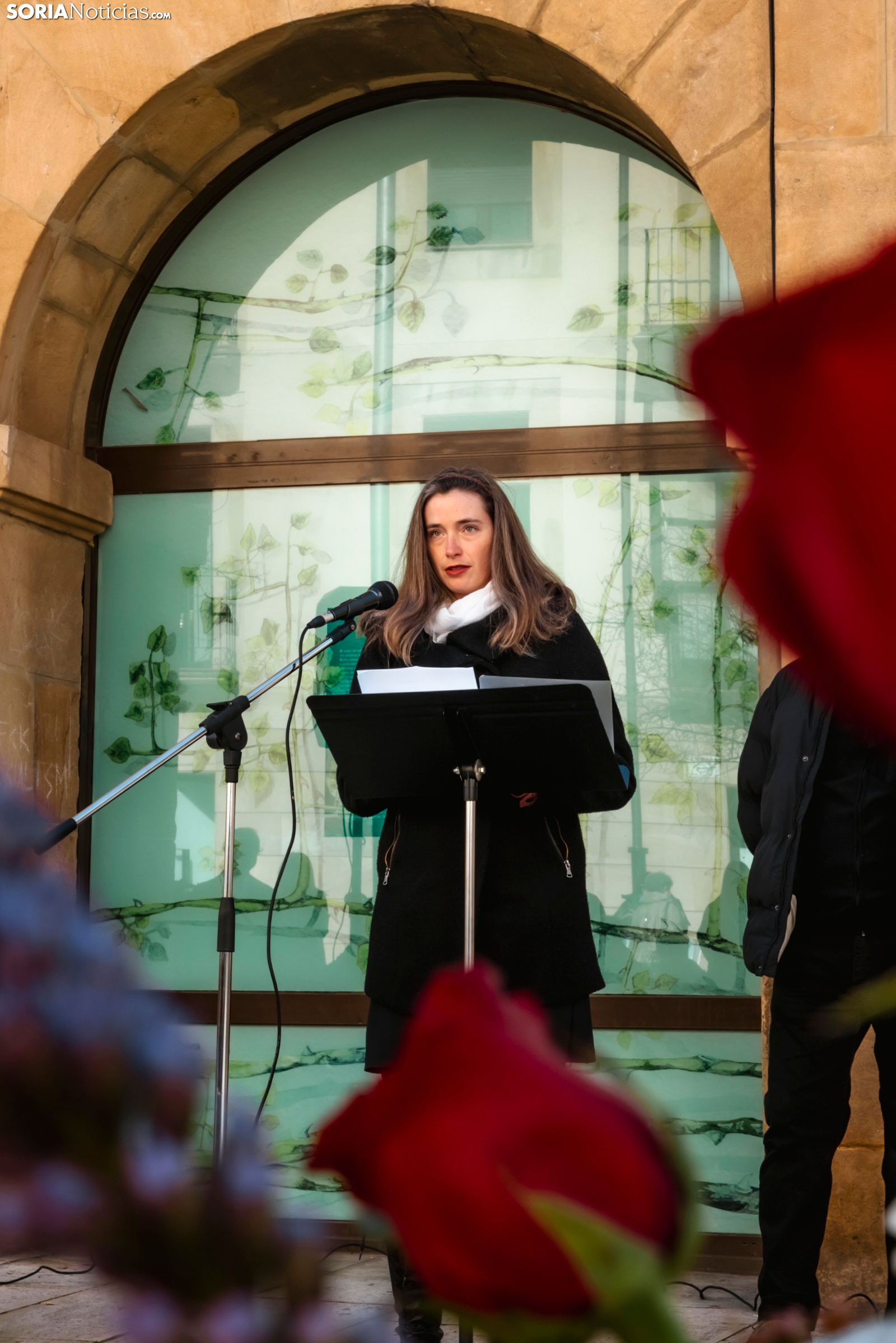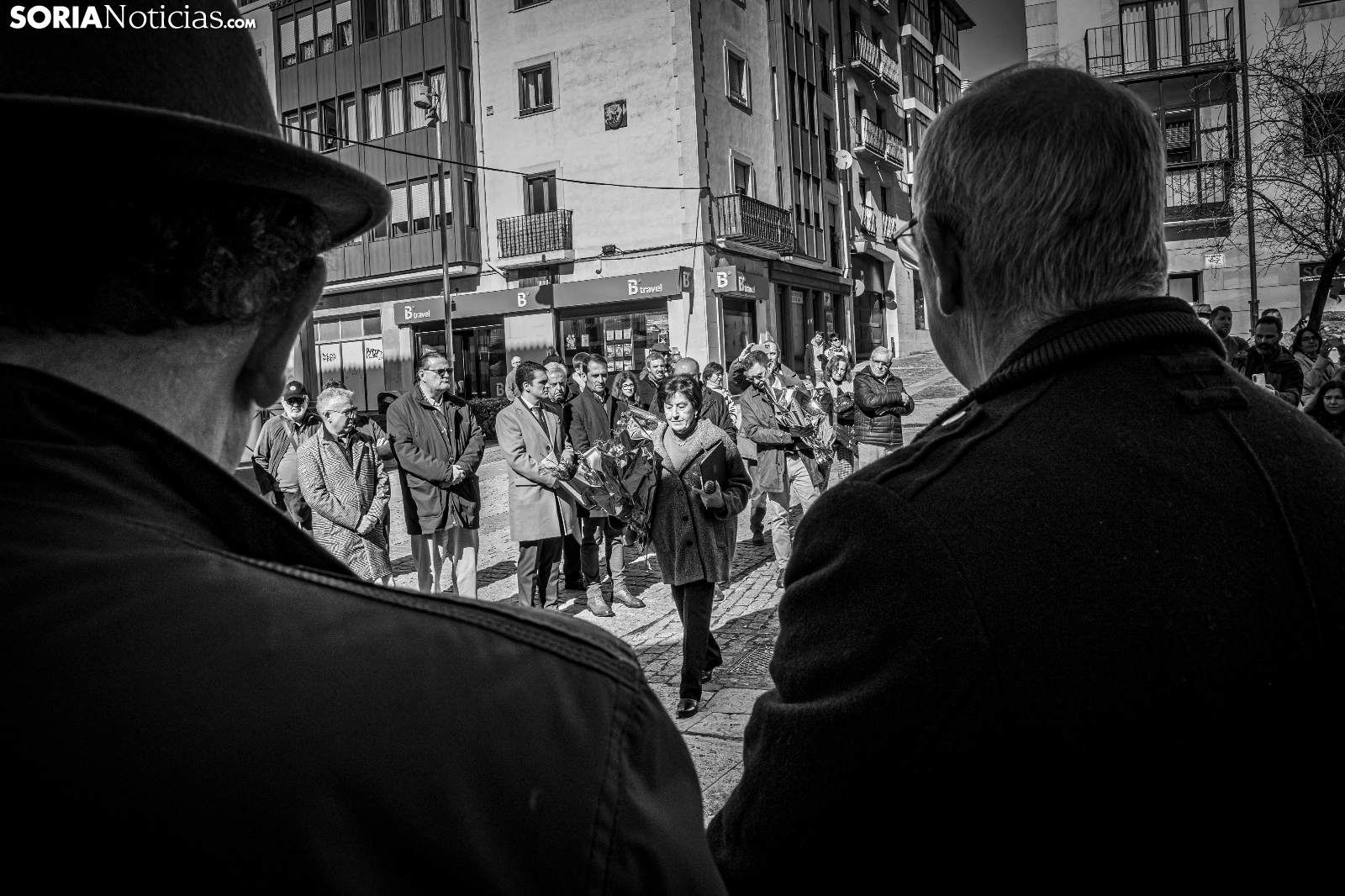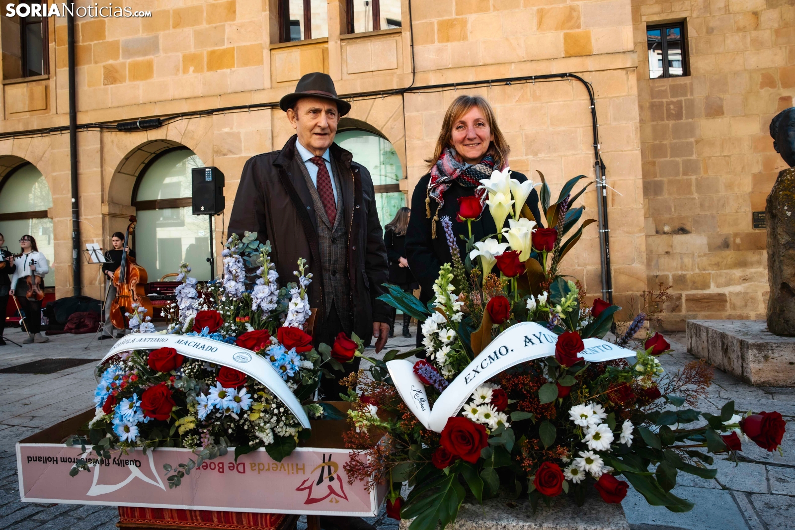 Soria ha vuelto a homenajear esta mañana a uno de sus vecinos más carismáticos, Antonio Machado. Después de que el alcalde, Carlos Martínez, llevará ayer flores a la tumba de Leonor Izquierdo, los actos se han centrado hoy en el Instituto que lleva el nombre del poeta. La jornada ha arrancado con la presentación del libro 'La tierra de Alvargonzález. Cuento-leyenda y romance' de Esther Vallejo. Seguidamente, se ha completado el homenaje poético-musical con una ofrenda de flores ante el busto de Antonio Machado en la plaza del Rosel.