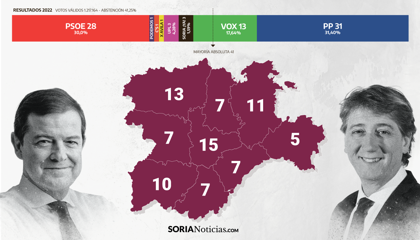 Soria ¡Ya!, Partido Popular, PSOE y Vox aspiran a salir bien parados en el reparto de los 5 procuradores de la provincia. Por primera vez en la historia, el candidato socialista a presidir la Junta de Castilla y León es soriano. Carlos Martínez cree que puede ganar al PP, como hace 8 años hizo Tudanca. Mañueco, lejos de la mayoría absoluta, sueña con un parlamento donde los localismos le hagan depender lo mínimo posible de Vox. Este 15M cerca de 75.000 sorianos están llamados a las urnas.