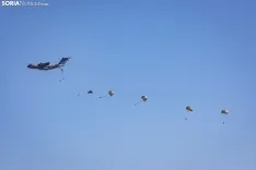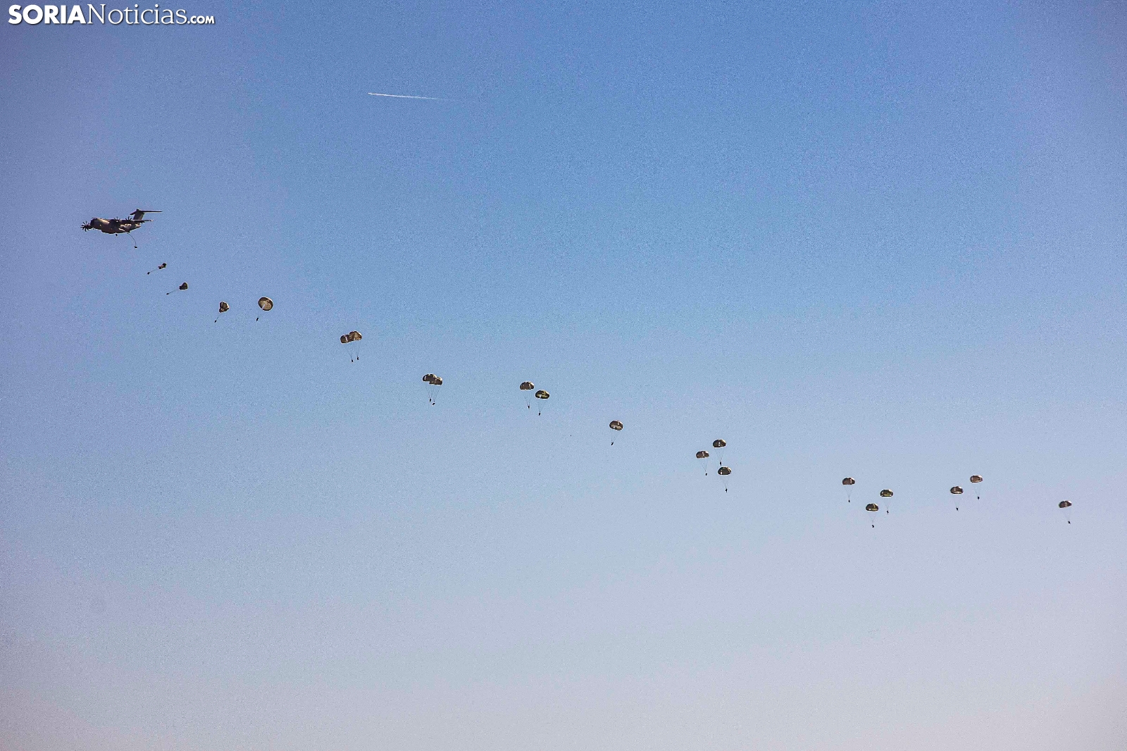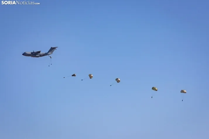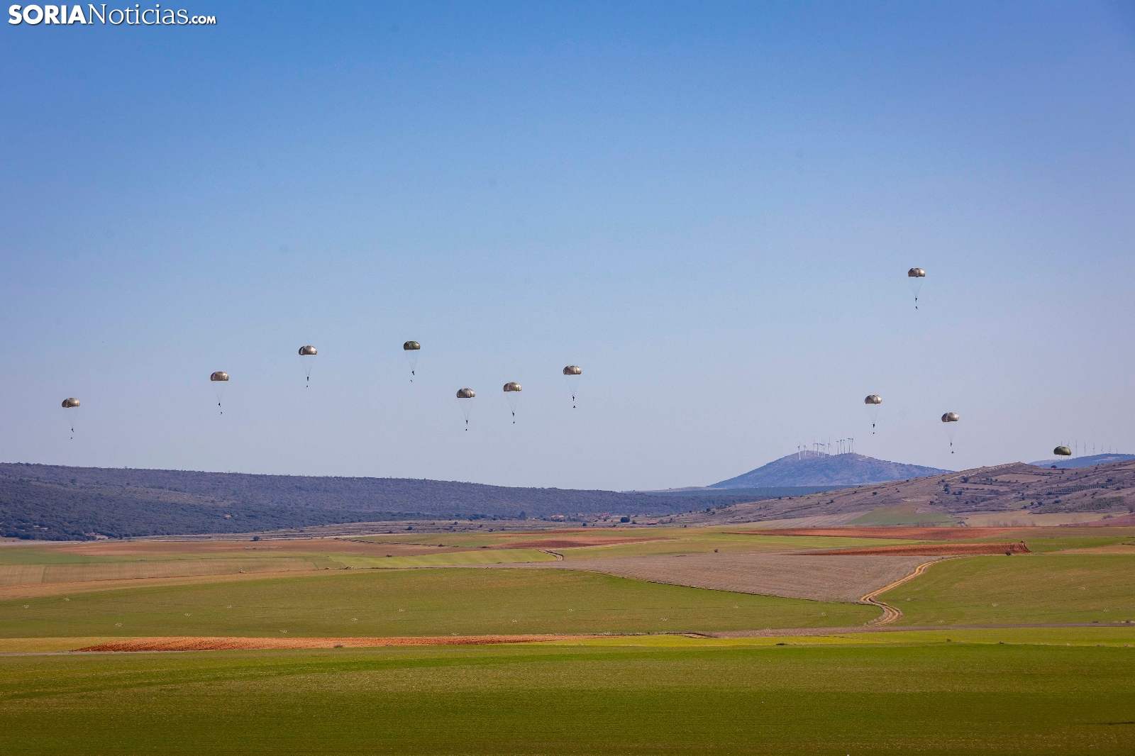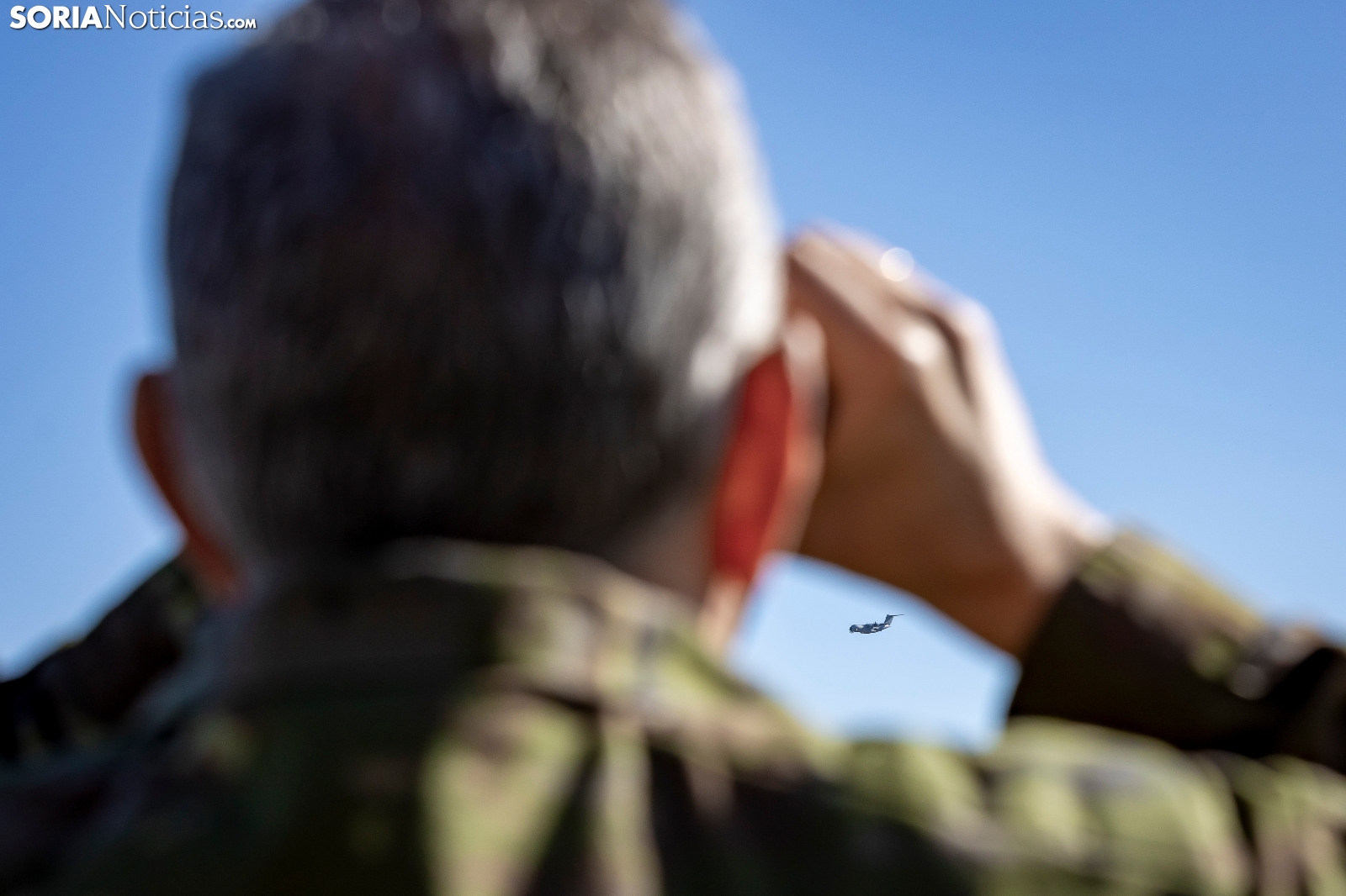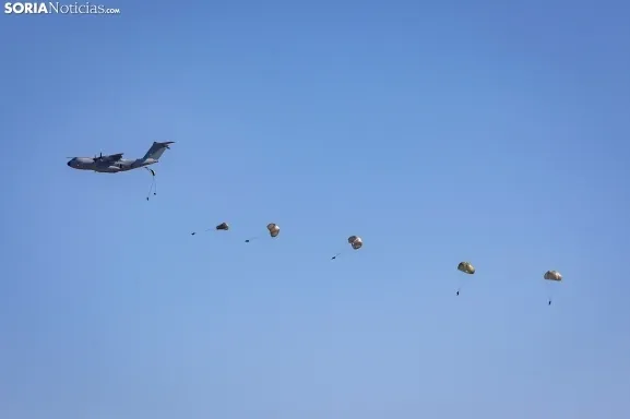 El Ejército del Reino de España ha realizado esta mañana maniobras aéreas con sus paracaidistas en los alrededores de Garray. Un total de 120 efectivos pertenecientes a la 12ª Compañía del Regimiento de Infantería 'Zaragoza', con base en Javalí Nuevo (Murcia), han realizado un salto paracaidista en la comarca, un evento que ha congregado a los más curiosos para observar con detenimiento a los militares. Esta maniobra forma parte de un ejercicio tipo MEP (Misión Especial Paracaidista) de la Brigada Paracaidista. Así pues, el entorno de Garray ha visto cómo aparecían motas en su cielo, unas motas que no eran pájaros ni aviones, eran militares entrenándose al más alto nivel.