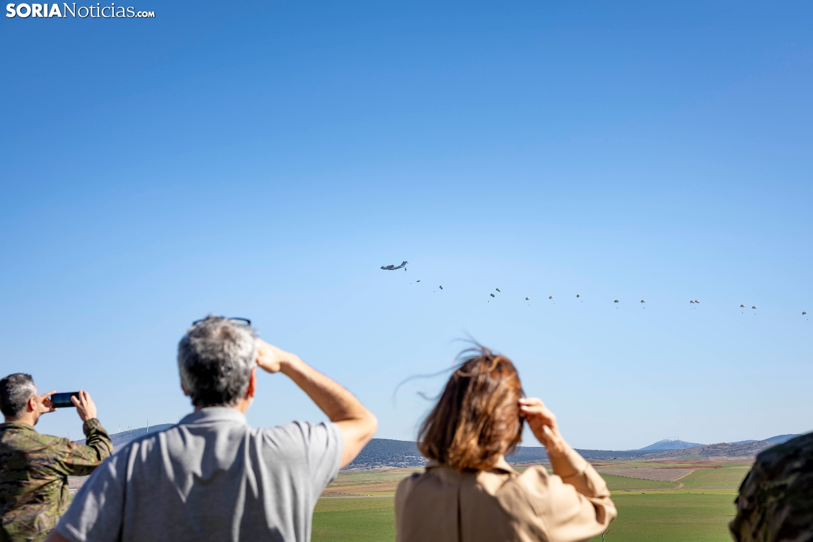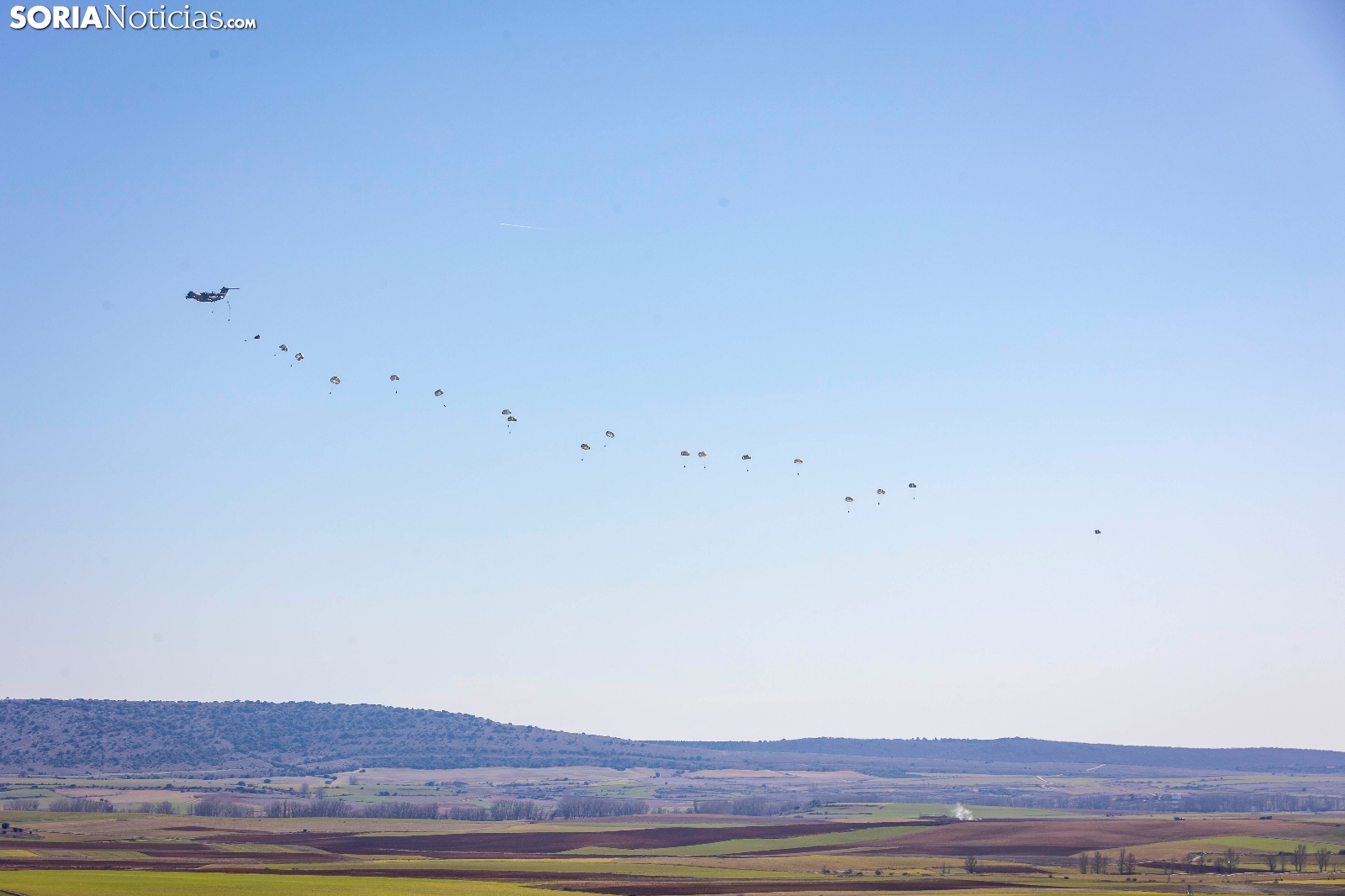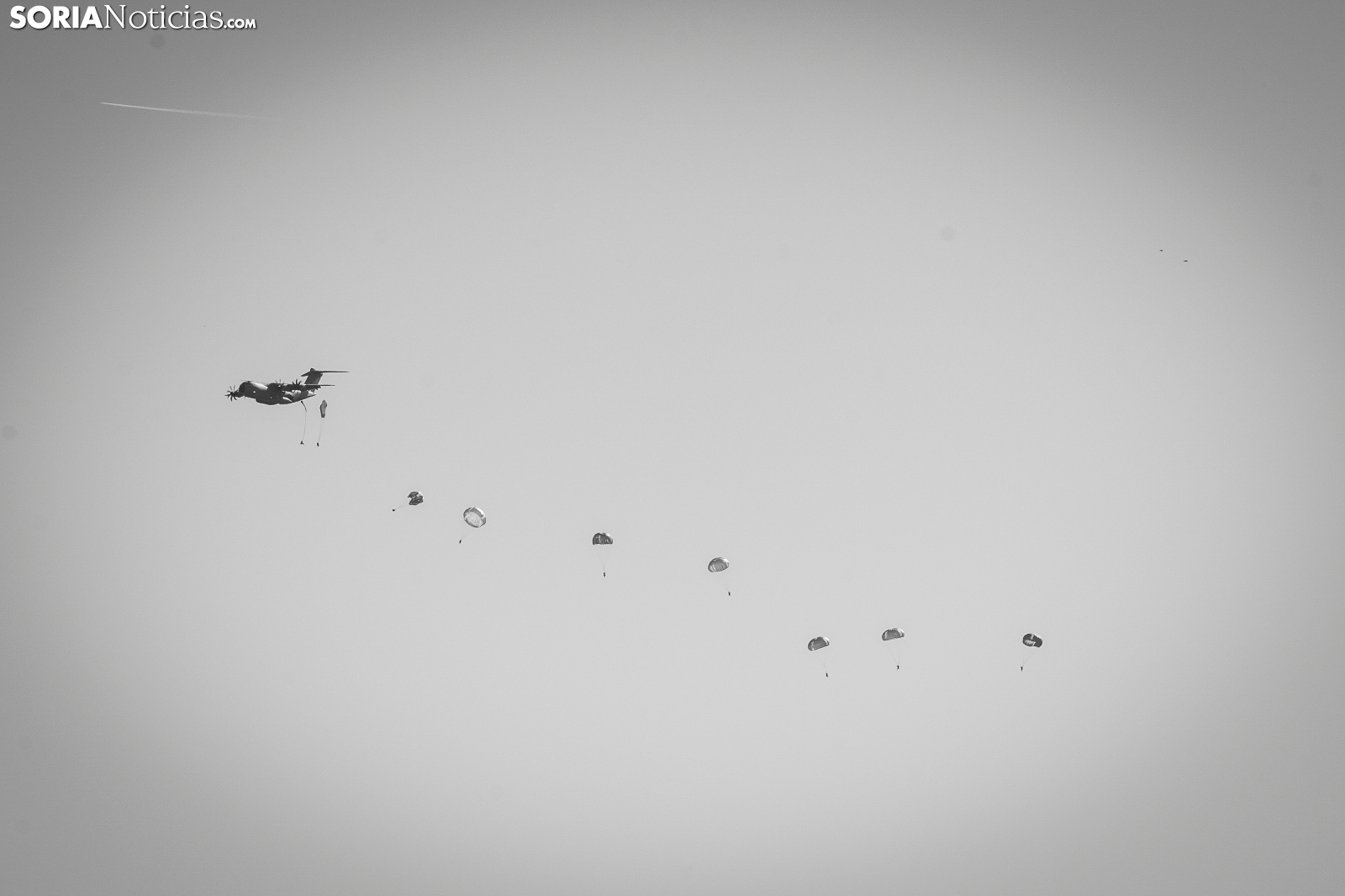 El Ejército del Reino de España ha realizado esta mañana maniobras aéreas con sus paracaidistas en los alrededores de Garray. Un total de 120 efectivos pertenecientes a la 12ª Compañía del Regimiento de Infantería 'Zaragoza', con base en Javalí Nuevo (Murcia), han realizado un salto paracaidista en la comarca, un evento que ha congregado a los más curiosos para observar con detenimiento a los militares. Esta maniobra forma parte de un ejercicio tipo MEP (Misión Especial Paracaidista) de la Brigada Paracaidista. Así pues, el entorno de Garray ha visto cómo aparecían motas en su cielo, unas motas que no eran pájaros ni aviones, eran militares entrenándose al más alto nivel.