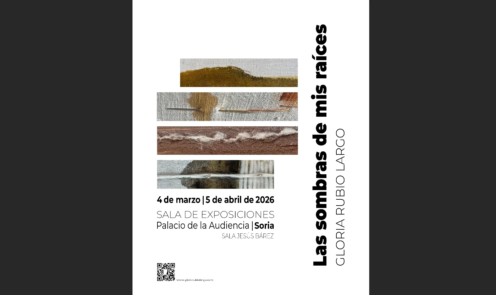 La artista visual Gloria Rubio Largo inaugura hoy su exposición 'Las sombras de mis raíces' en el Palacio de la Audiencia. Una exbición que comprende un conjunto de obras interdisciplinares. El proyecto nace del entorno rural en el que reside y aborda, a través de diferentes técnicas, cuestiones fundamentales sobre la identidad y el futuro.