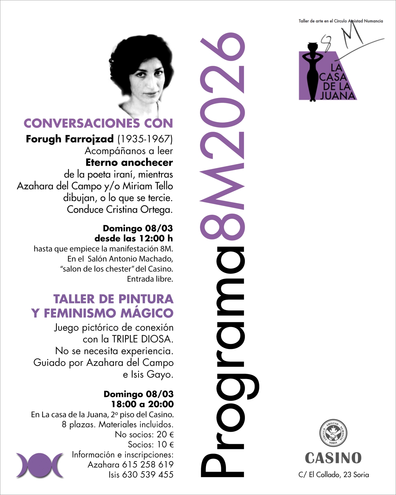 El colectivo La casa de la Juana organiza una lectura de poesía iraní y un taller de pintura celta en el Casino para el 8M. Las actividades se desarrollarán en el Salón Antonio Machado y en el taller del colectivo.