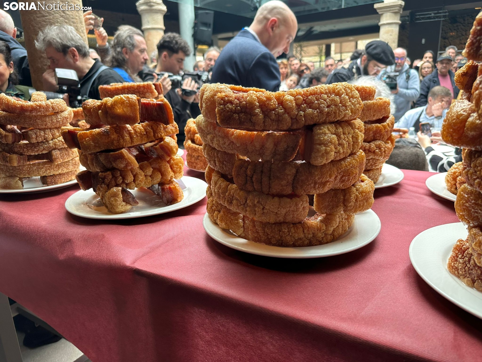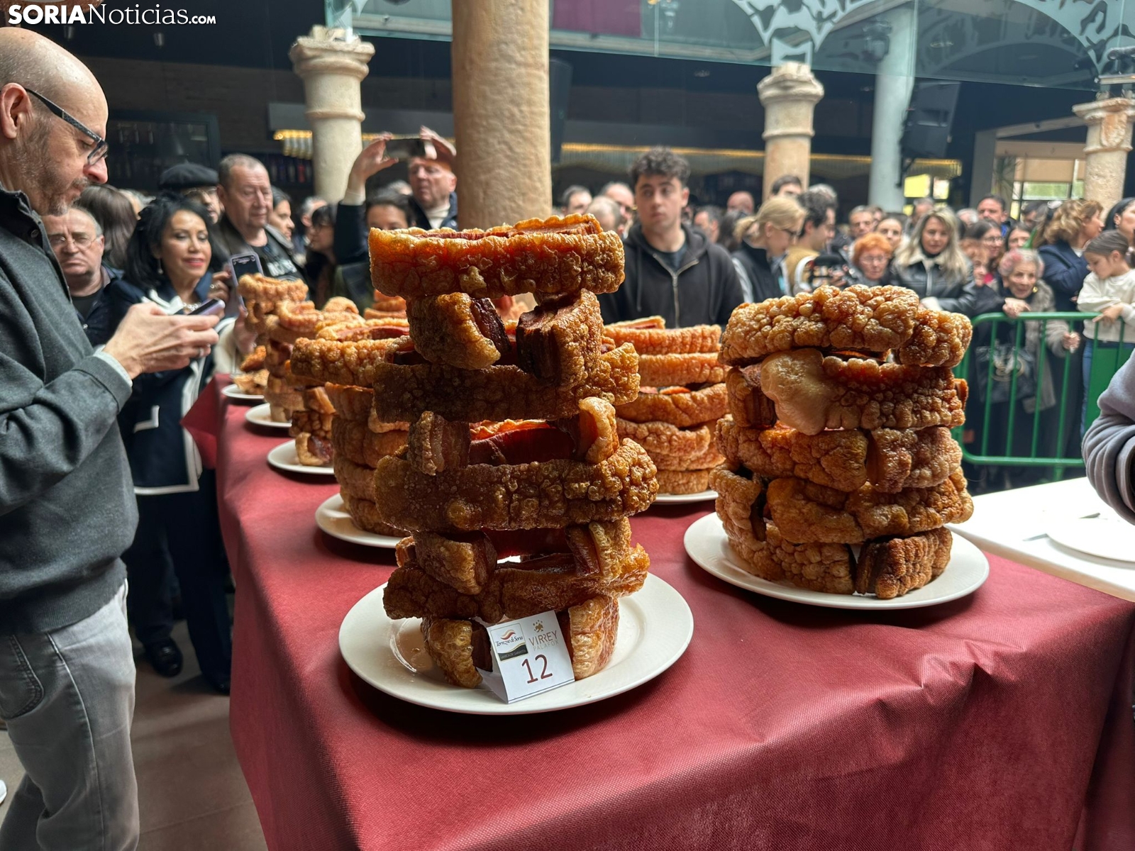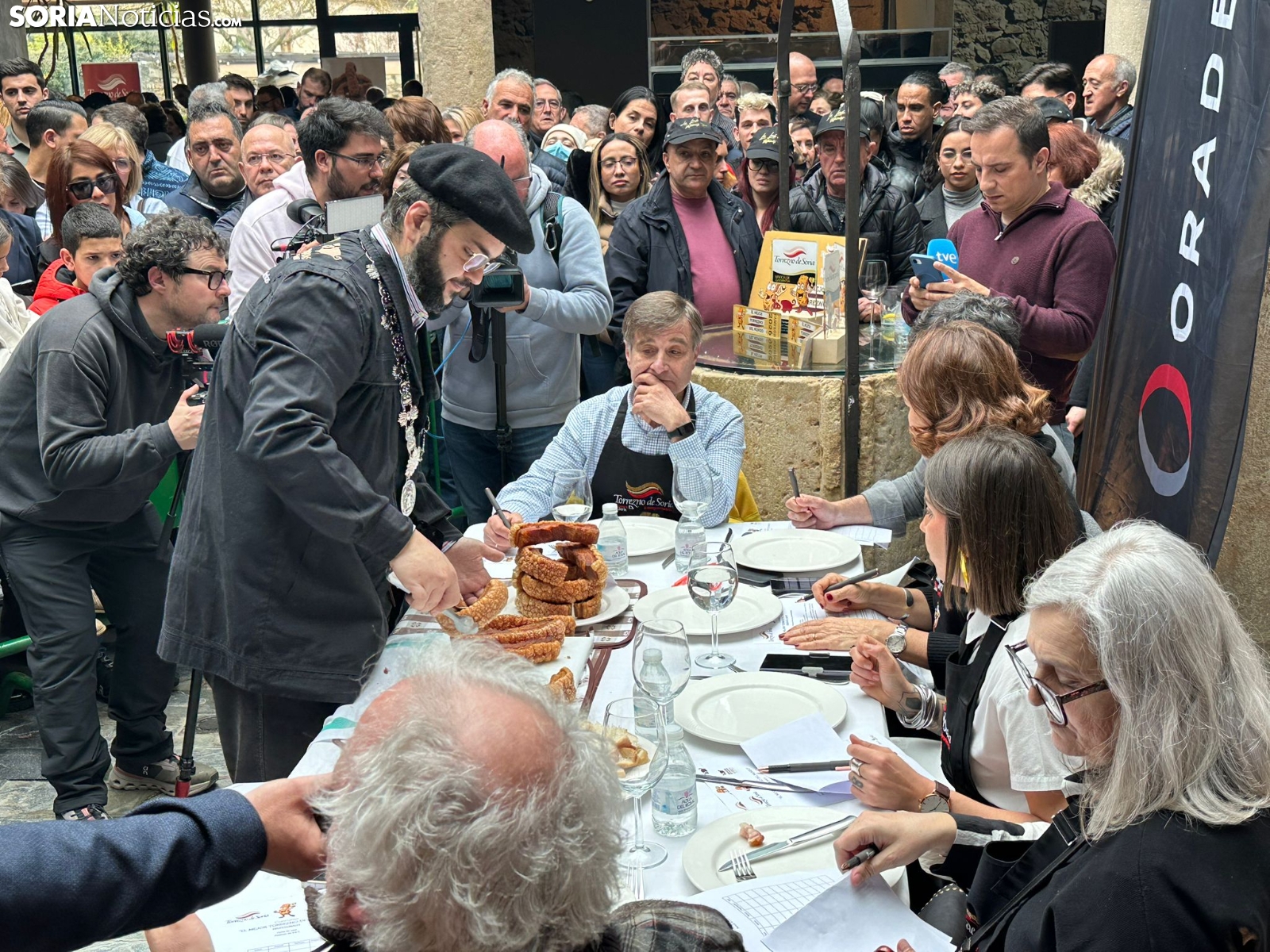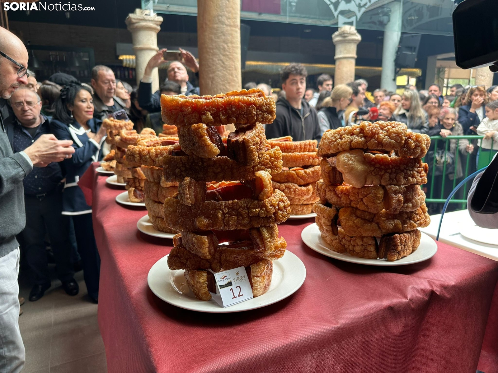 El Burgo de Osma se ha convertido durante la mañana de este domingo en el epicentro de la gastronomía al albergar la esperada final del concurso del Mejor Torrezno del Mundo. Tras una reñida demostración en directo y la posterior cata, el jurado, de mucha calidad, con Samantha Vallejo-Nágera, Óscar García, Mariano Tundidor, Irene Galindo, Nieves Caballero y Miguel Ayuso, ha dictaminado que la elaboración del Bar El Volante, ubicado en la localidad de Ólvega, merece el máximo galardón por presentar la pieza más equilibrada y crujiente.