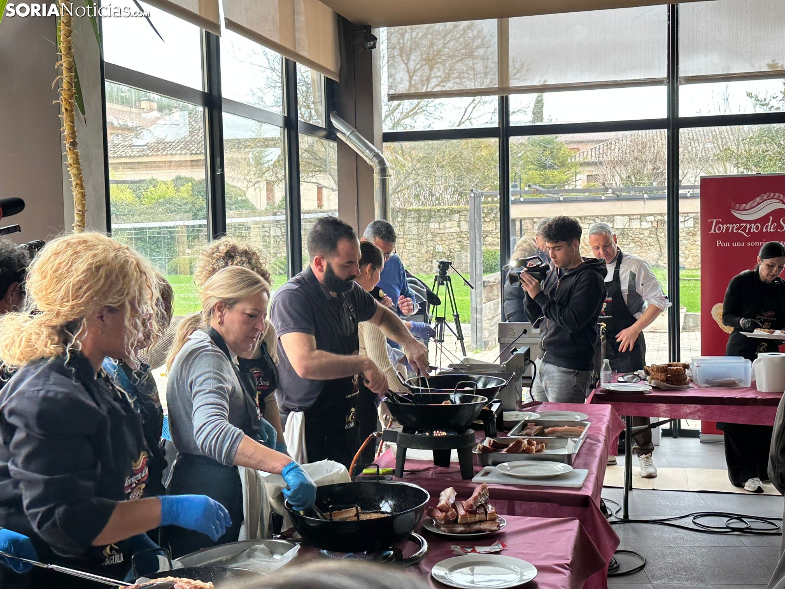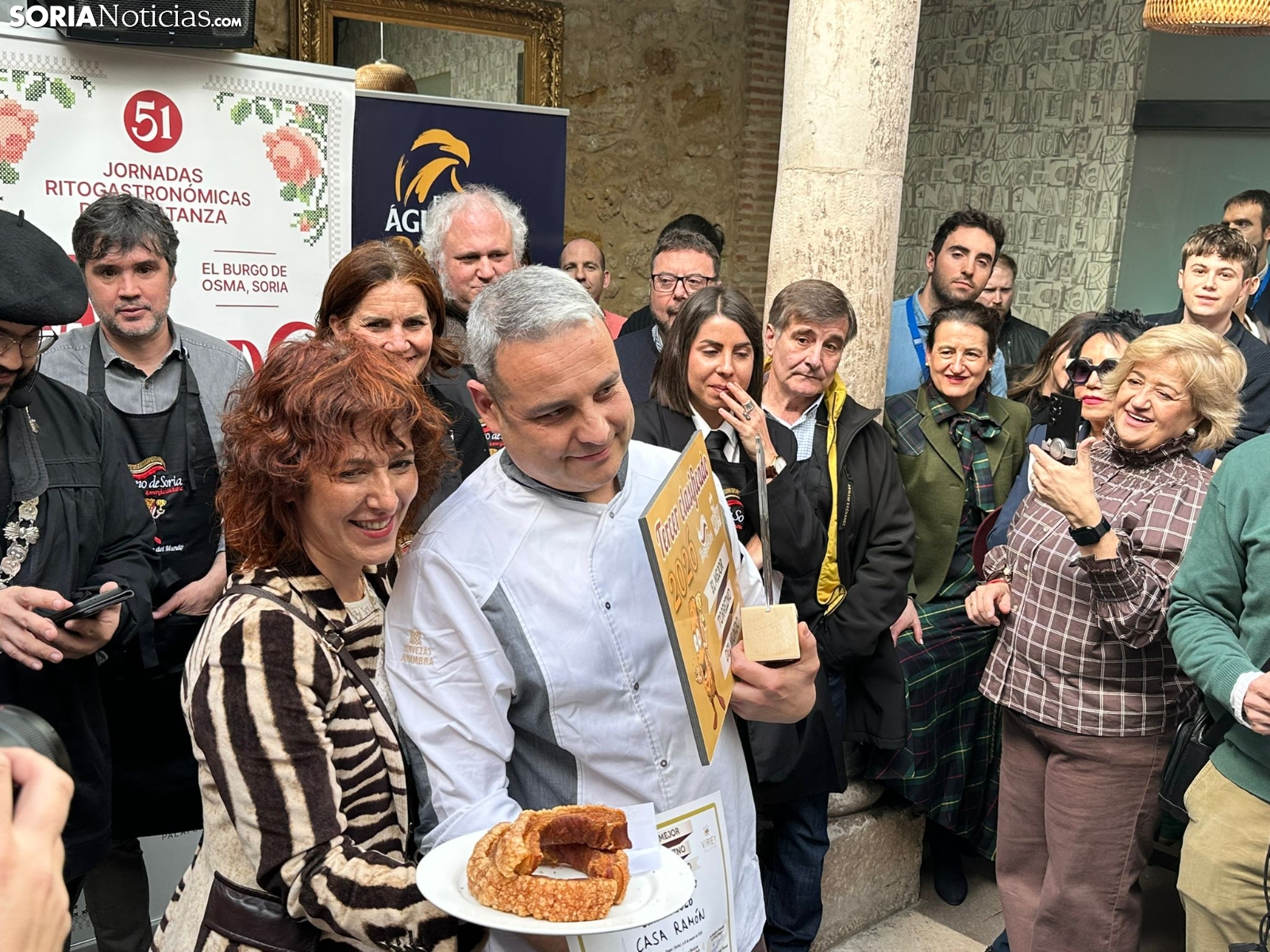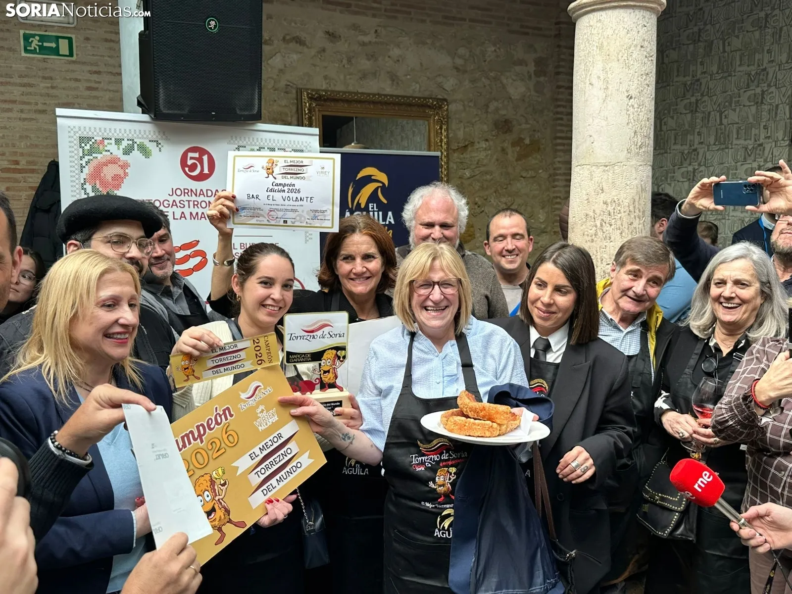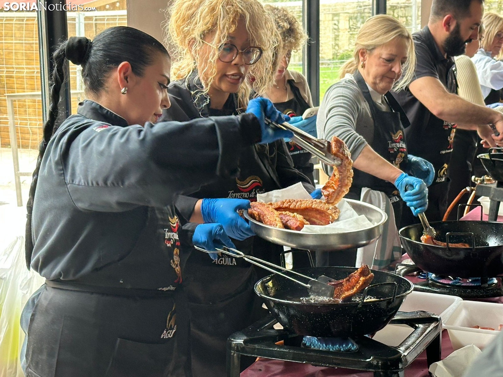 El Burgo de Osma se ha convertido durante la mañana de este domingo en el epicentro de la gastronomía al albergar la esperada final del concurso del Mejor Torrezno del Mundo. Tras una reñida demostración en directo y la posterior cata, el jurado, de mucha calidad, con Samantha Vallejo-Nágera, Óscar García, Mariano Tundidor, Irene Galindo, Nieves Caballero y Miguel Ayuso, ha dictaminado que la elaboración del Bar El Volante, ubicado en la localidad de Ólvega, merece el máximo galardón por presentar la pieza más equilibrada y crujiente.