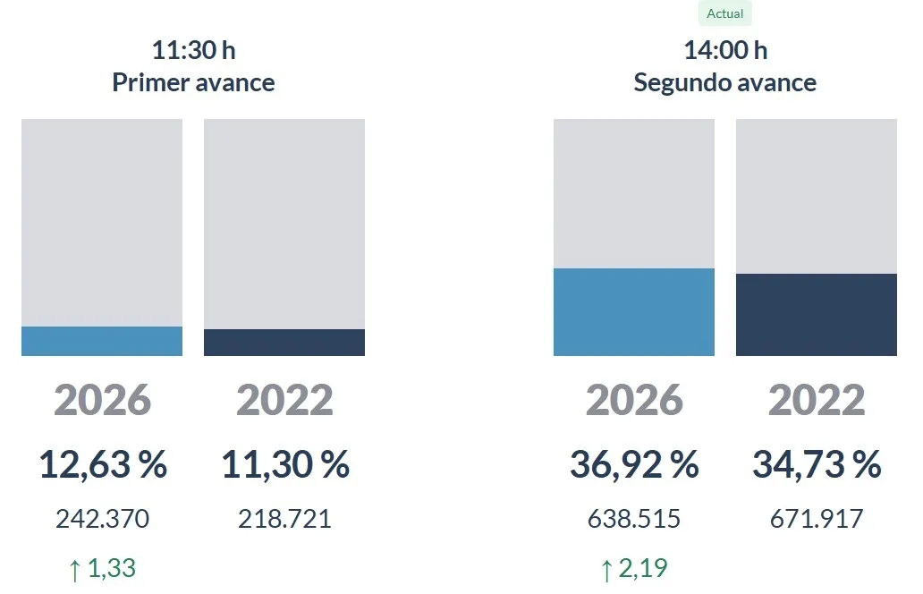 En el segundo sondeo de participación para la jornada electoral de este domingo 15 de marzo, la asistencia de cara a emitir el voto mantiene su tendencia al alza, sumando ahora un 2,2% por encima del registro de las dos de la tarde en 2022.