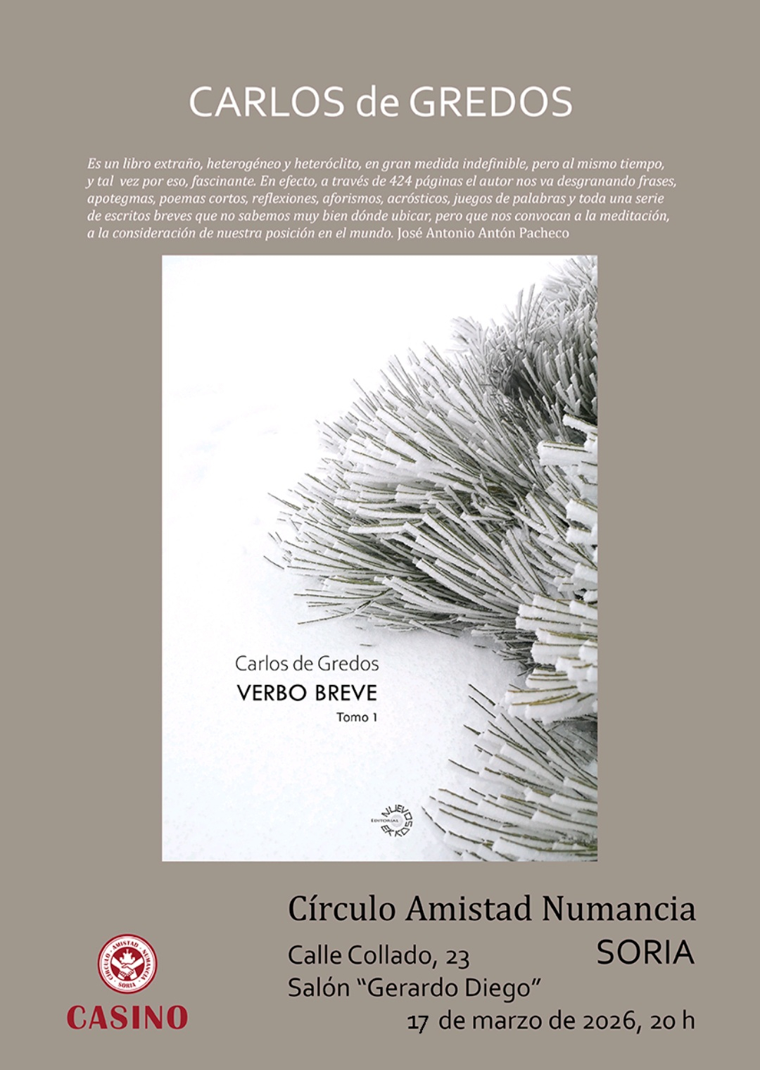 El próximo martes 17 de marzo, el autor Carlos de Gredos presenta su último libro 'Verbo Breve' en tierras sorianas.