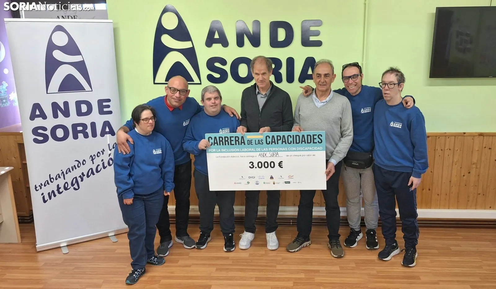 La sede de ANDE Soria ha acogido este martes la entrega de un cheque por valor de 3.000 euros emitido por la Fundación Adecco como reconocimiento a la labor que la agrupación lleva a cabo en favor de las personas con discapacidad intelectual.